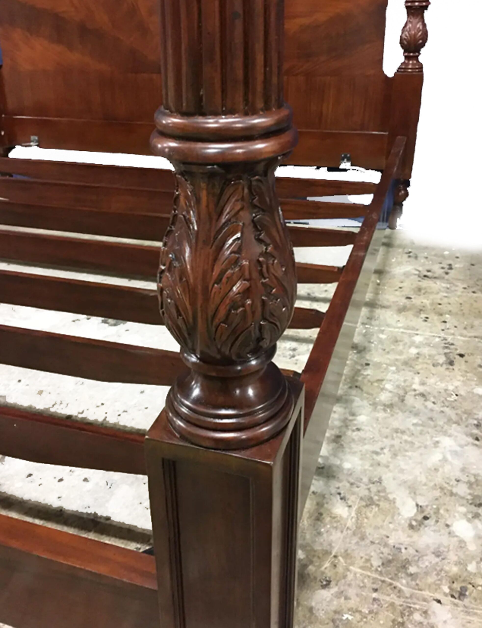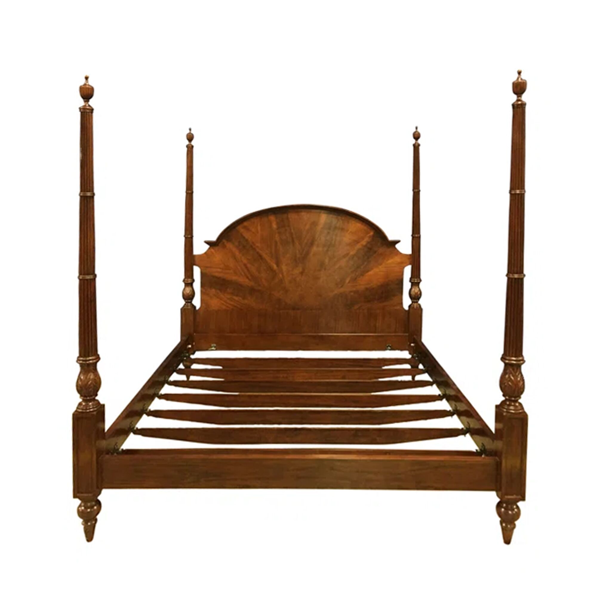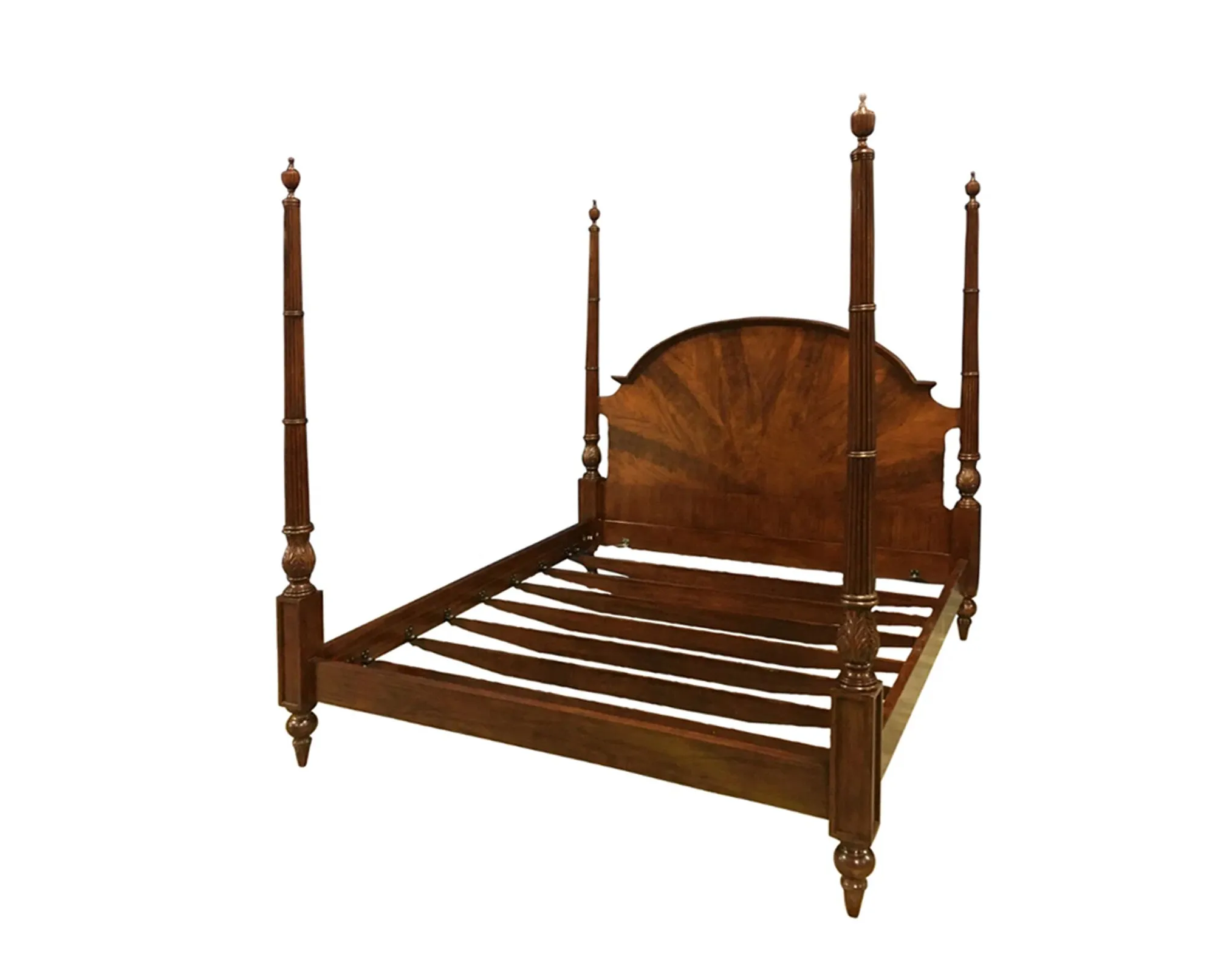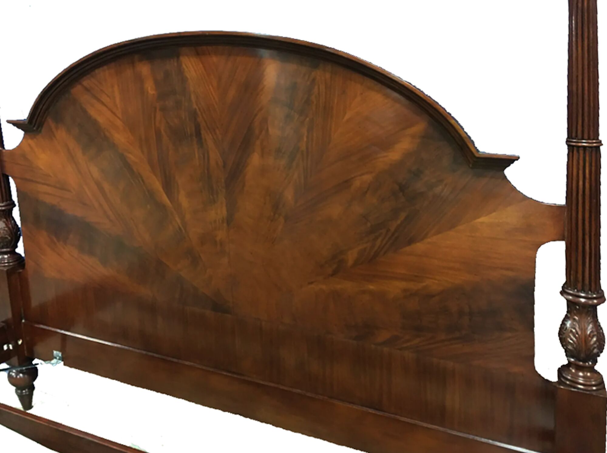 Traditional mahogany four-poster bedframe available in both king and queen sizes. Ached top, trim molding and suburst inlaid flame mahogany headbaord and four posters, Sheraton style pencil legs.