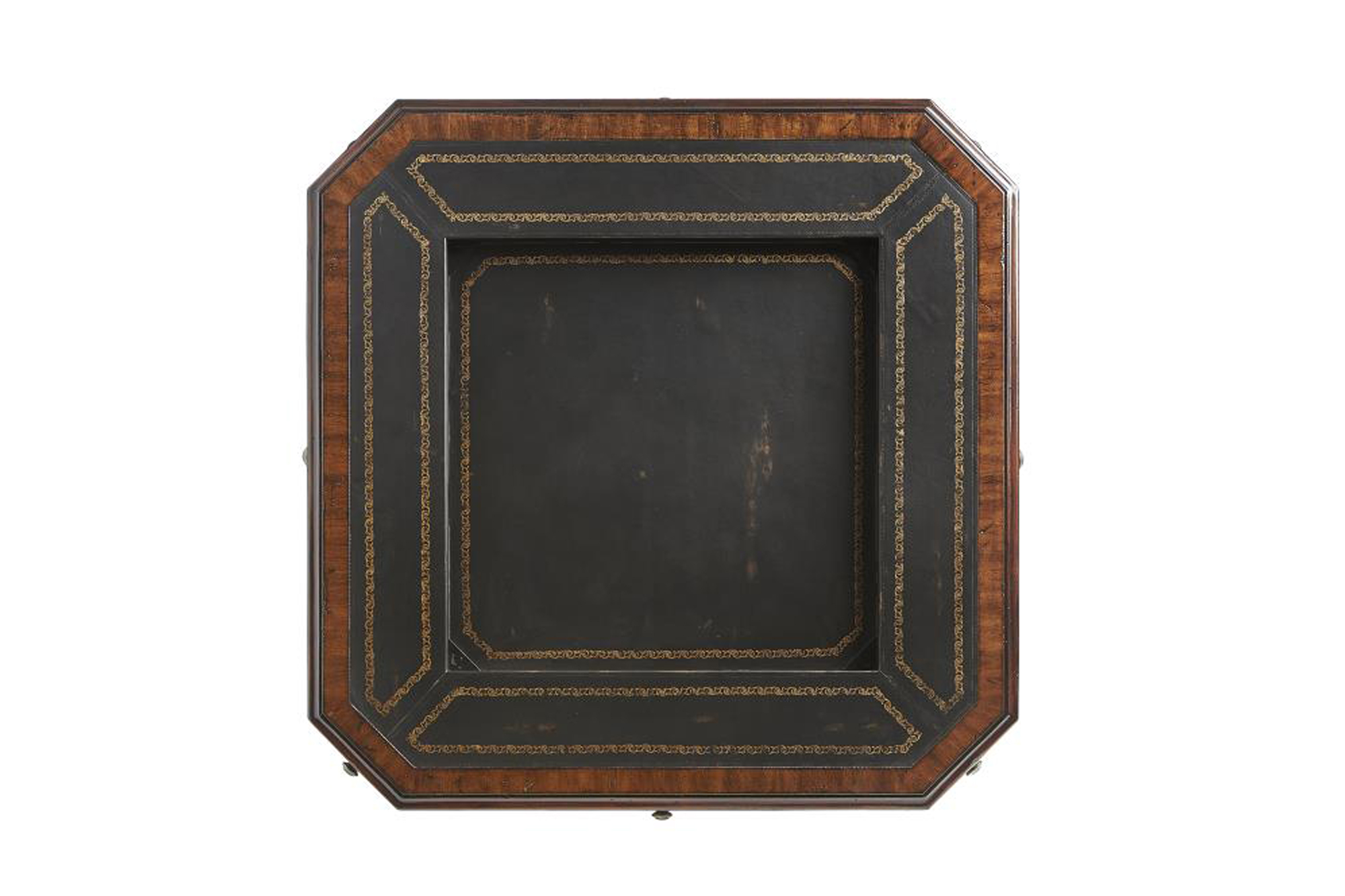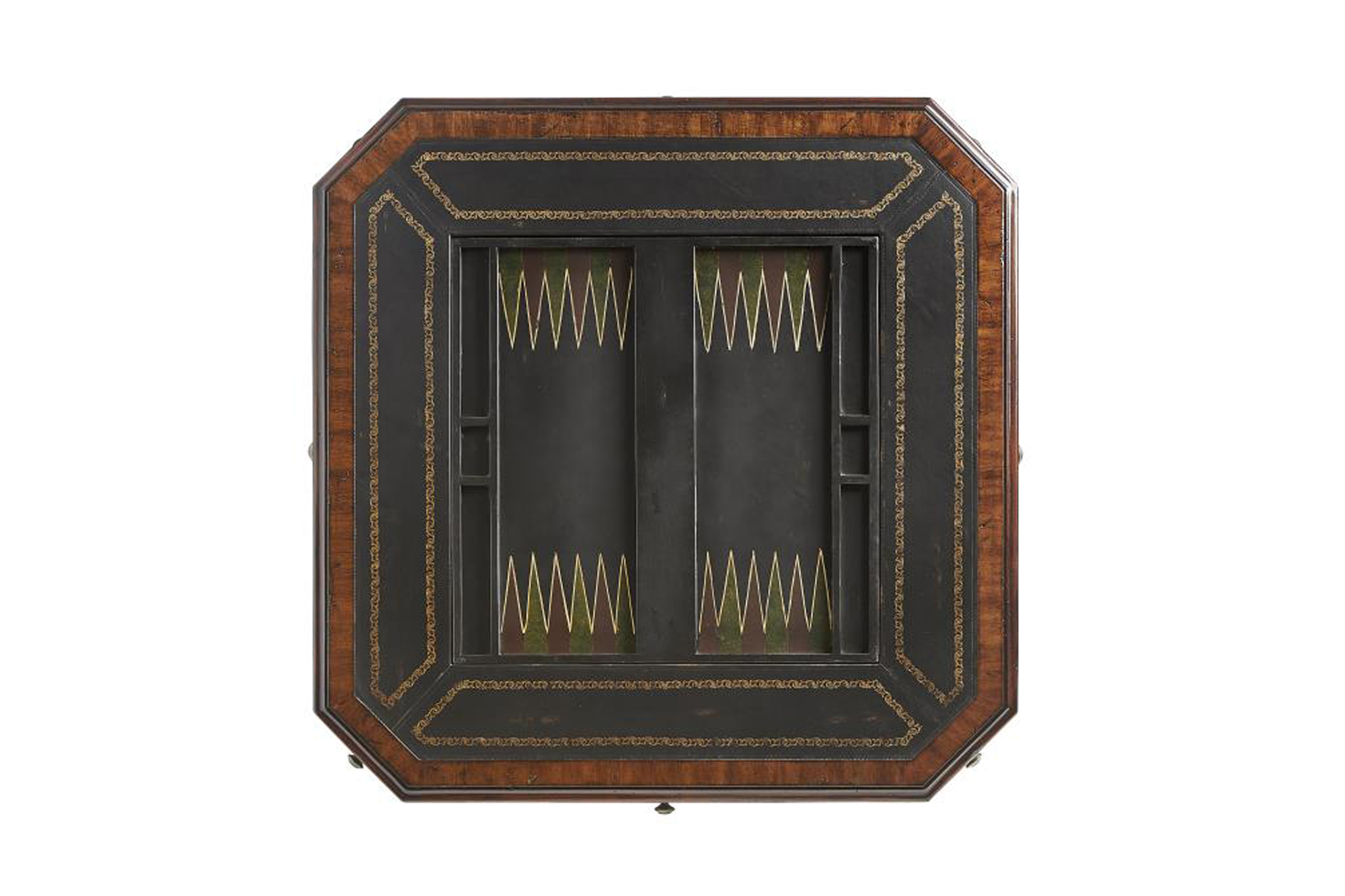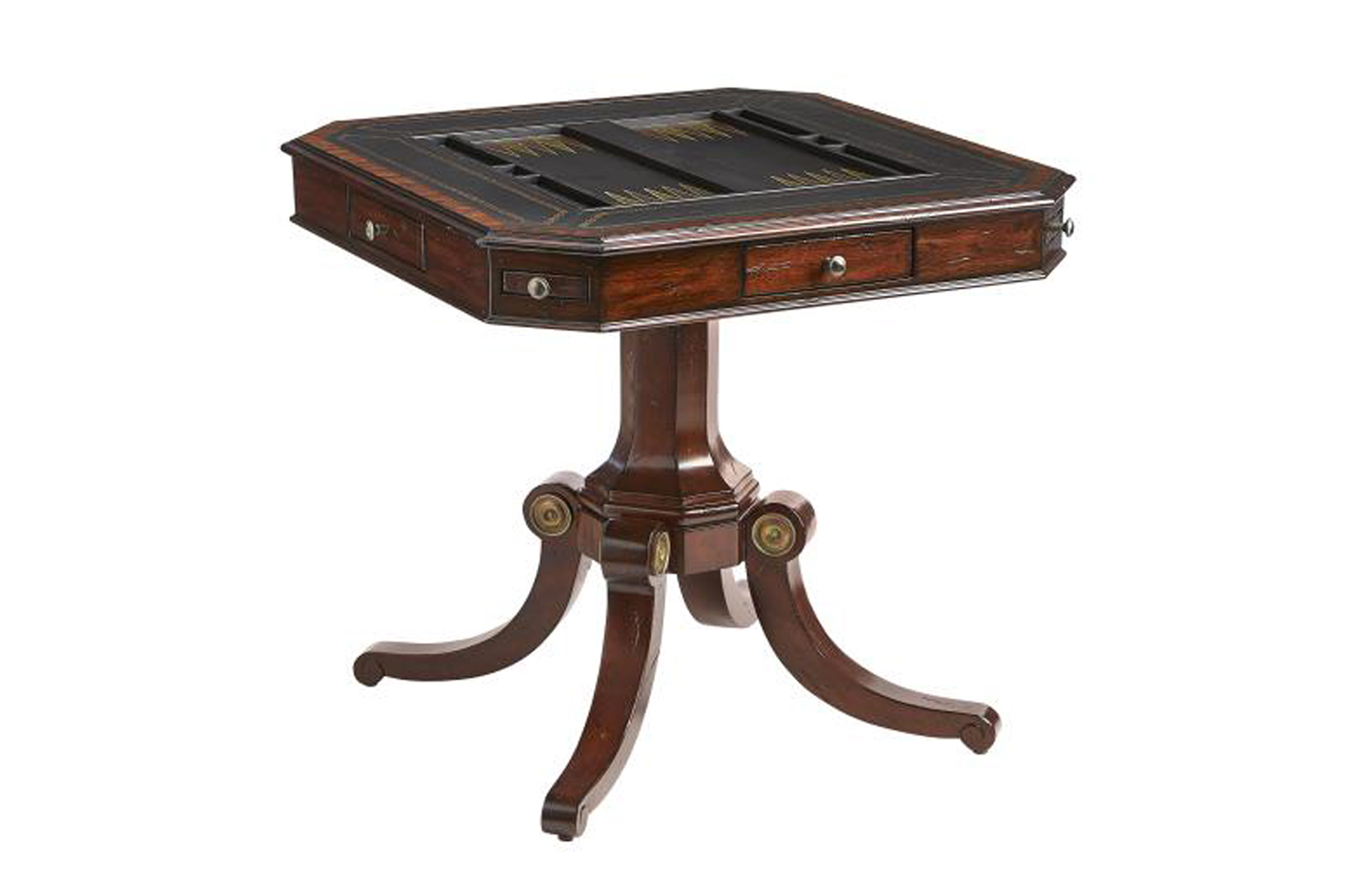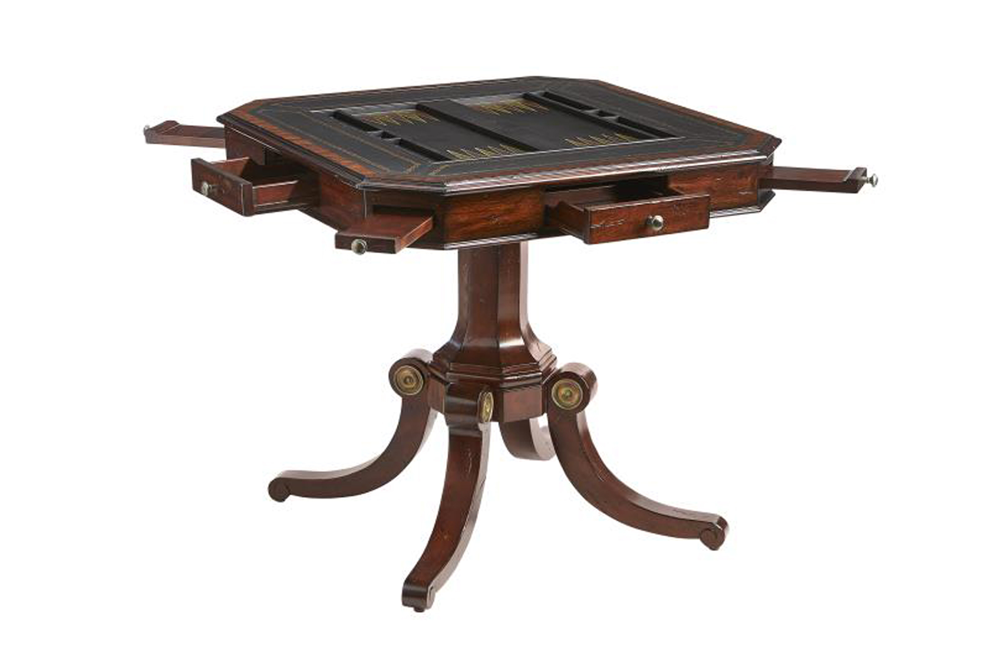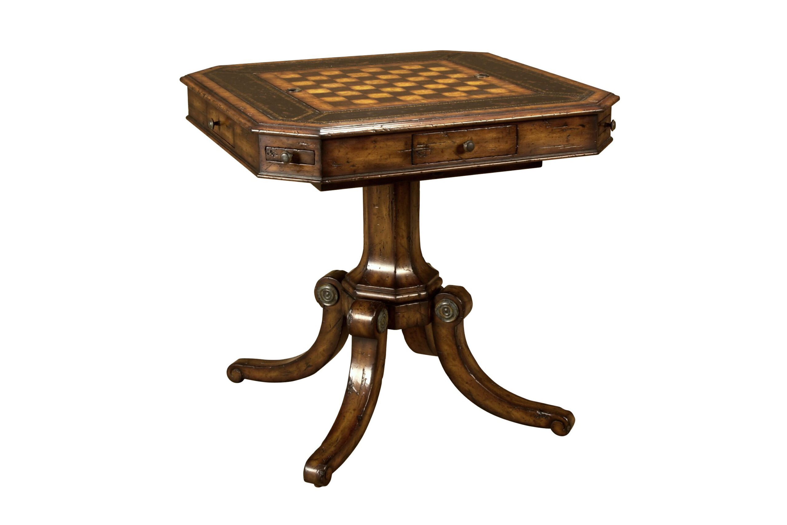 Game table by Maitland Smith Furniture. Quality mahogany wood chess/checkers and backgammon table with black leather top. There is one drawer on each side, as well as pull-out corner slides, with tarnished brass accents.