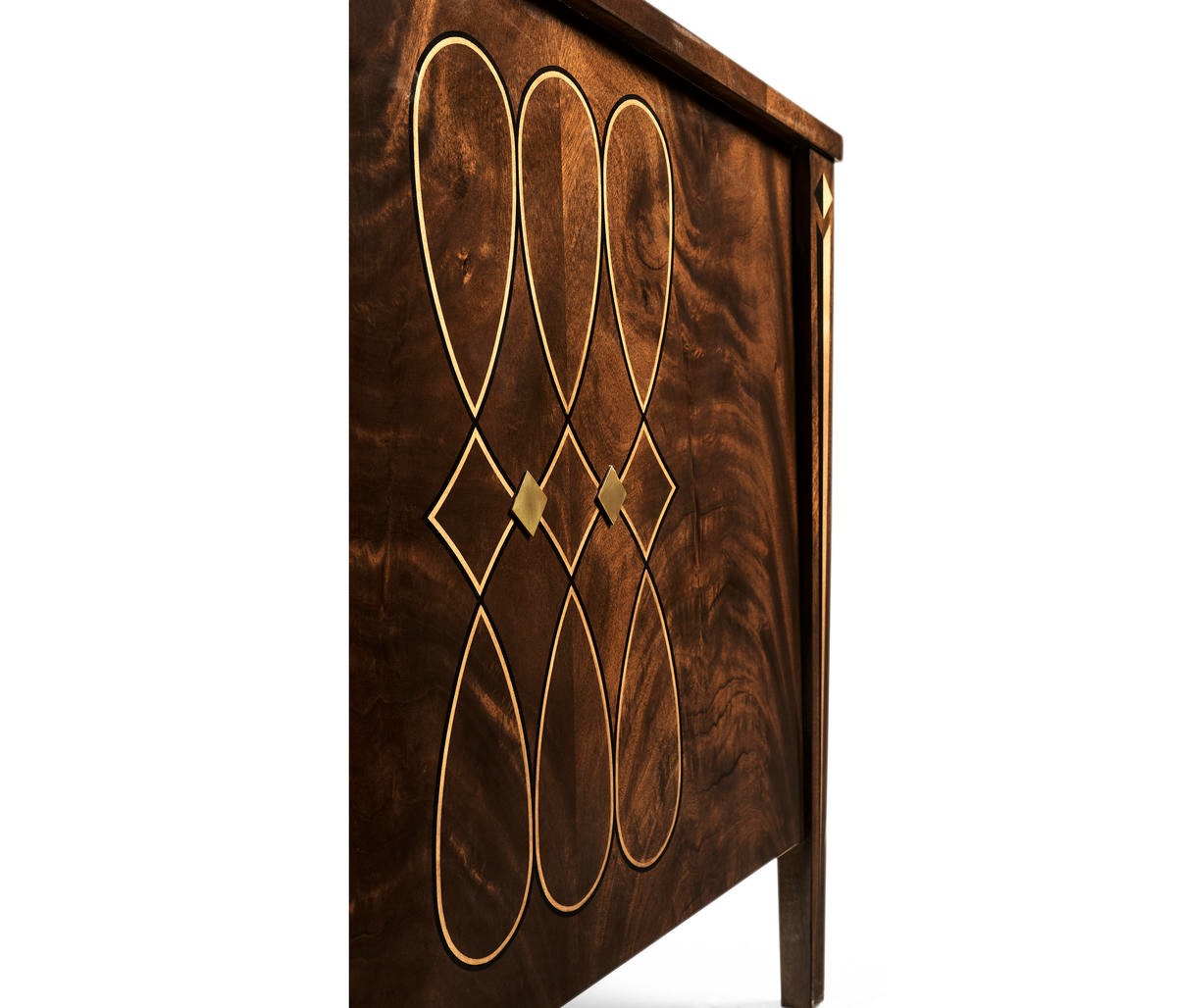 Black Leather Upholstery, Geometric Inlay Panels, and Curved Form