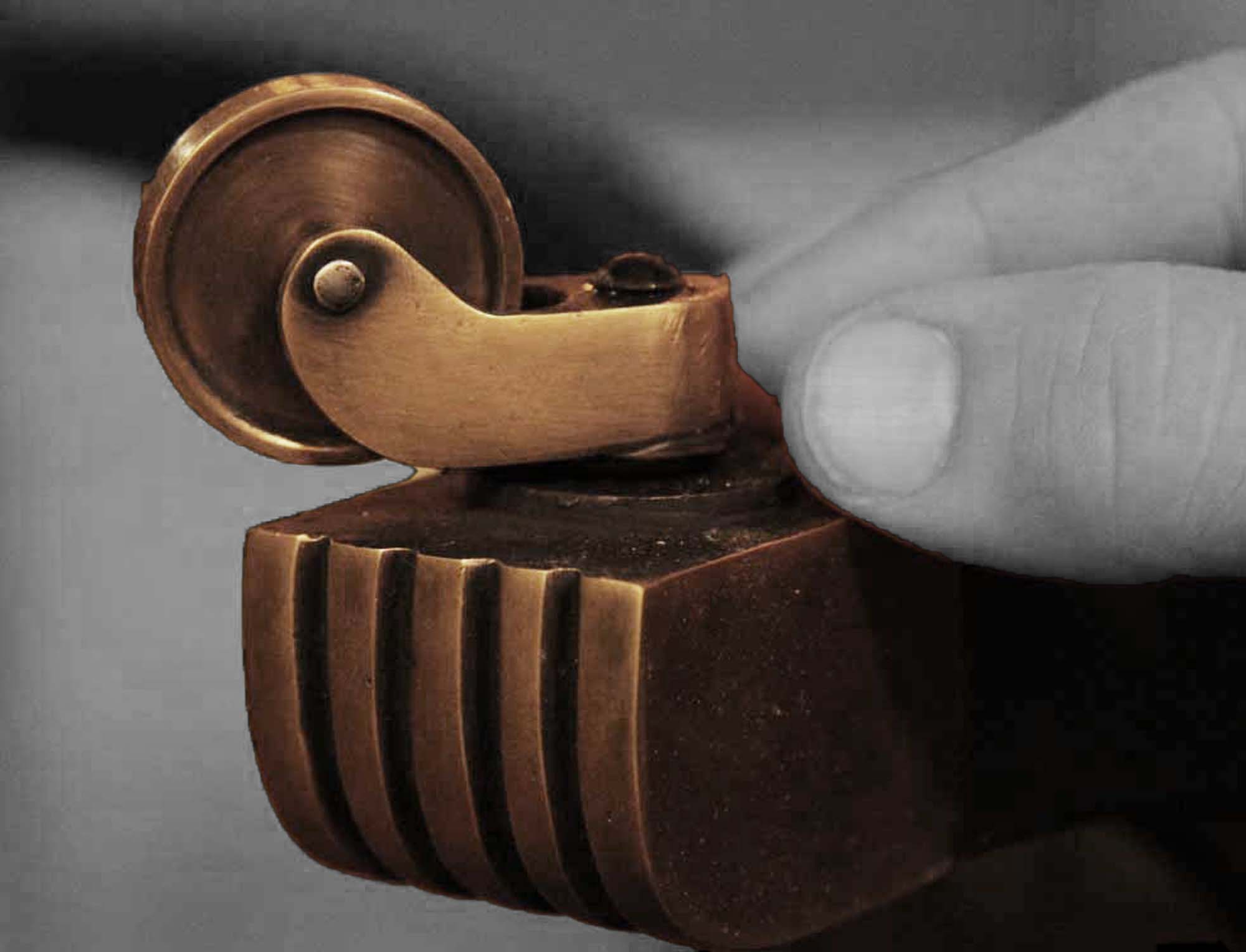 Mahogany finished crotch mahogany veneer dining table, crossbanding top, brass mounts.