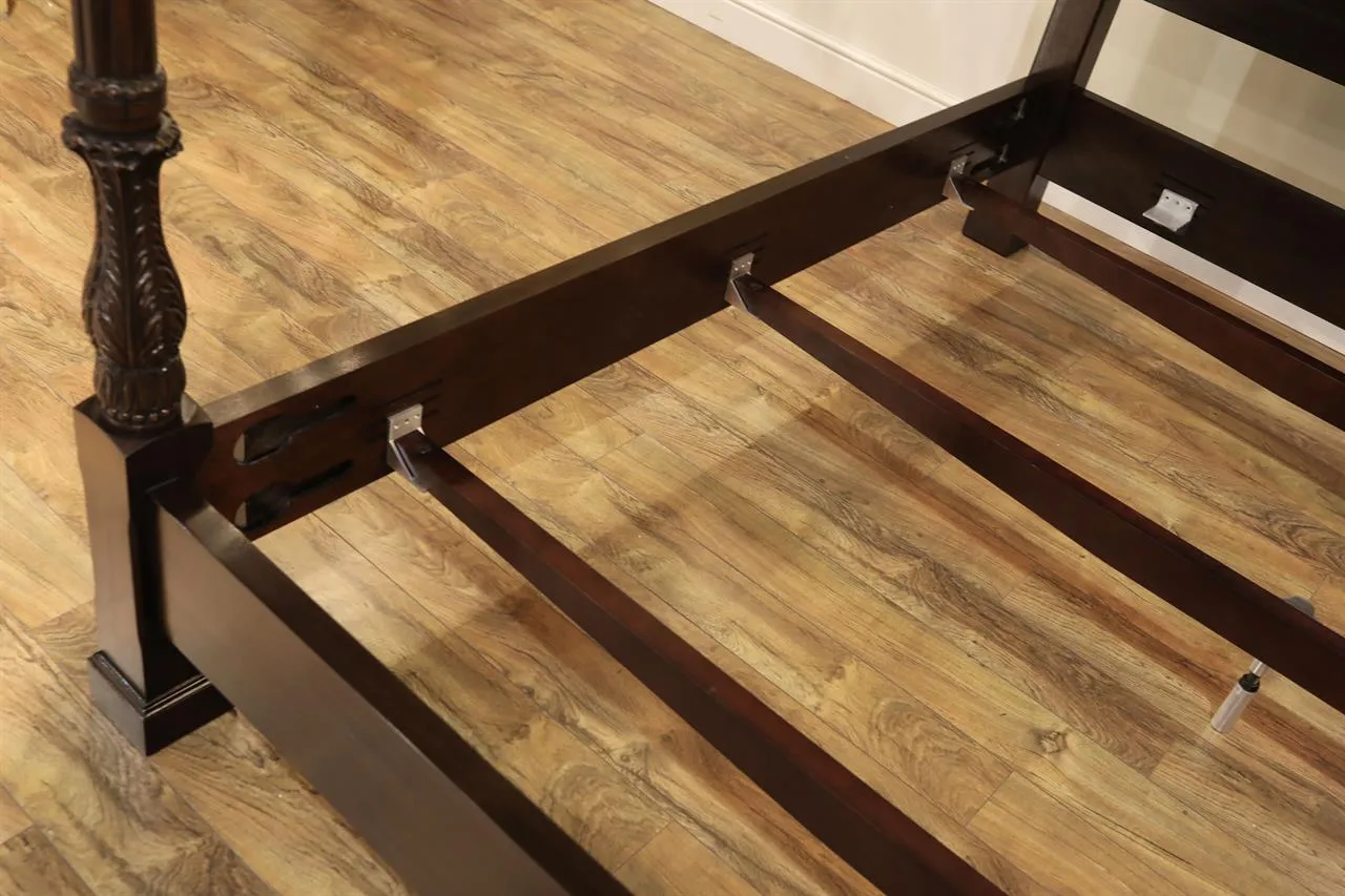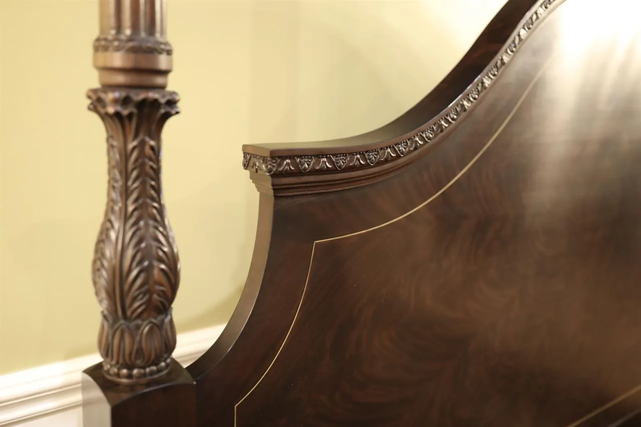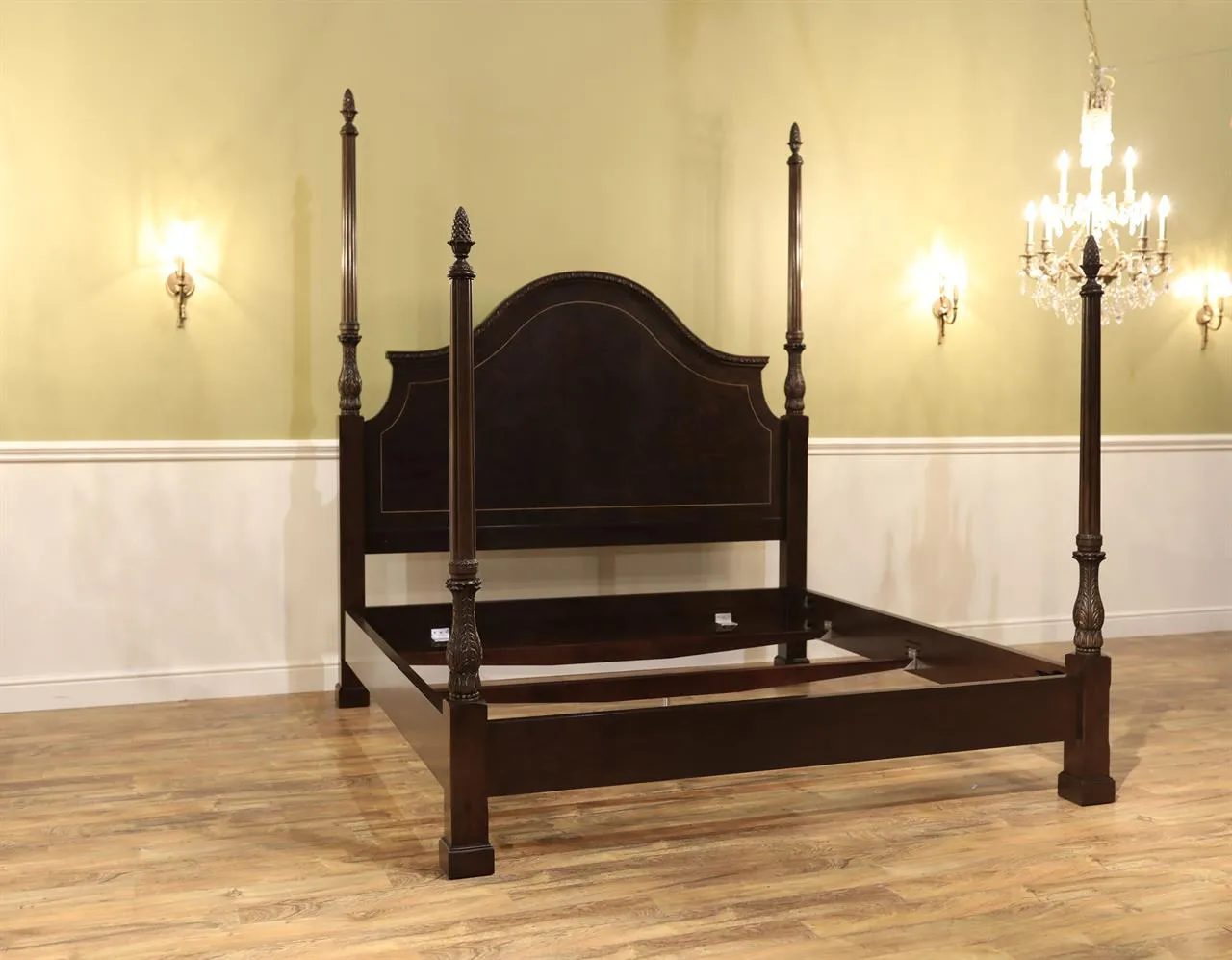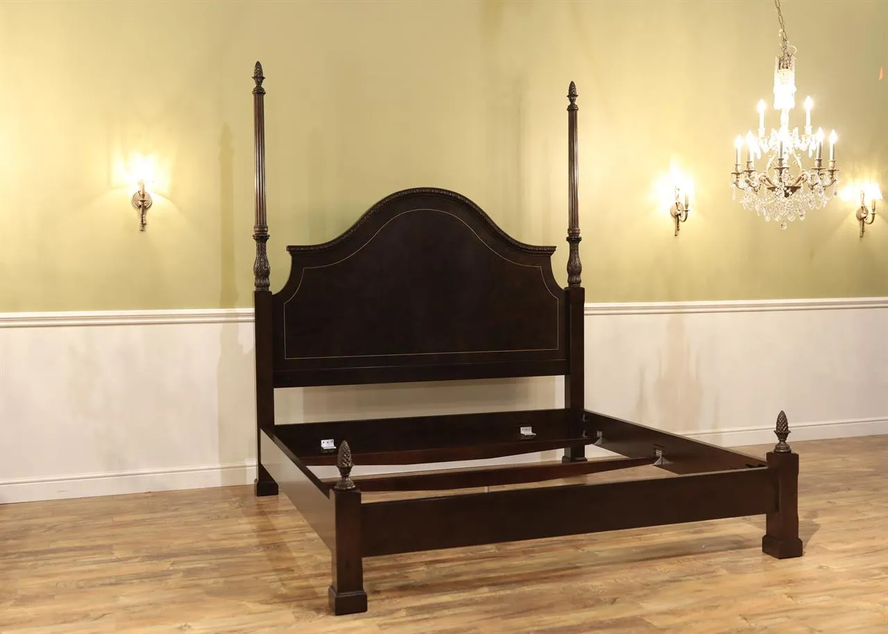 Four-poster king bed, dark wood king bed with pinstripe inlay, adjustable posters, and adjustable box spring height. This is a quality designer-grade antique reproduction king-size poster bed. It is a very heavy and sturdy bed frame. The side rails lock into the headboard and footboard with significant hardware. The center of the bed has a stainless steel adjustable support leg. The posters at the footboard were designed to offer the homeowner different height options, it can be finished with full height posters, short posters. hand-carved pineapple finials or simple brass caps. Aesthetically, this bed was designed for gold accents but the gold accents remain optional. The hand-carved architectural trim along the headboard, the acanthus leaf-carved posters, and pineapple finials were all designed to accept gold accents. In some of the pictures, you’ll notice some gold accents but by default, we ship this bed with no gold accents. Measurements: 83″Wx88″Dx90″H