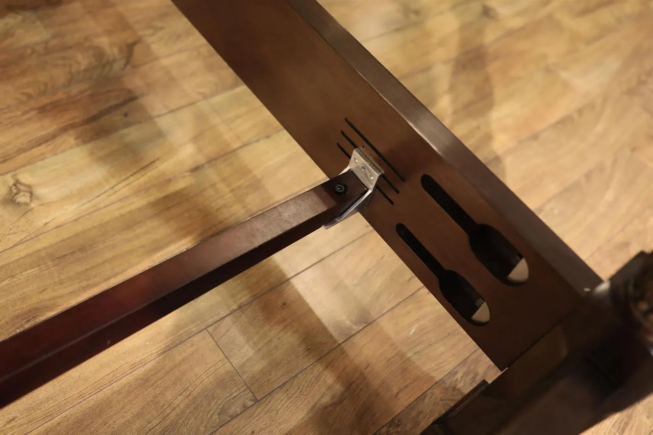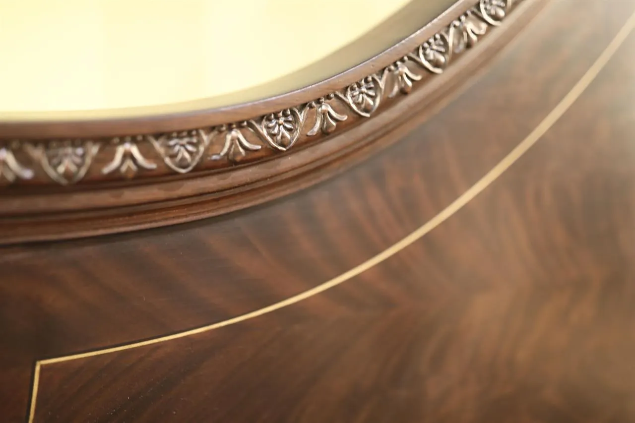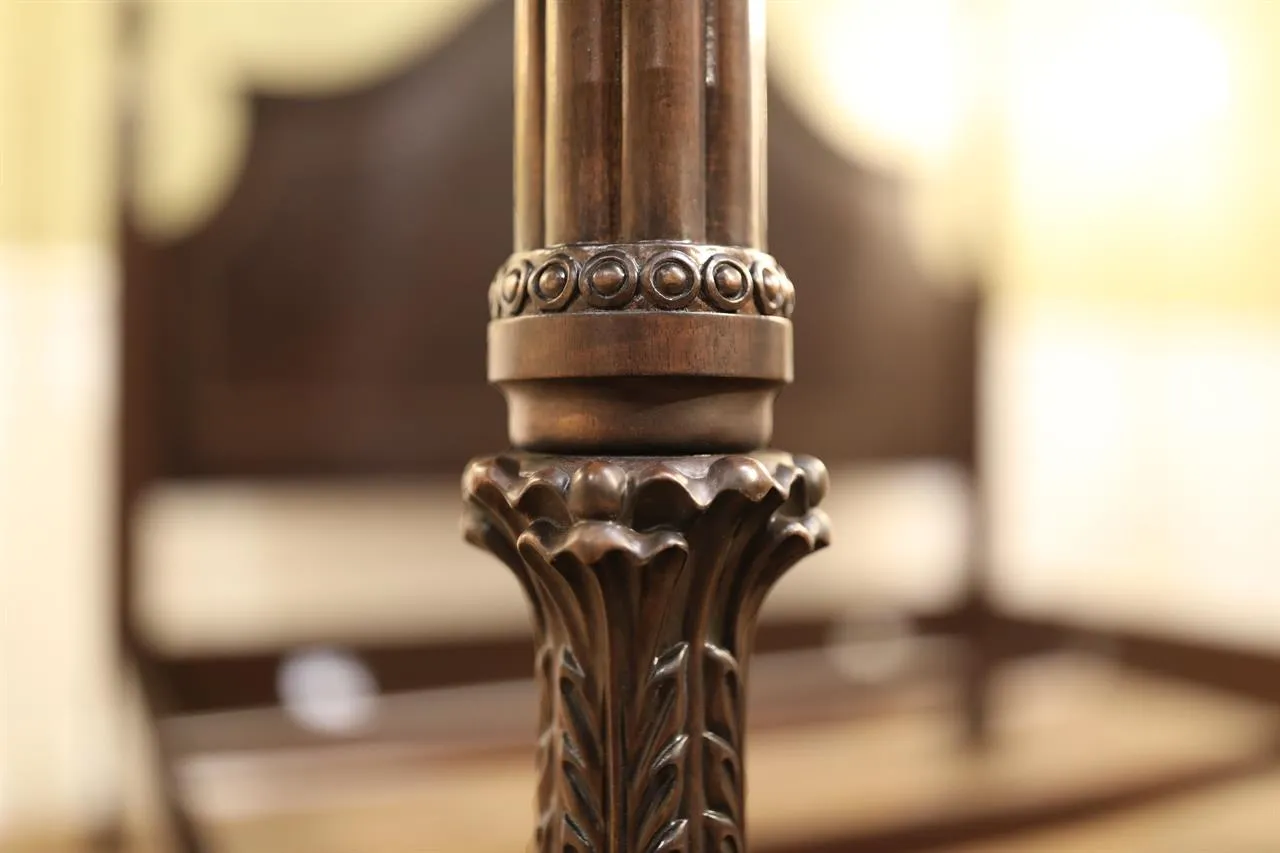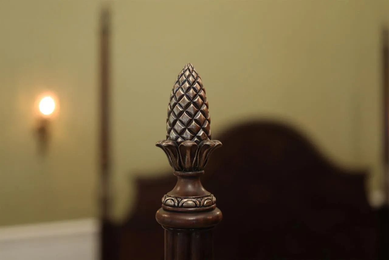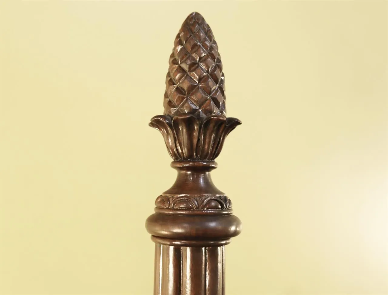 Four-poster king bed, dark wood king bed with pinstripe inlay, adjustable posters, and adjustable box spring height. This is a quality designer-grade antique reproduction king-size poster bed. It is a very heavy and sturdy bed frame. The side rails lock into the headboard and footboard with significant hardware. The center of the bed has a stainless steel adjustable support leg. The posters at the footboard were designed to offer the homeowner different height options, it can be finished with full height posters, short posters. hand-carved pineapple finials or simple brass caps. Aesthetically, this bed was designed for gold accents but the gold accents remain optional. The hand-carved architectural trim along the headboard, the acanthus leaf-carved posters, and pineapple finials were all designed to accept gold accents. In some of the pictures, you’ll notice some gold accents but by default, we ship this bed with no gold accents. Measurements: 83″Wx88″Dx90″H