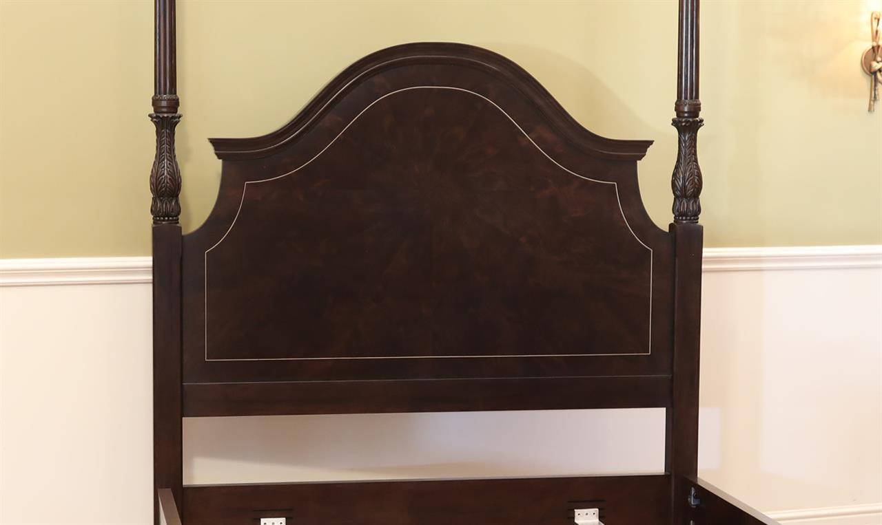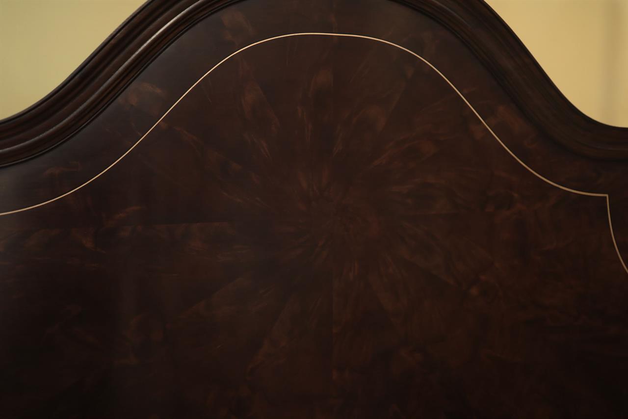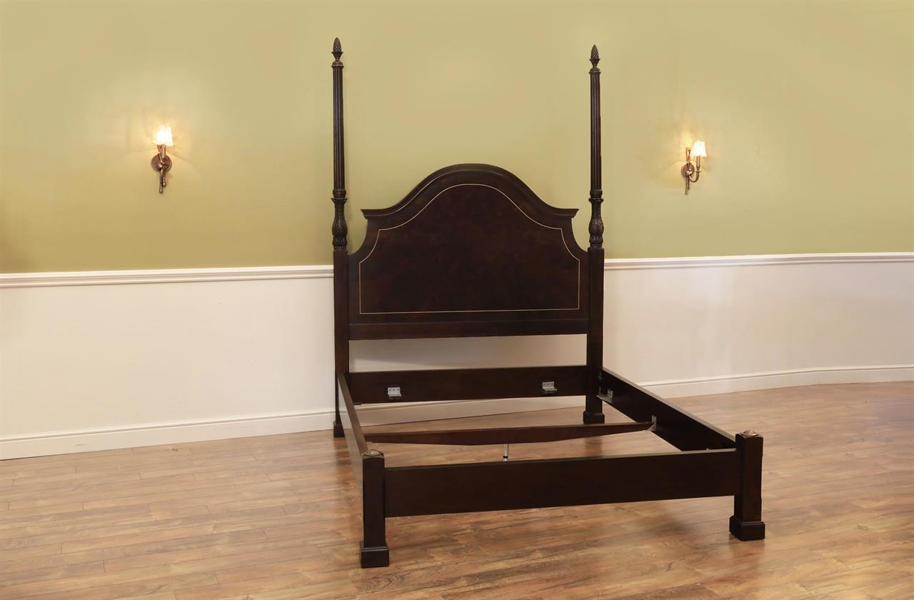 Mahogany queen poster bed. A heavy and significant mahogany queen-size poster bed in a rich dark- brown walnut finish, an AP Exclusive by AntiquePurveyor. A traditional two-poster bed with a pie-cut flame mahogany headboard finished with architectural trimmed edges. The box spring height is adjustable. It has super-sized hardware and overbuilt construction so when the bed comes together in a home, it is rock solid. The overall weight and construction of this bed are second to none. The headboard is about an inch thick as is the side rails and footboard. This is a designer-grade guestroom bed or master bed for those who want exceptionally good quality and have limited space. Keep in mind, we also offer extra posters so if you want to make this a four-poster bedframe we can do that for an additional charge, but it comes standard with 2 posters. Also, the bed can also be accented with gold around the carvings and the pineapples, and we can help with that as well.