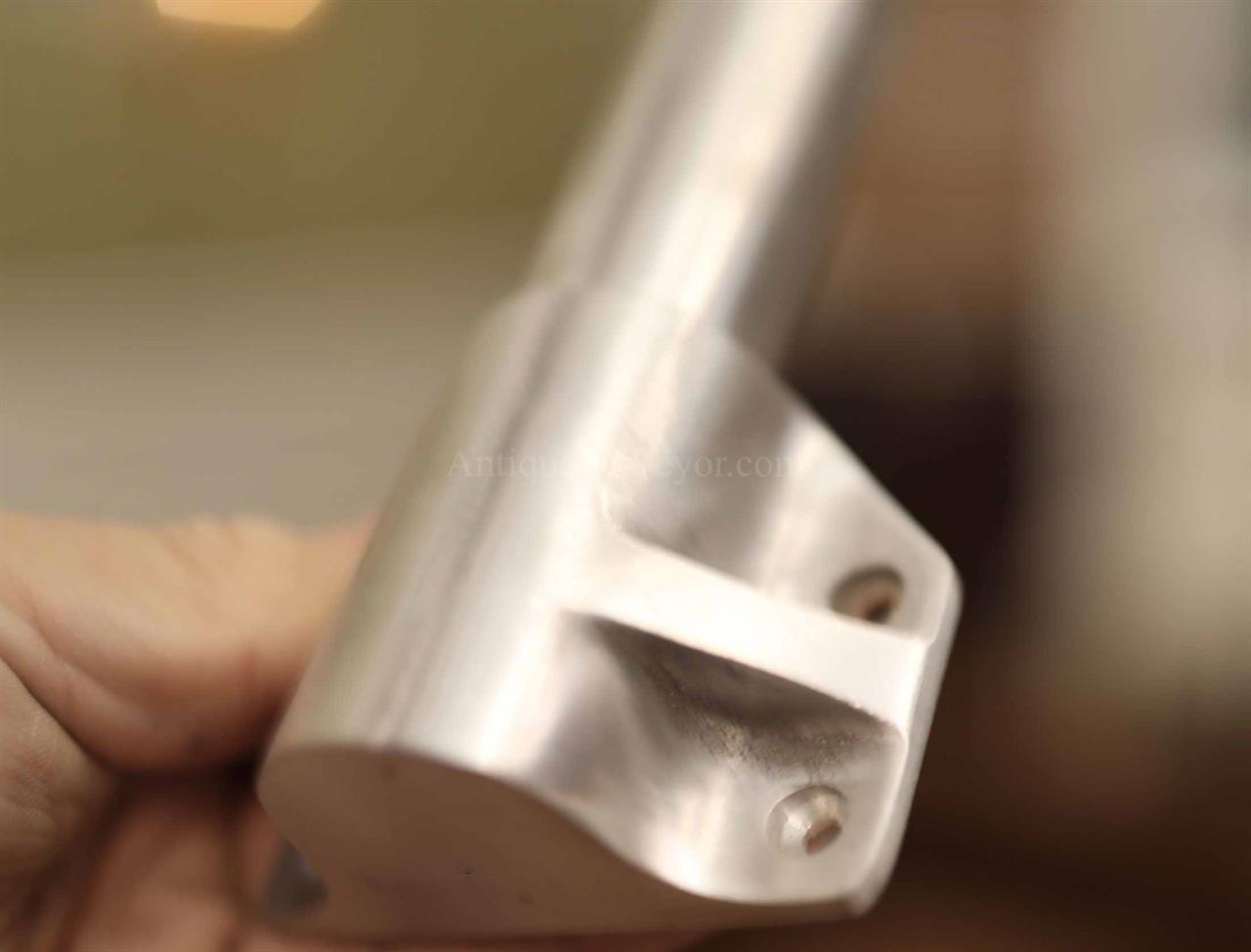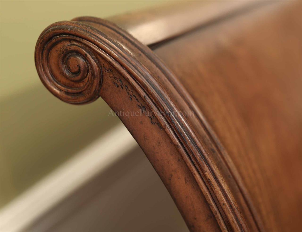 King size windsor sleigh bed. Very heavy and desne, higher-end bed frame fit for a stately home. Grooved siderails allows you to set box spring at different heights. This bed is very heavy, the headboard and the footboard are made from custom 2″ molded plywood. The bed also comes with adjustable center leg for support, which will also accomodate different mattress heights. Fantastic quality no-nonsense bed frame. Queen bed size also available by custom order