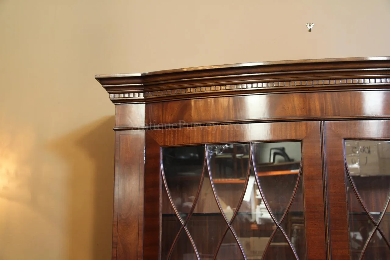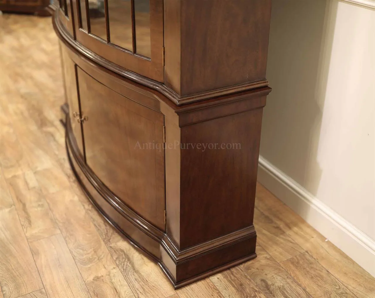 This mahogany bowfront china cabinet features flame mahogany door panels and individually paneled windows. It is a robust and heavy piece designed as a new antique reproduction, manufactured to English standards. The bottom two doors are curved to match the bowfront design, and the lower section includes a shelf. The cabinet has glass shelves that are adjustable and supported by padded brass pins, allowing light to pass through with minimal obstruction. The crown includes simple dental molding, and the cabinet stands on a plinth-style base. Measurements: Height: 88 in., Width: 67 in., Depth: 17 in.