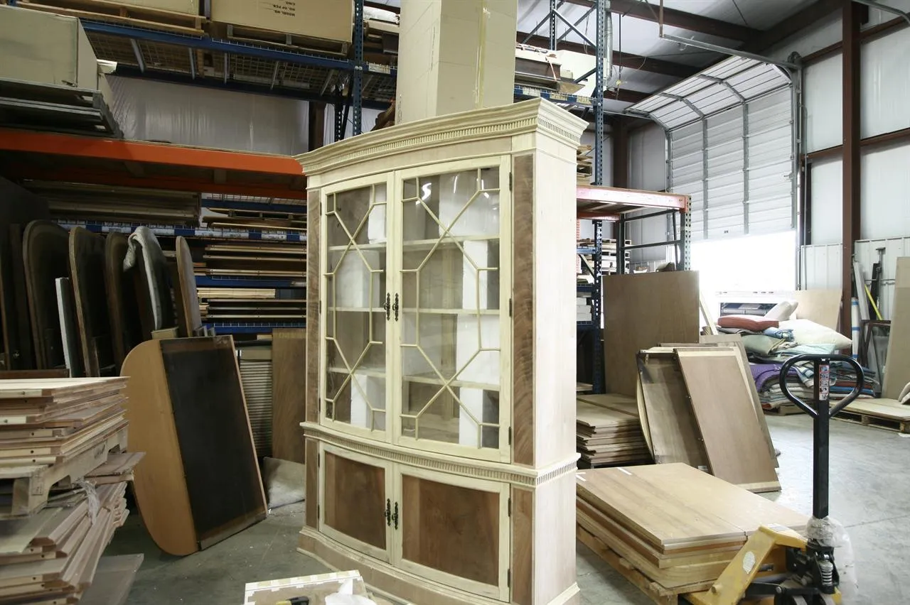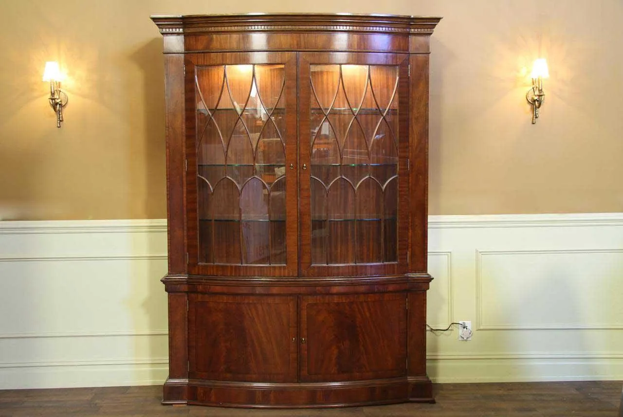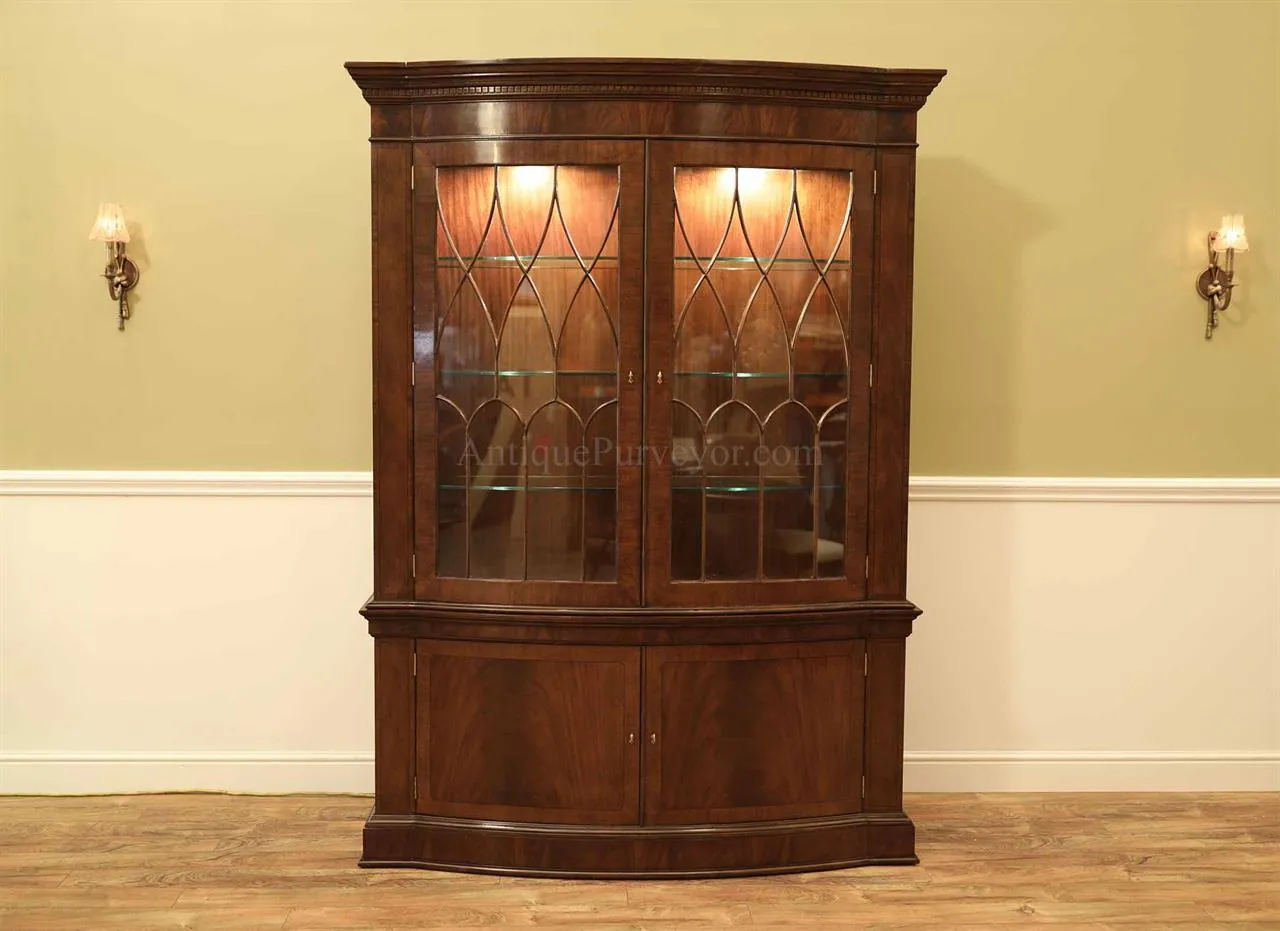 Home » Dining Room » Mahogany Bow-Front China Cabinet – Paneled Glass & Lighted Display