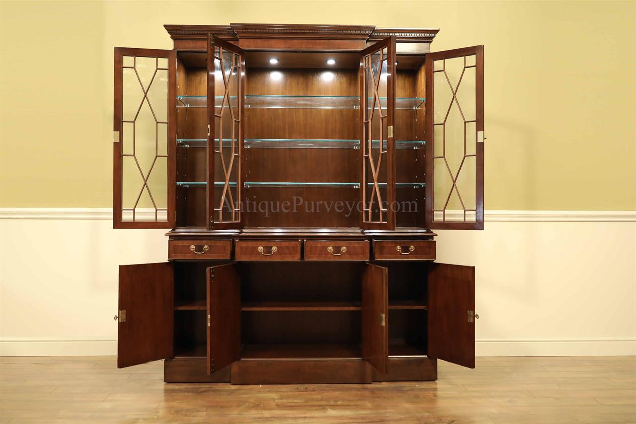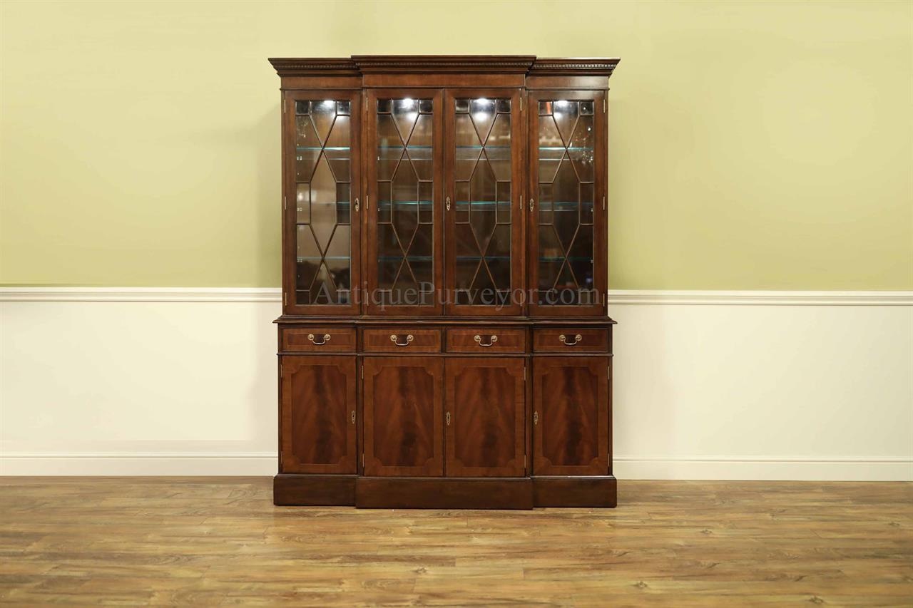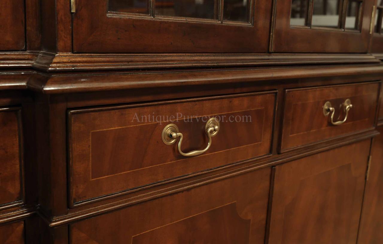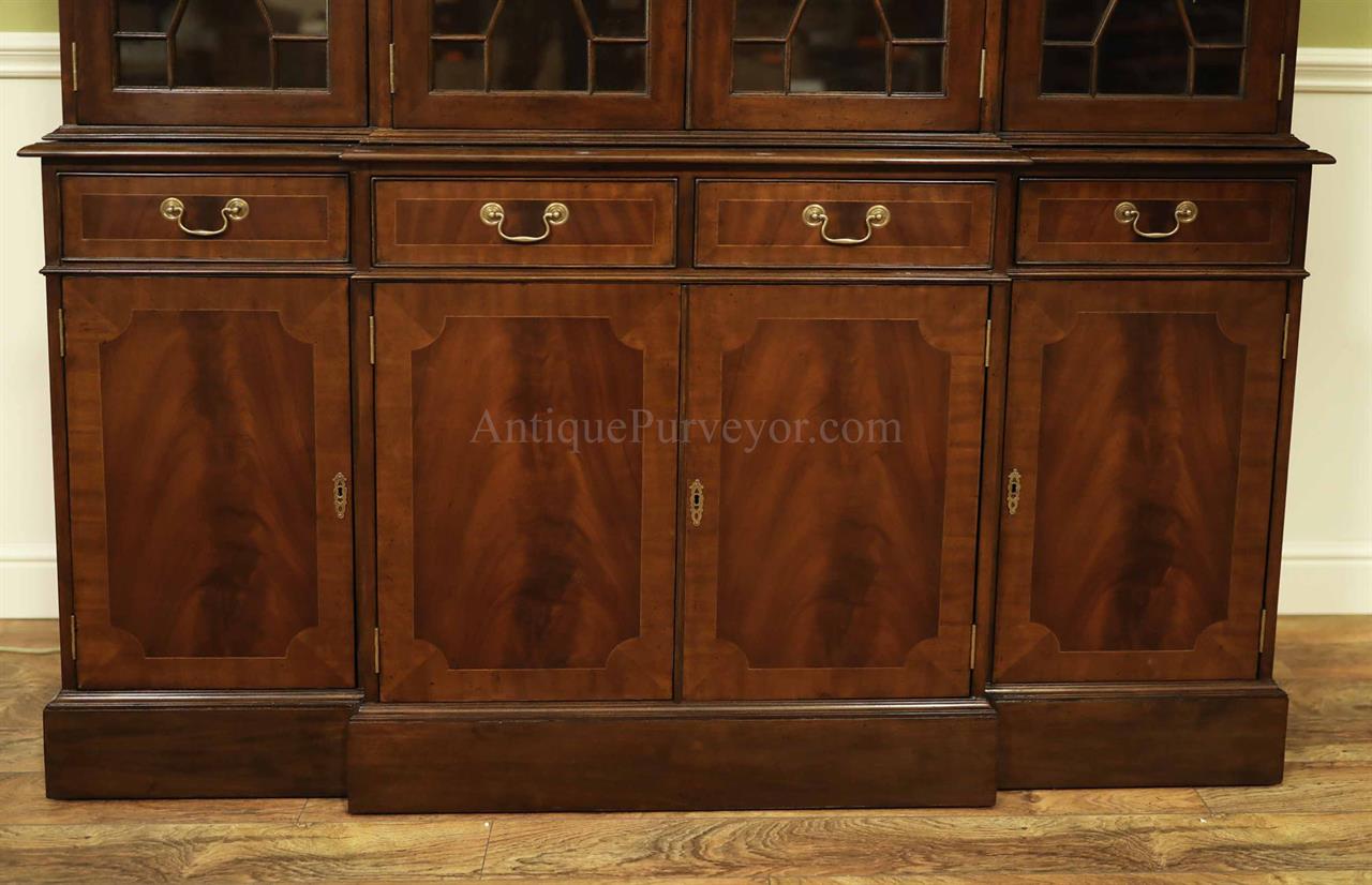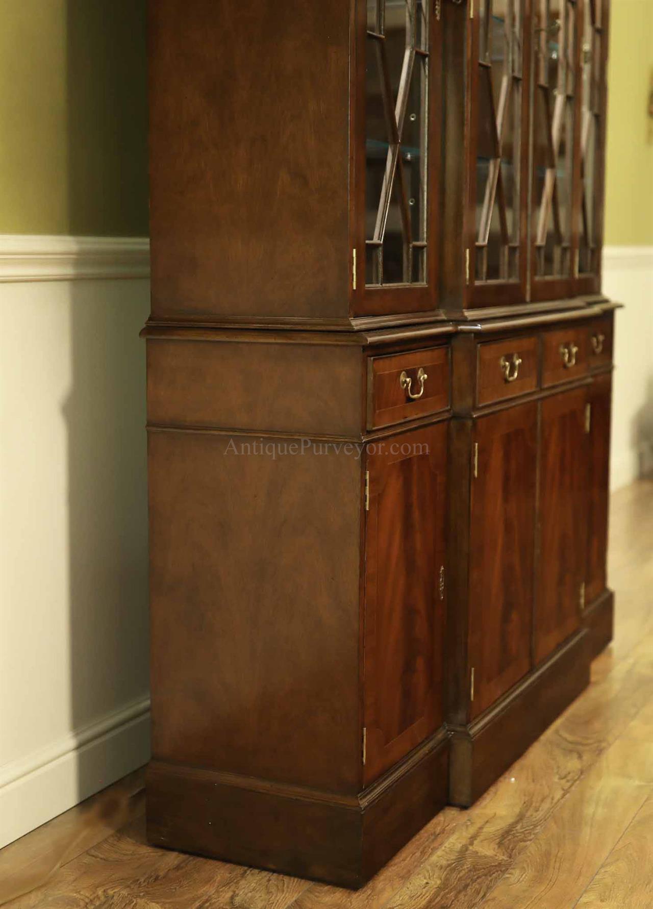 English china cabinet with 4 doors. Flame mahogany door panels and drawers. Working keys included. Cabinet has traditional bracket feet. Super clean cabinet is not brand new, but very polished. Cabinet has glass shelves on top, which are adjustable and wood shelves in the bottom half of the cabinet.