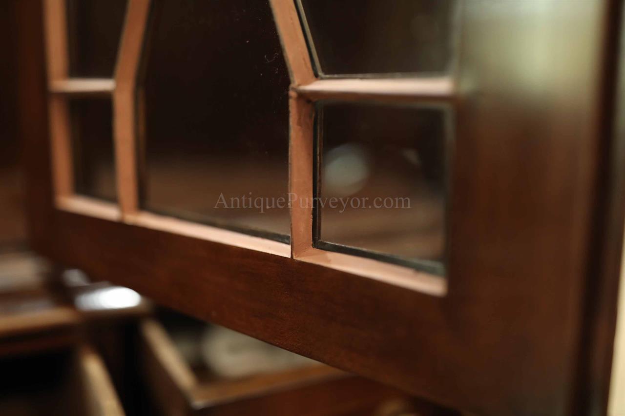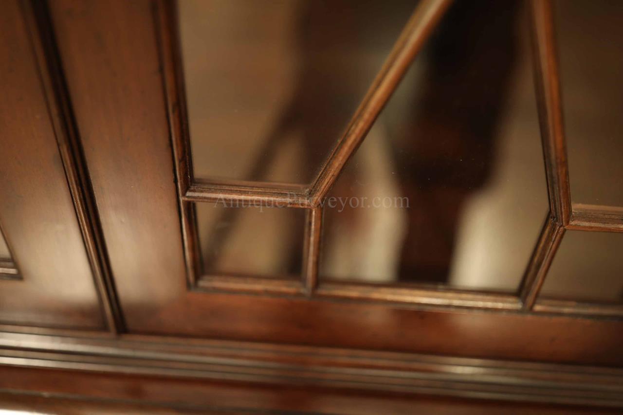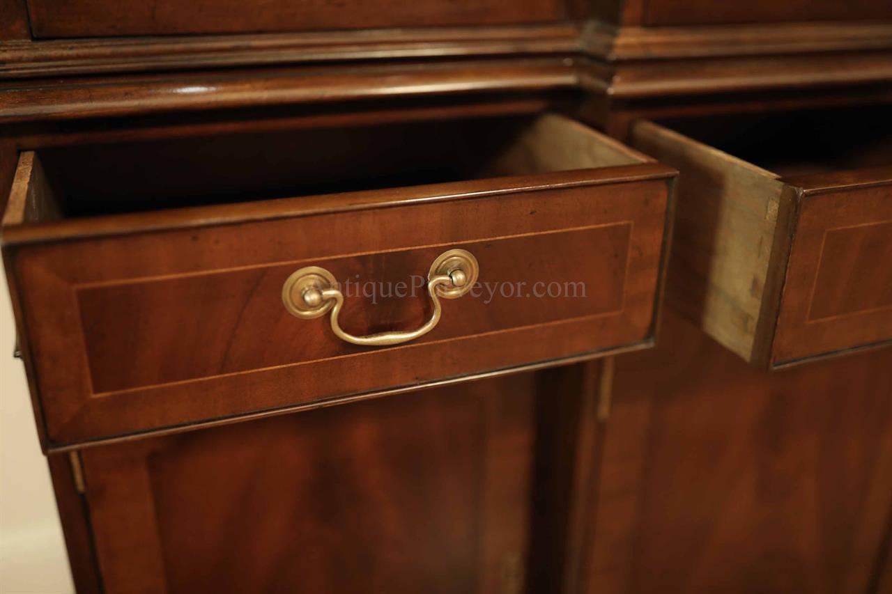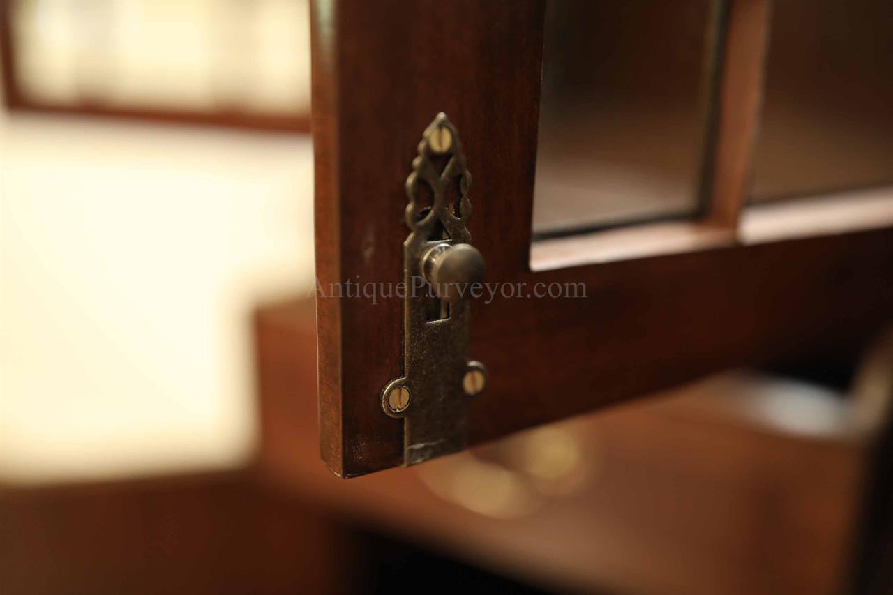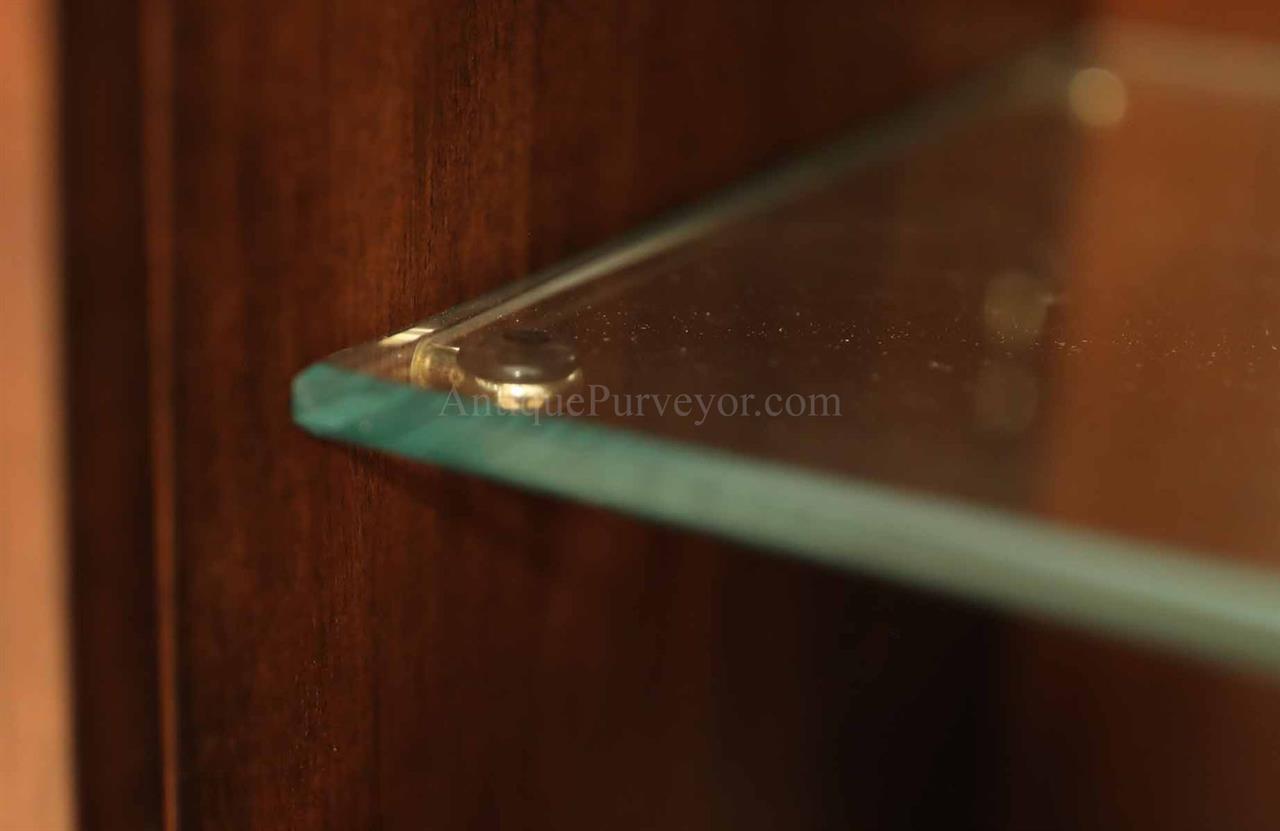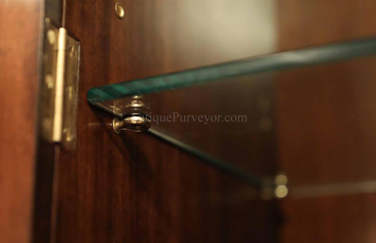English china cabinet with 4 doors. Flame mahogany door panels and drawers. Working keys included. Cabinet has traditional bracket feet. Super clean cabinet is not brand new, but very polished. Cabinet has glass shelves on top, which are adjustable and wood shelves in the bottom half of the cabinet.