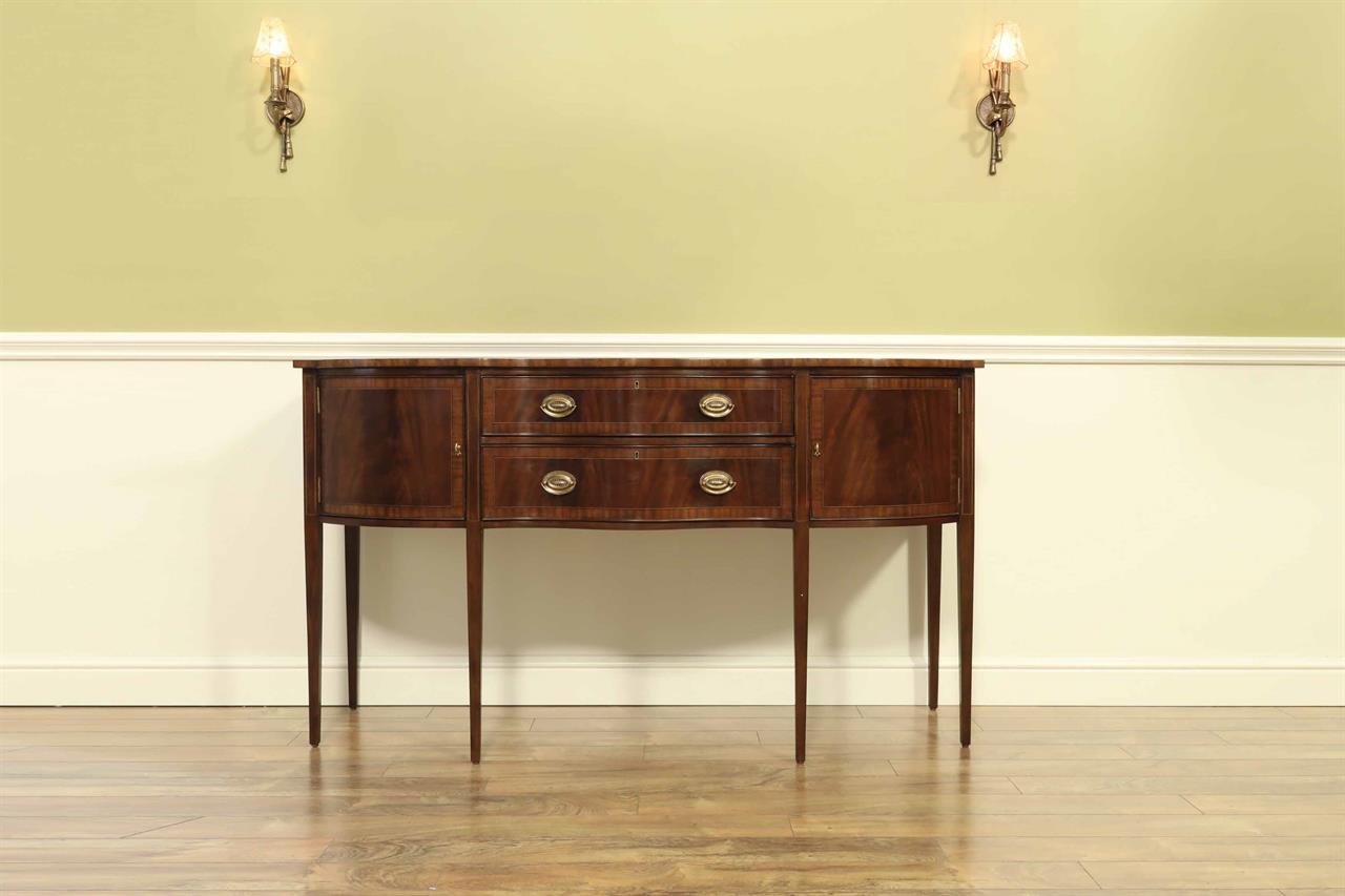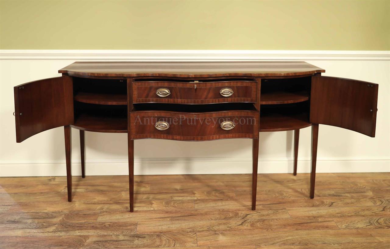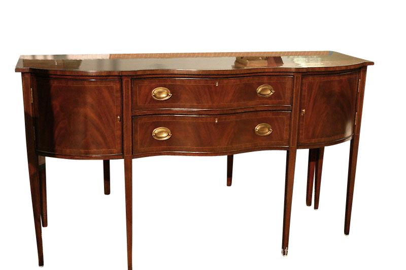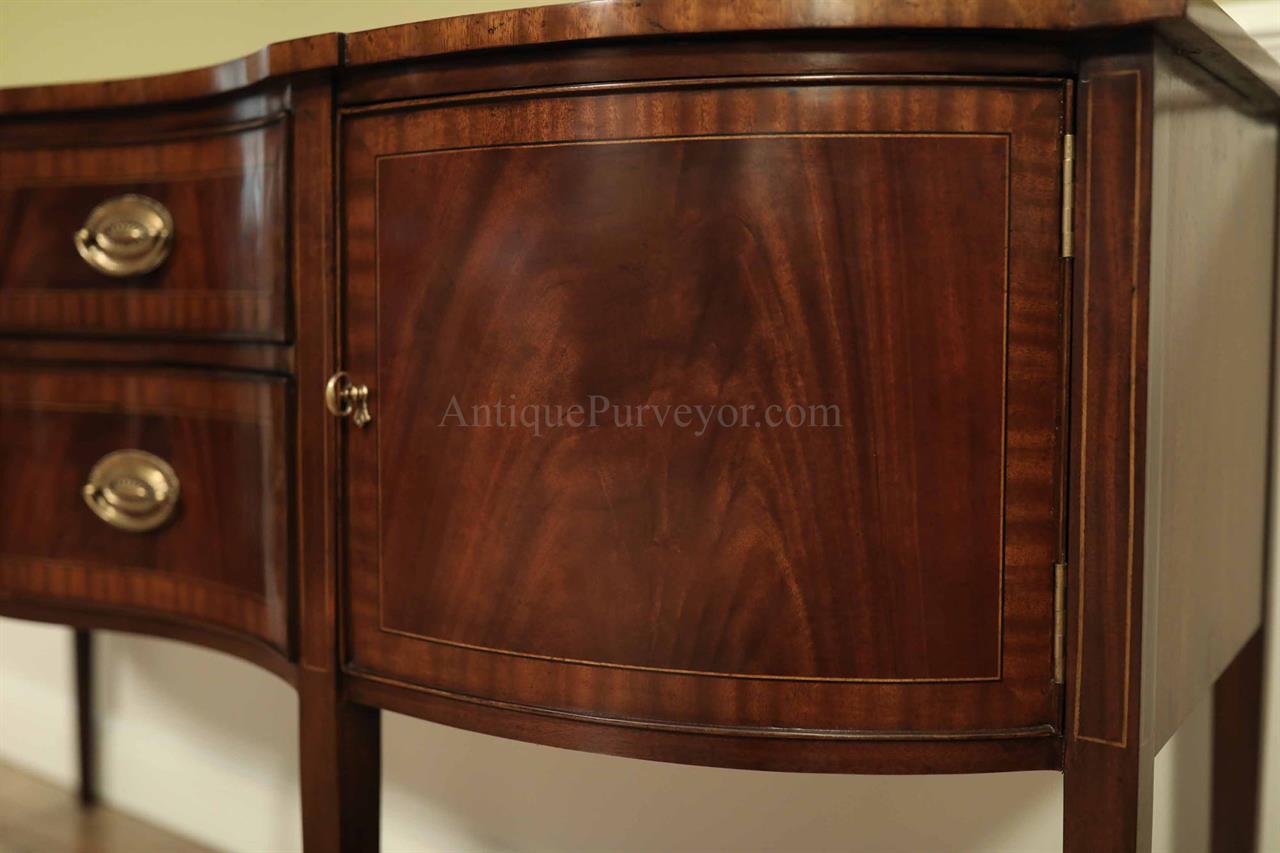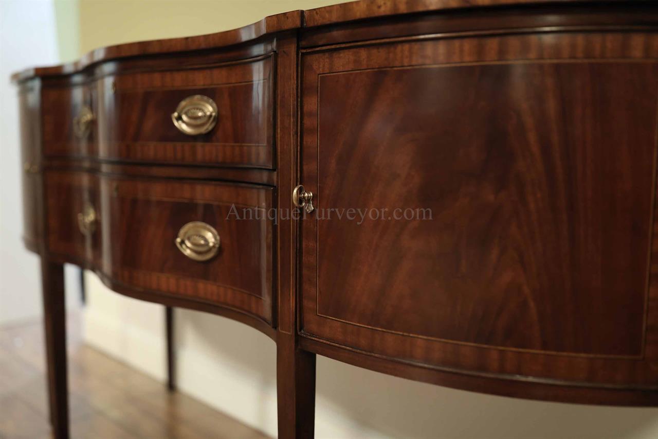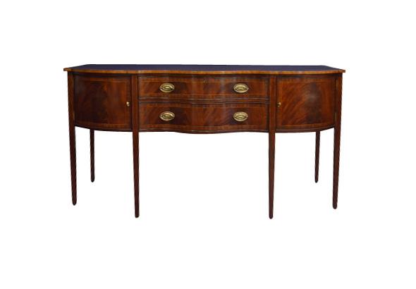 Hepplewhite-style serpentine mahogany sideboard on tapered legs. The two center drawers feature dovetail construction and are made of solid oak. The sideboard has a warm brown mahogany finish with a 30% sheen finish. The sideboard provides extensive storage, with two doors concealing a large storage area, a shelf, and deep drawers. The sideboard is constructed with a solid mahogany frame, including flame mahogany fields and mahogany banding. Measurements: 68″Lx 24″Dx38″H