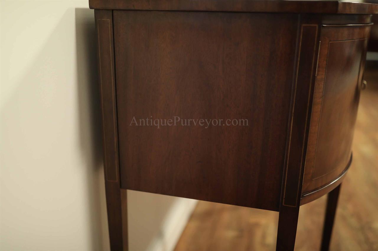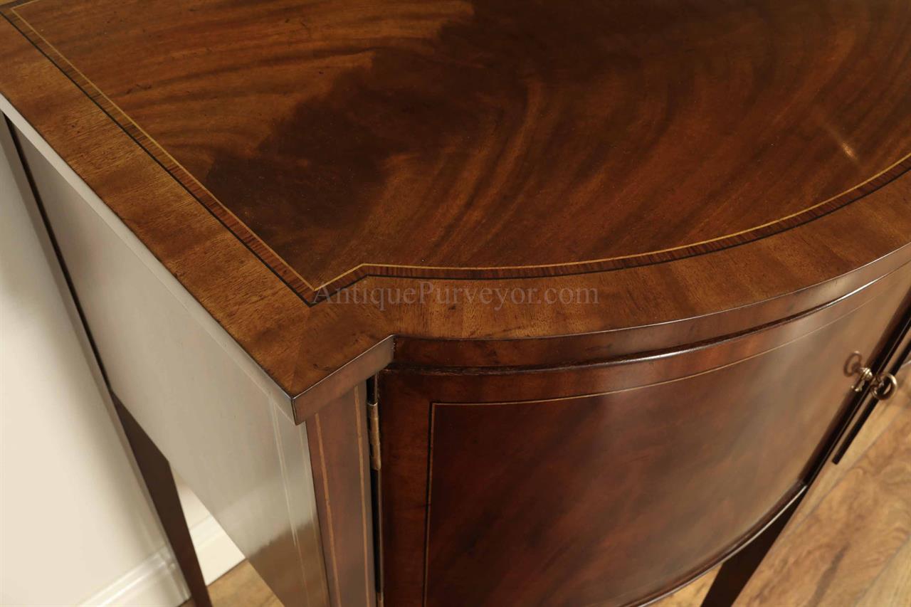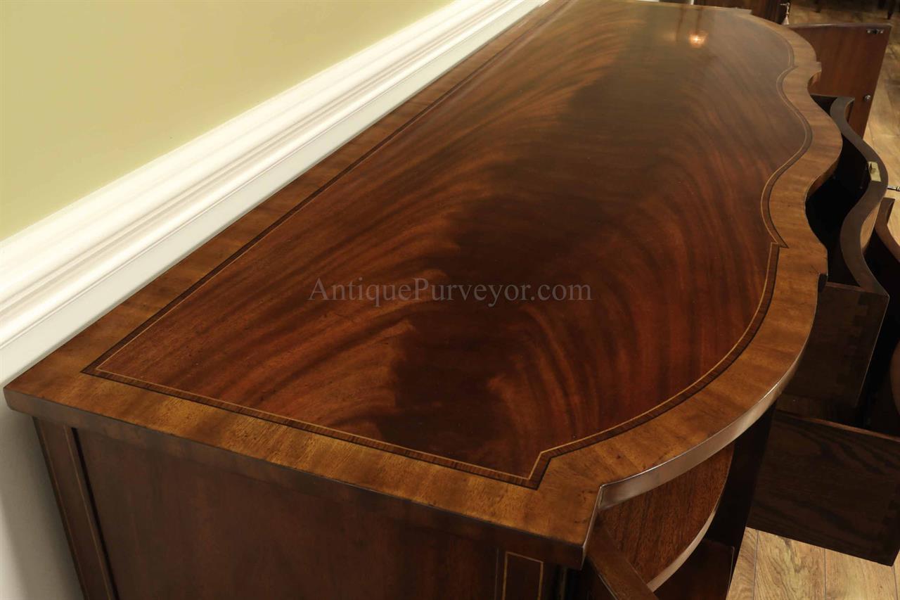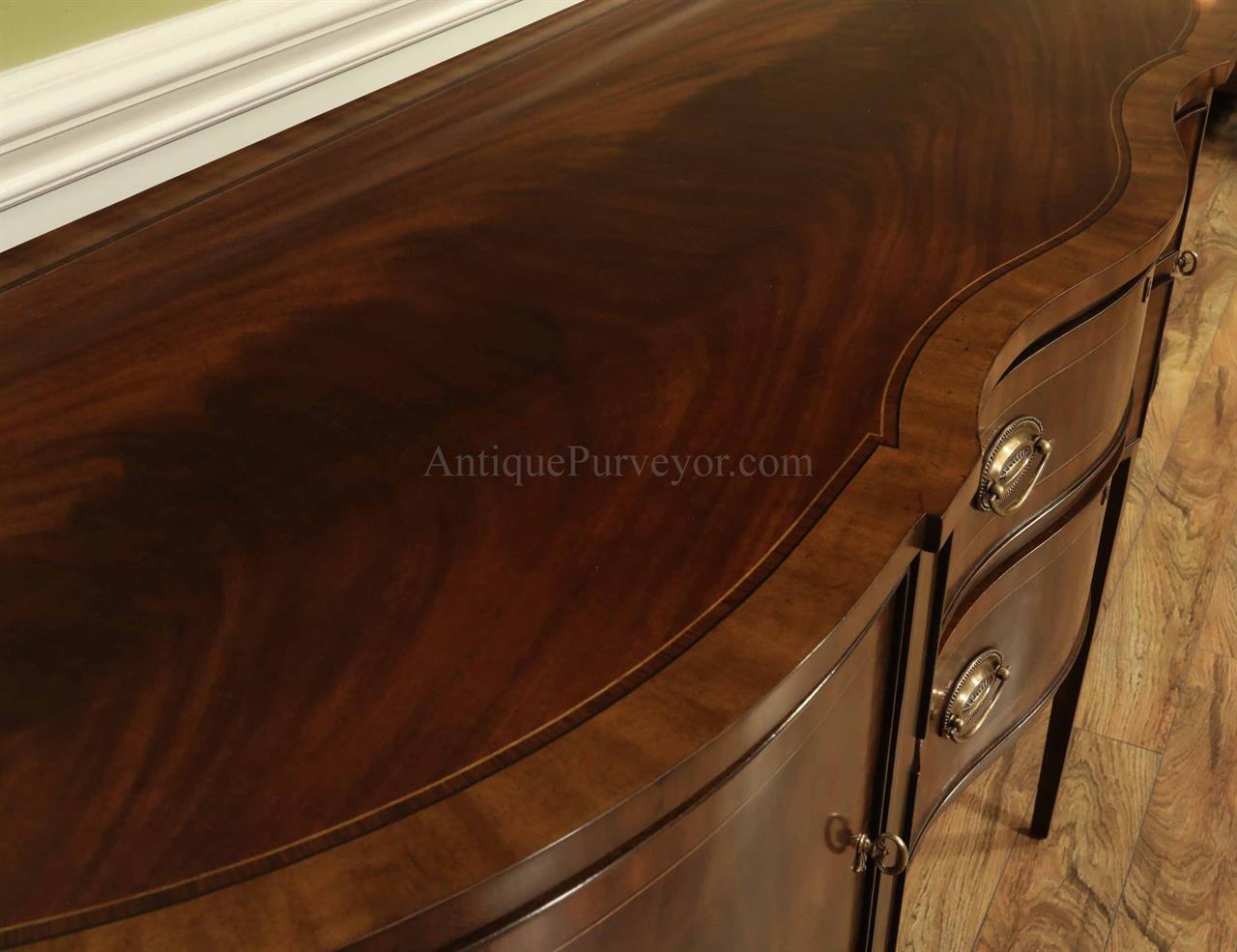 Hepplewhite-style serpentine mahogany sideboard on tapered legs. The two center drawers feature dovetail construction and are made of solid oak. The sideboard has a warm brown mahogany finish with a 30% sheen finish. The sideboard provides extensive storage, with two doors concealing a large storage area, a shelf, and deep drawers. The sideboard is constructed with a solid mahogany frame, including flame mahogany fields and mahogany banding. Measurements: 68″Lx 24″Dx38″H