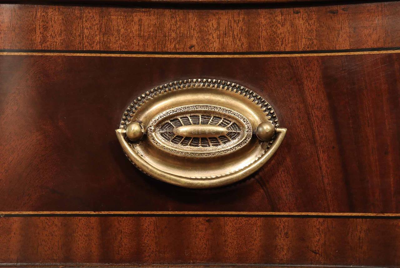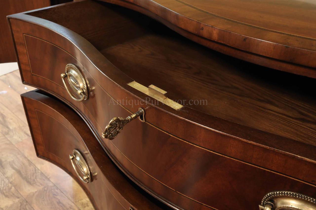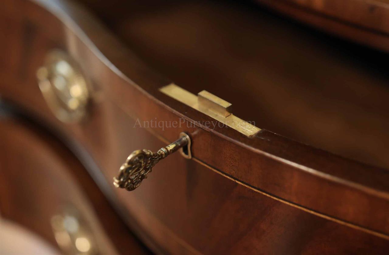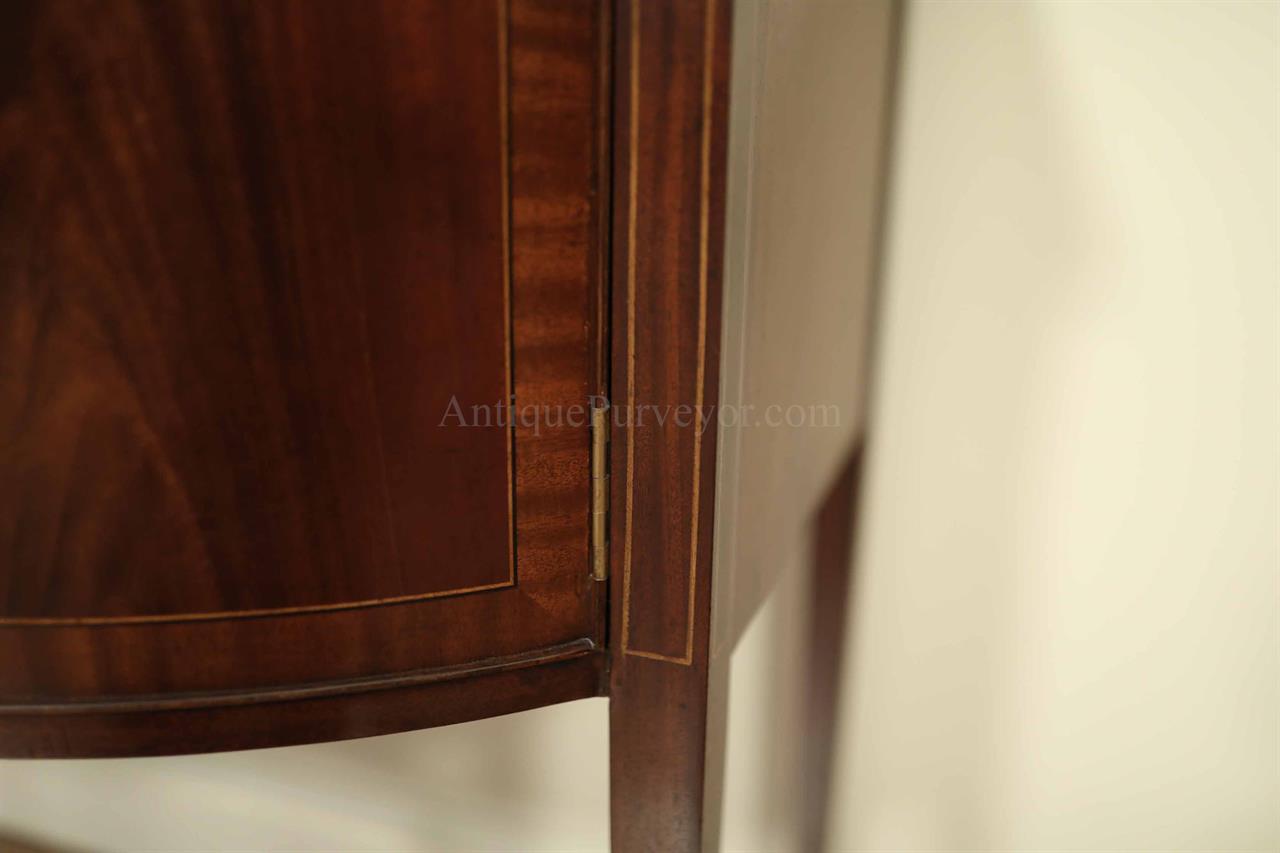 Hepplewhite-style serpentine mahogany sideboard on tapered legs. The two center drawers feature dovetail construction and are made of solid oak. The sideboard has a warm brown mahogany finish with a 30% sheen finish. The sideboard provides extensive storage, with two doors concealing a large storage area, a shelf, and deep drawers. The sideboard is constructed with a solid mahogany frame, including flame mahogany fields and mahogany banding. Measurements: 68″Lx 24″Dx38″H