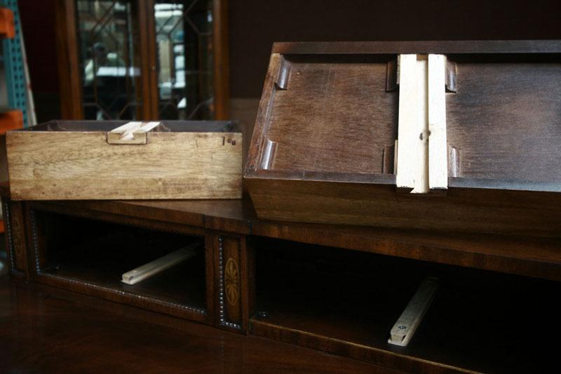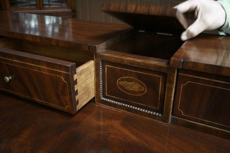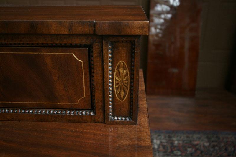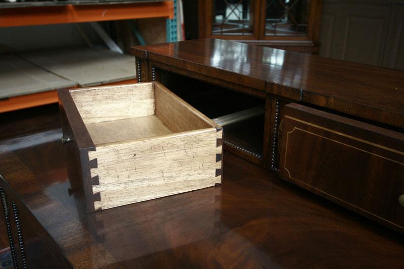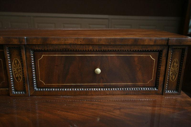 Quality mahogany sideboard with flame mahogany and satinwood inlays. Superb dining room piece with awesome construction. This is a new cabinet and it is from the Phillipine region. It is a very heavy and sturdy cabinet with great storage features. The top deck is loaded with small accent drawers. Bottom of cabinet has larger storage and large drawer. This sideboard would sell for $5,500 in any new furniture showroom and it is Henkel Harris or Henredon quality. Drawers have slides and are made from oak or similar hardwood. Entire cabinet has small bead carvings which really bring this cabinet to a rich look. Nice hardware and working key.