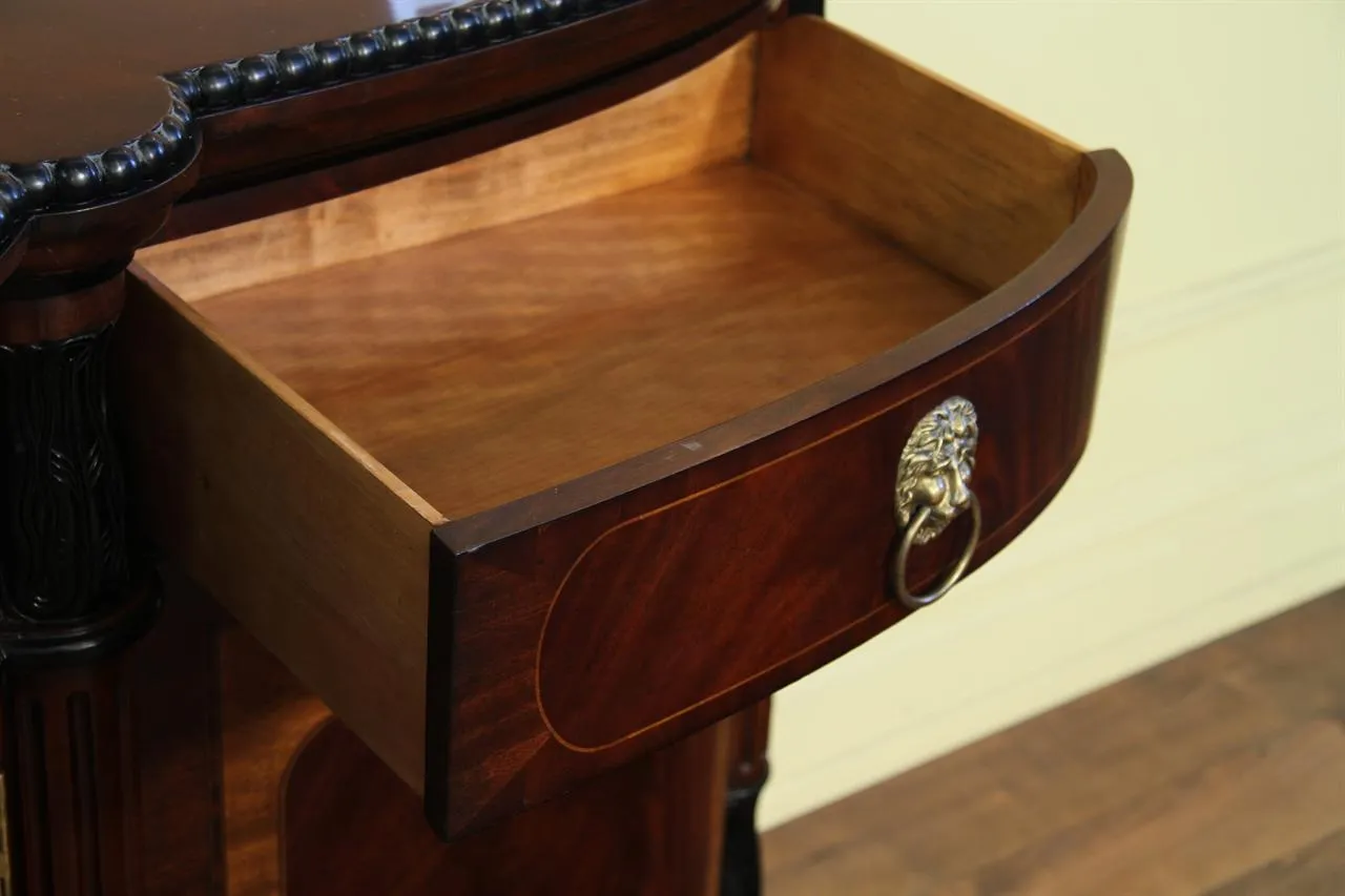 Luxurious Regency-style mahogany sideboard in great condition. This large sideboard came from an immaculate estate. New, these cabinets have a MSRP of $30K, they are manufactured under the EJ Victor brand. They still make this cabinet new, and we can also provide a new cabinet, please inquire about special pricing for that option. This product page is for a pre-owned cabinet in great condition. It is a heavy cabinet, we will ship this on a pallet and the item should be delivered by a truck equipped with a liftgate The cabinet is finished in a rich dark brown mahogany color and it has satinwood inlaid door panels. Soft turned corners, bow front, lion paw feet with radial crotch mahogany top (pie-cut). It is one of the most desirable traditional sideboards in today’s market. Measurements: 84 Long x 24.5″ Deep 37.5 high