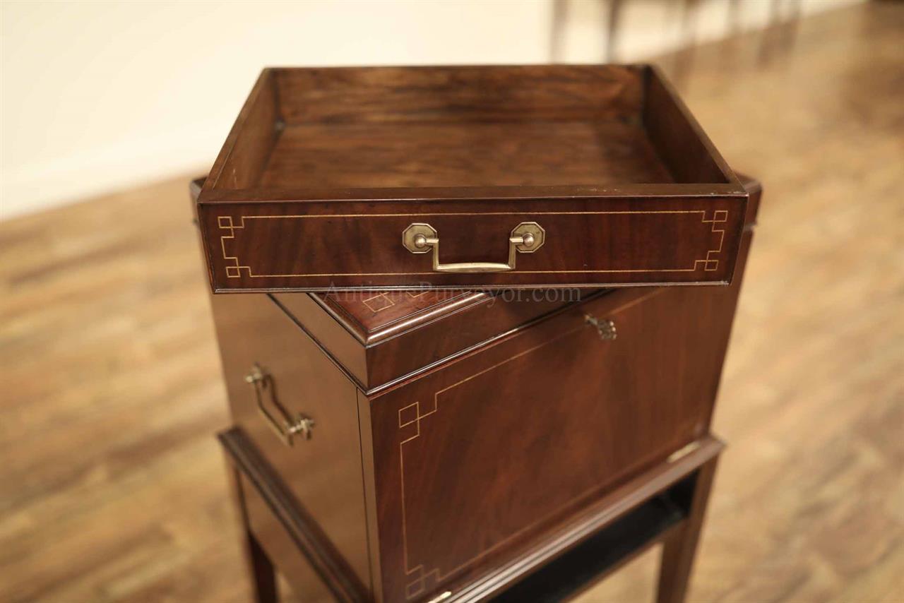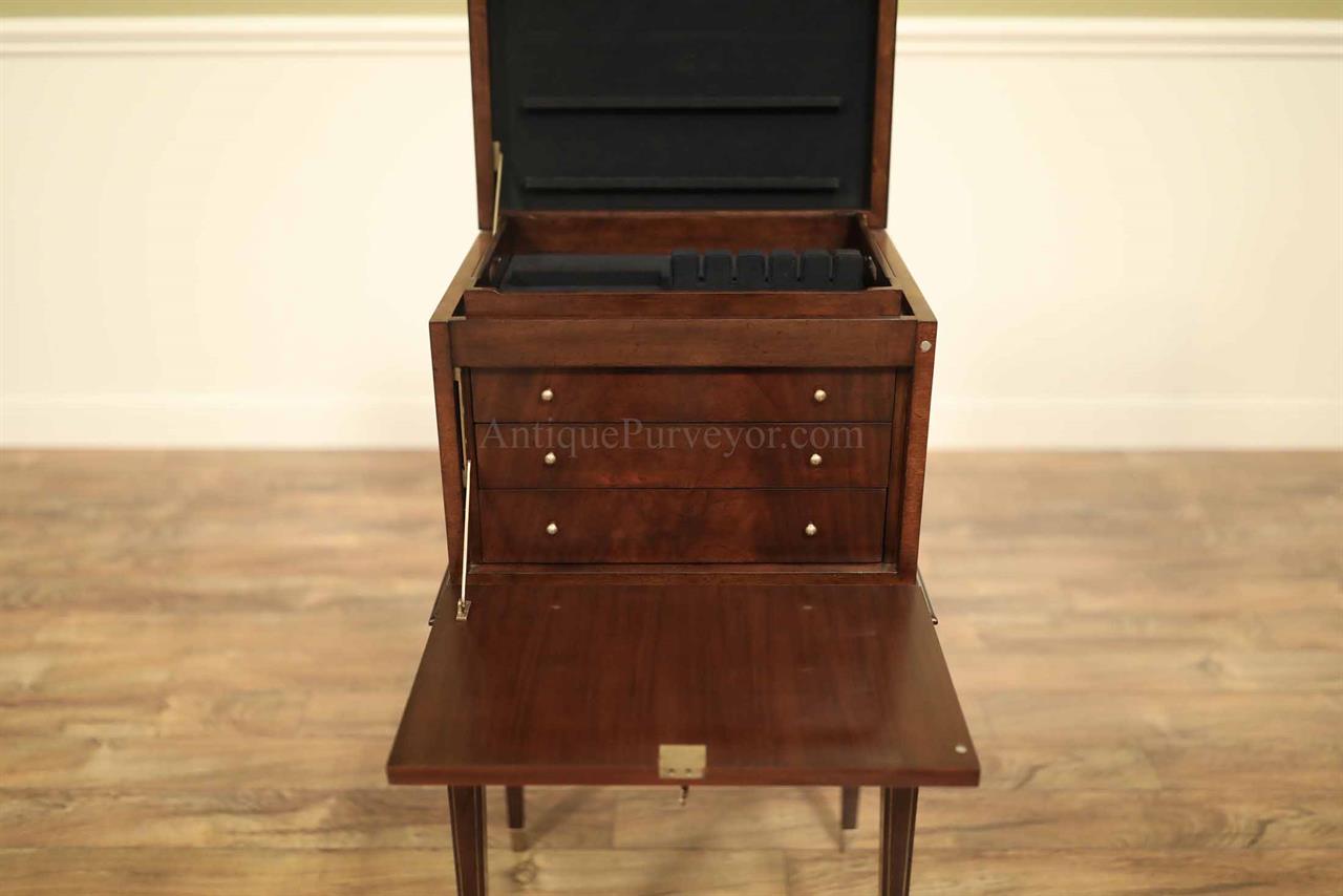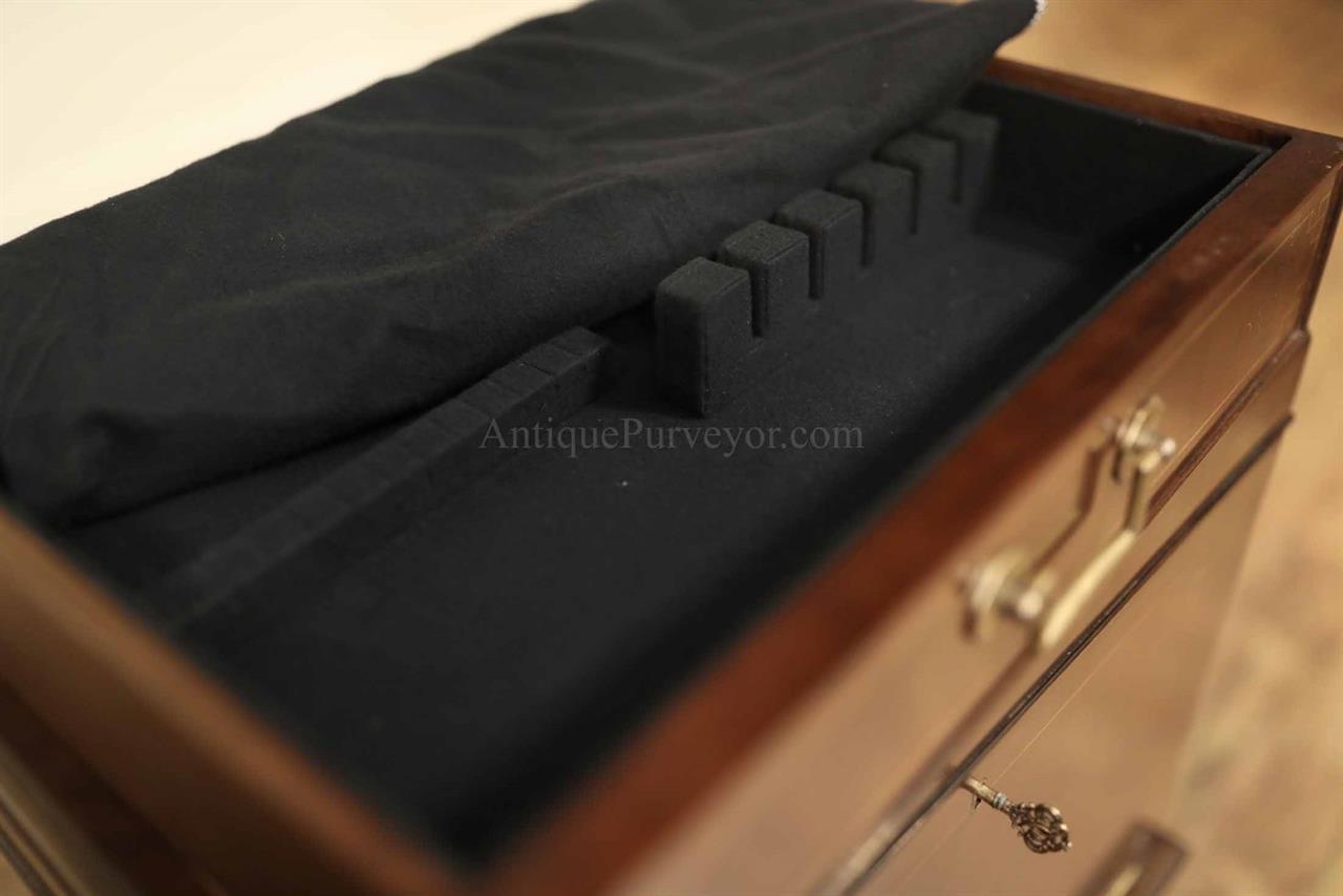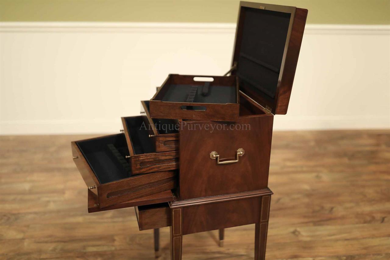 Mahogany silver chest or side cabinet for flatware. This is a high-end antique reproduction inlaid mahogany chest on legs or base. High-end pinstripe inlaid Hepplewhite style silver chest with 4 drawers and a removable tray. This cabinet has a working key which locks the top and front drawers with one mechanism. Spade feet terminating with brass caps. Flame mahogany decorated silver chest with side handles. Heavy, dense cabinet with dovertailed solid oak drawers. This cabinet is fit for a higher end home. It is very good quality. Its tall narrow design makes it easy to fit into any dining area.