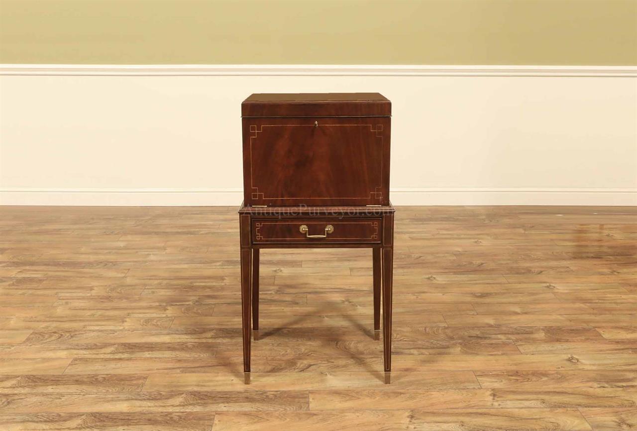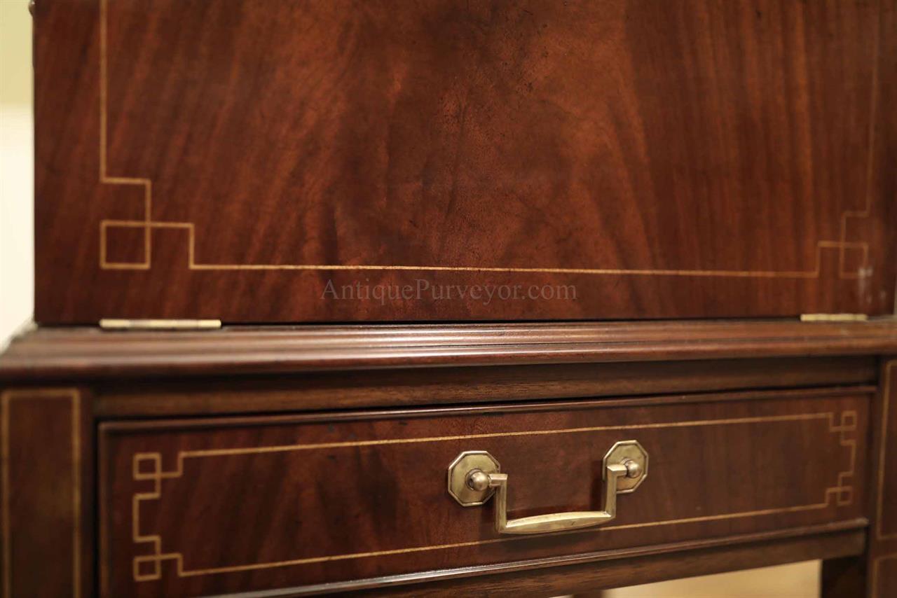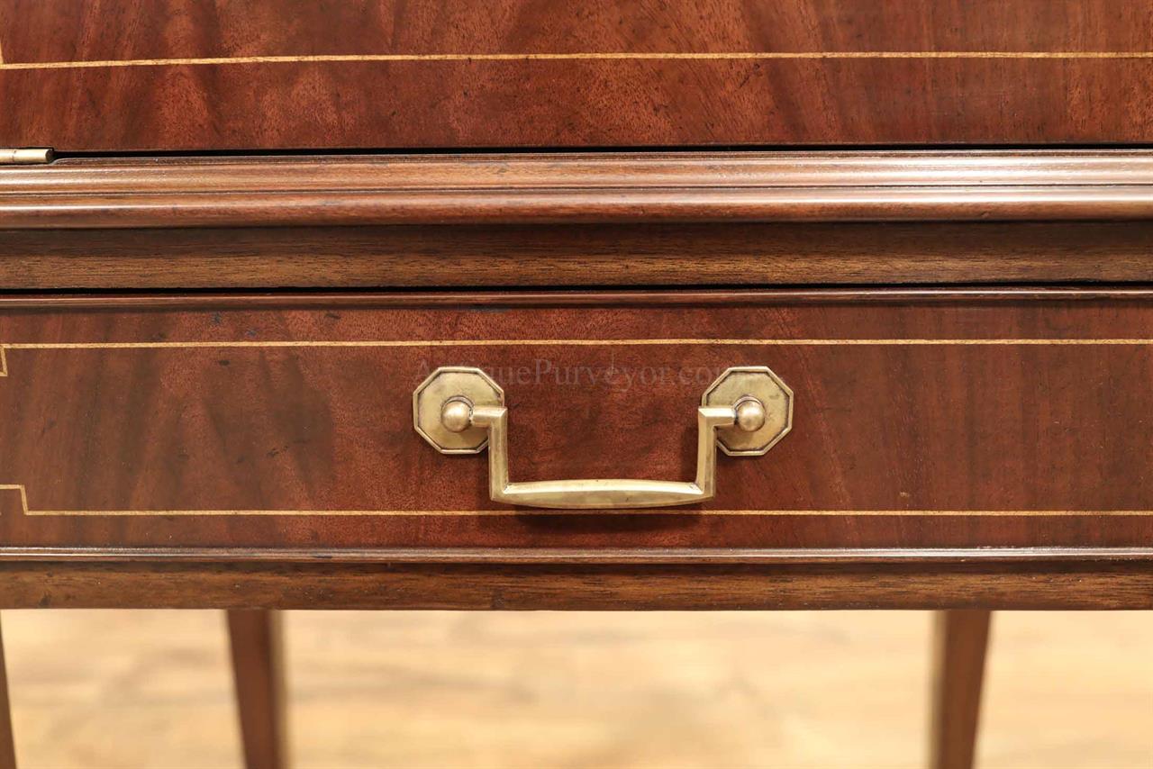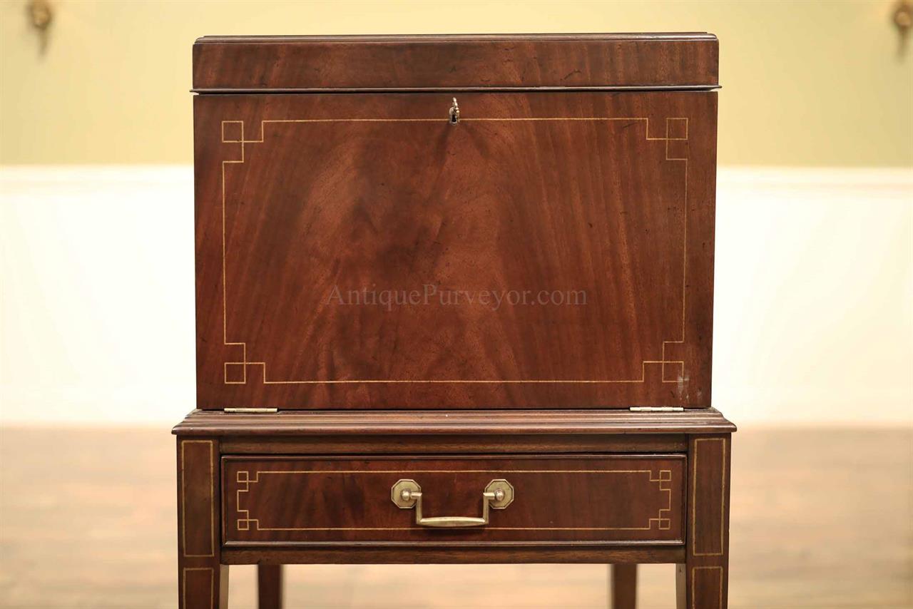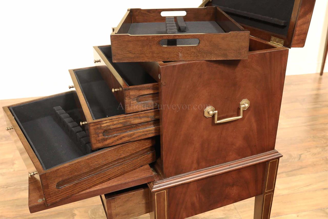 Mahogany silver chest or side cabinet for flatware. This is a high-end antique reproduction inlaid mahogany chest on legs or base. High-end pinstripe inlaid Hepplewhite style silver chest with 4 drawers and a removable tray. This cabinet has a working key which locks the top and front drawers with one mechanism. Spade feet terminating with brass caps. Flame mahogany decorated silver chest with side handles. Heavy, dense cabinet with dovertailed solid oak drawers. This cabinet is fit for a higher end home. It is very good quality. Its tall narrow design makes it easy to fit into any dining area.
