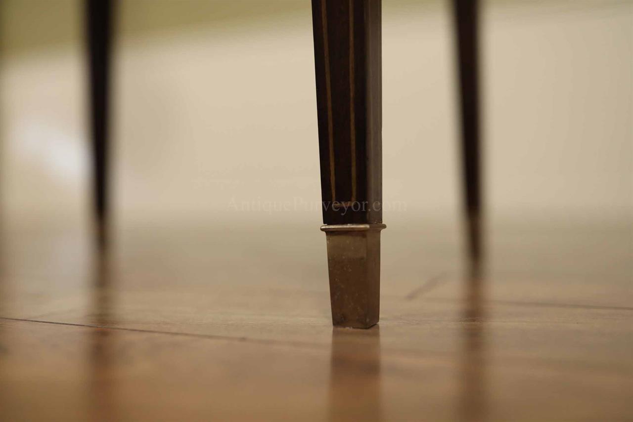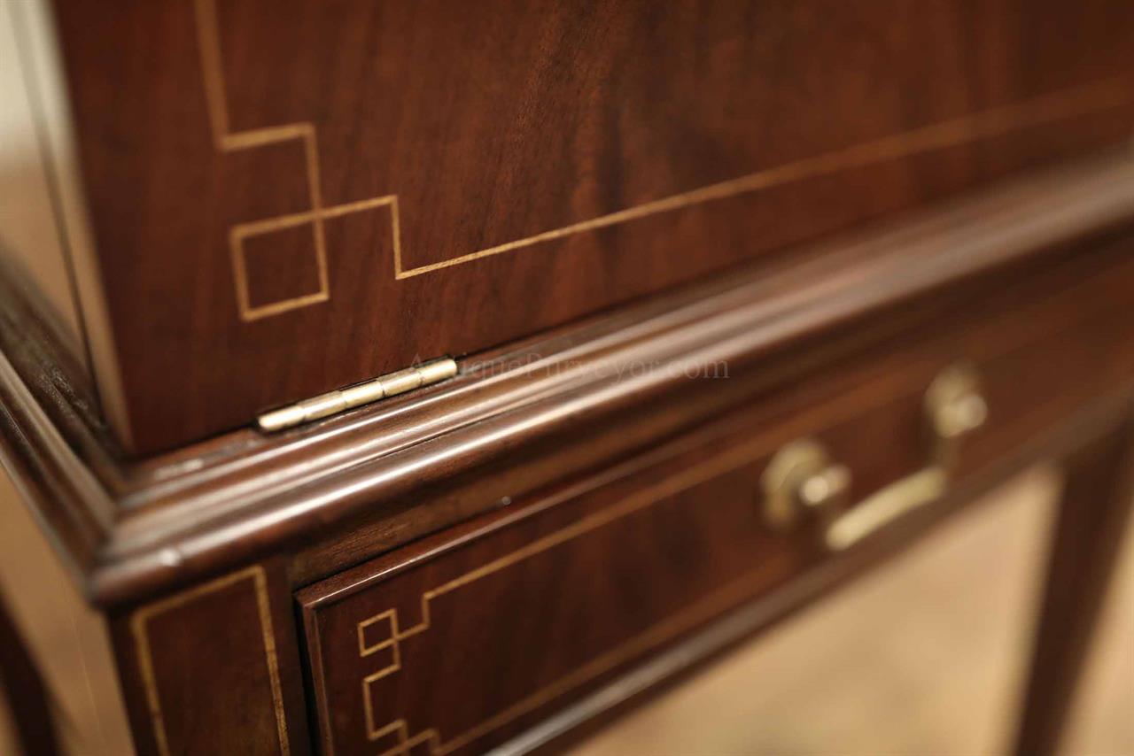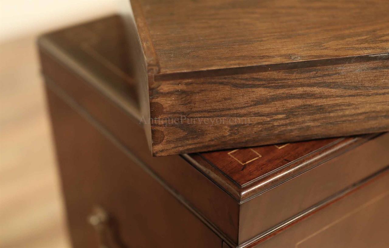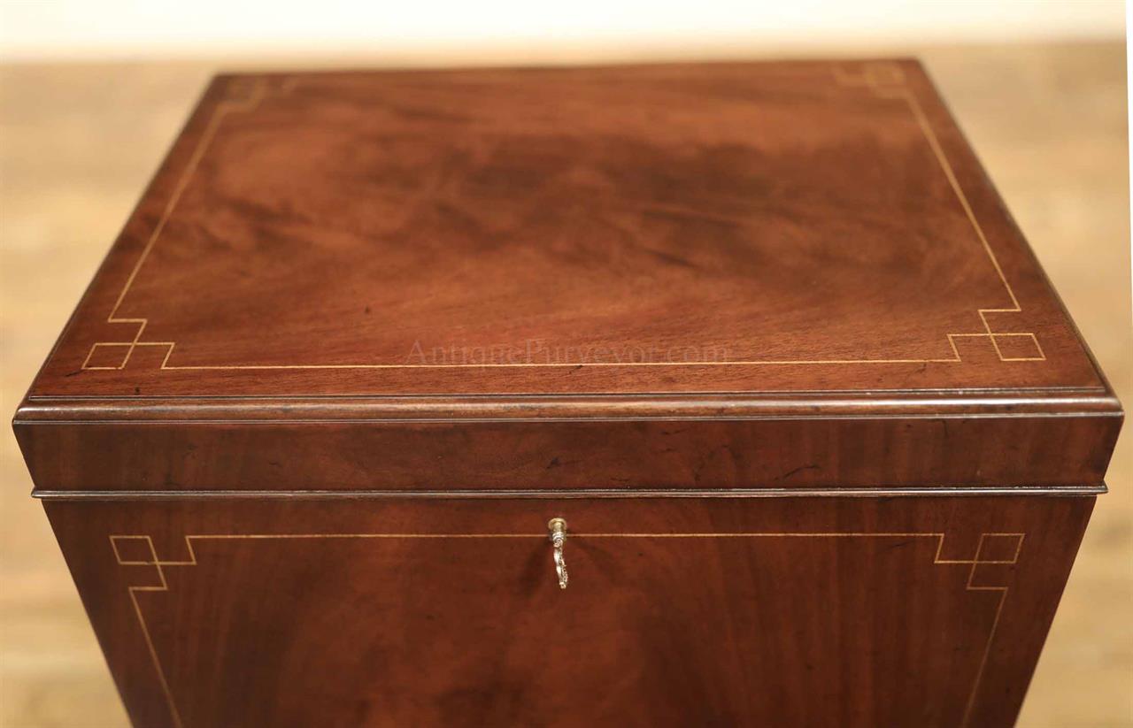 Mahogany silver chest or side cabinet for flatware. This is a high-end antique reproduction inlaid mahogany chest on legs or base. High-end pinstripe inlaid Hepplewhite style silver chest with 4 drawers and a removable tray. This cabinet has a working key which locks the top and front drawers with one mechanism. Spade feet terminating with brass caps. Flame mahogany decorated silver chest with side handles. Heavy, dense cabinet with dovertailed solid oak drawers. This cabinet is fit for a higher end home. It is very good quality. Its tall narrow design makes it easy to fit into any dining area.