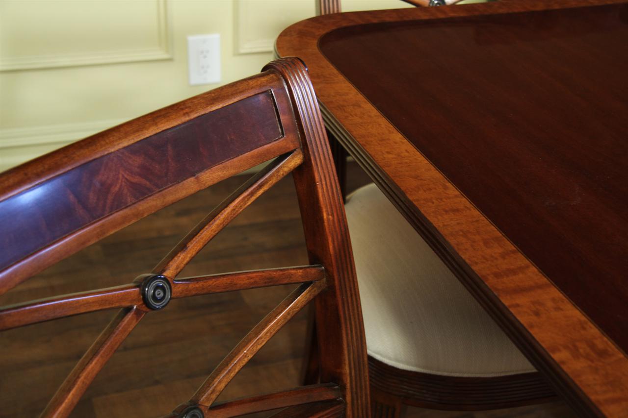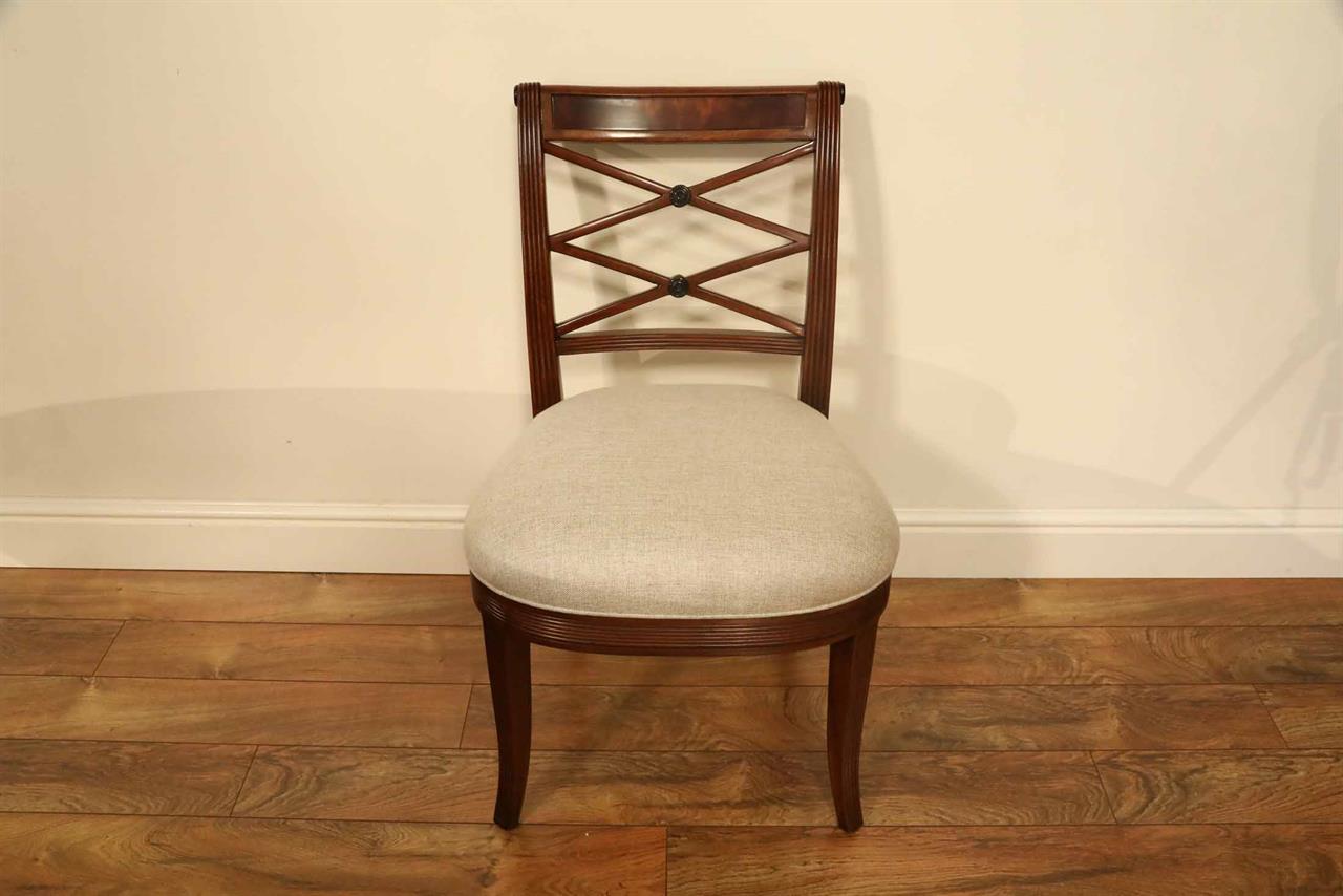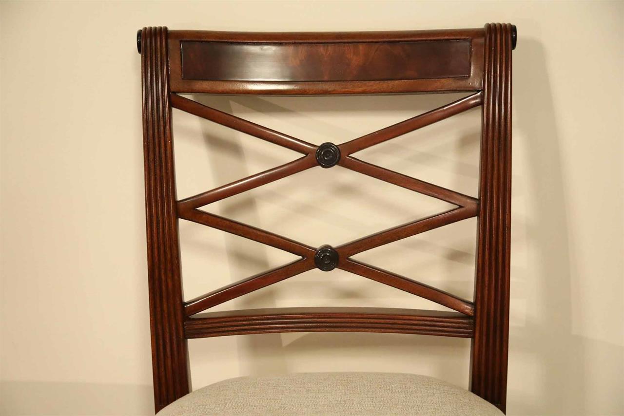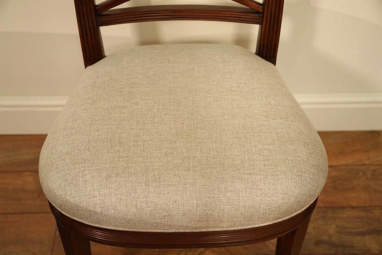 Low-profile upholstered cross-back dining chairs. These are comfortable fine reproductions for a higher-end estate. Sturdy, traditional, and skillfully distressed finish to look and feel like a genuine antique. Double ‘X’ cross backs, Cerejera inlaid splats, reeded frames, and legs. These chairs have an advanced and multi-step finish which is apparent as soon as you see them. The finish itself has lots of depth and character. Traditional brown mahogany color with tones of medium brown and amber. Widely accepted linen color durable chevron weave fabric is standard for in-stock chairs. These are very heavy chairs and made from dense and quality mahogany material. They look great, sit comfortably, handle heavily, and are built with traditional methods. Impressive antique reproduction chairs. Your guests will think you’ve just inherited them.