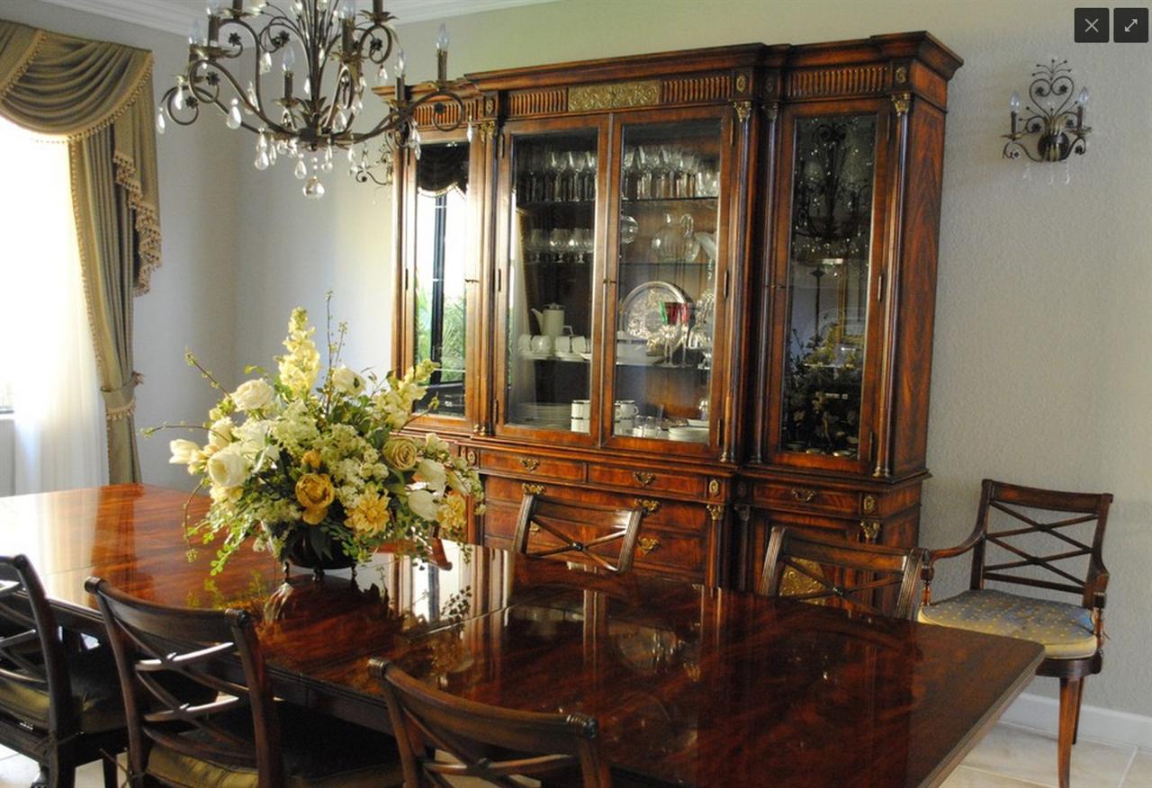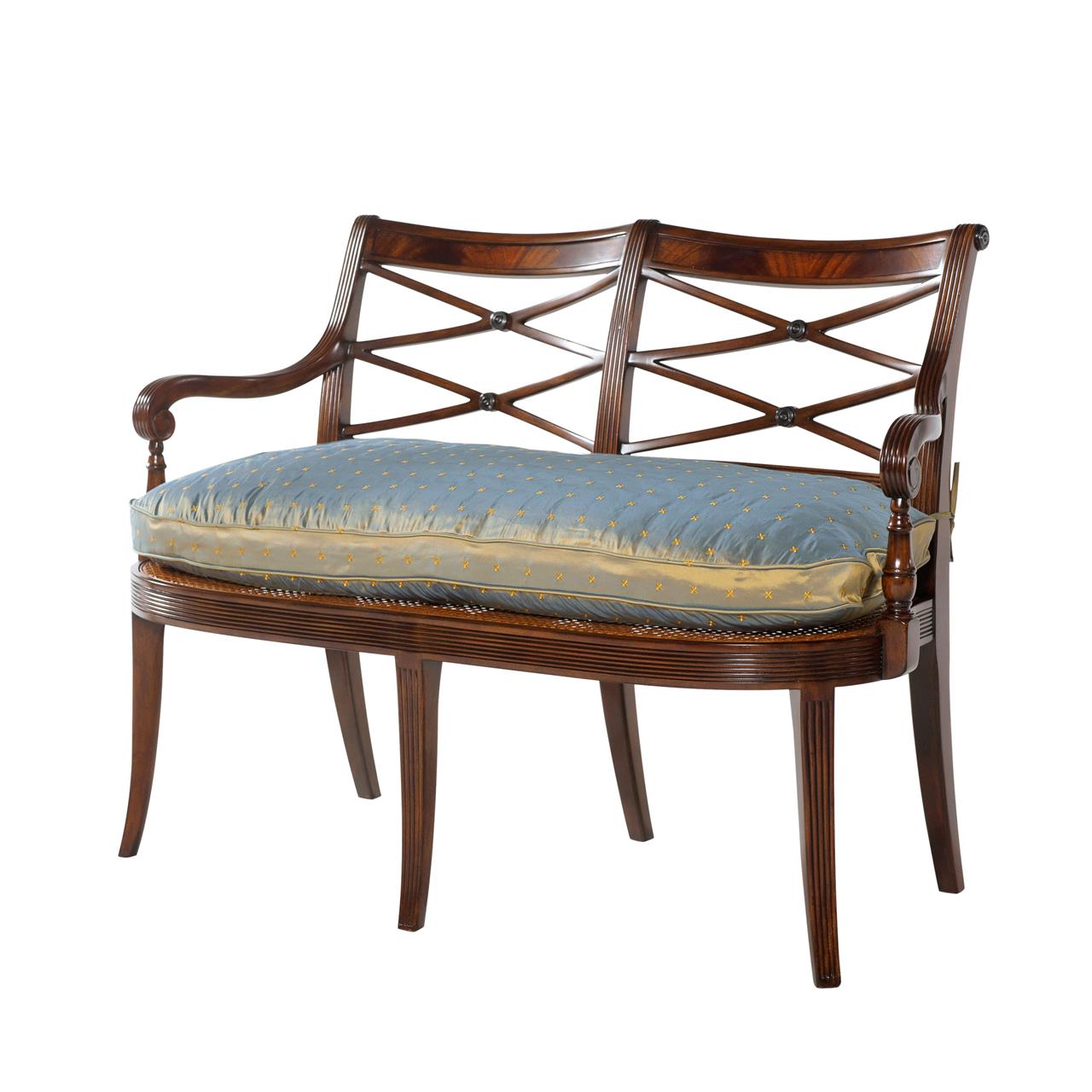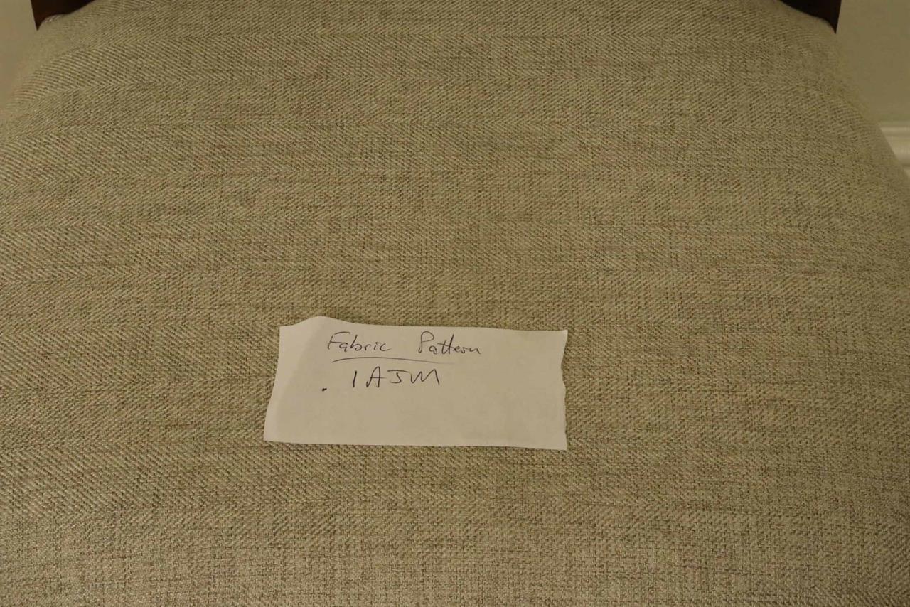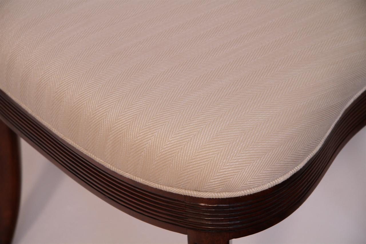 Low-profile upholstered cross-back dining chairs. These are comfortable fine reproductions for a higher-end estate. Sturdy, traditional, and skillfully distressed finish to look and feel like a genuine antique. Double ‘X’ cross backs, Cerejera inlaid splats, reeded frames, and legs. These chairs have an advanced and multi-step finish which is apparent as soon as you see them. The finish itself has lots of depth and character. Traditional brown mahogany color with tones of medium brown and amber. Widely accepted linen color durable chevron weave fabric is standard for in-stock chairs. These are very heavy chairs and made from dense and quality mahogany material. They look great, sit comfortably, handle heavily, and are built with traditional methods. Impressive antique reproduction chairs. Your guests will think you’ve just inherited them.