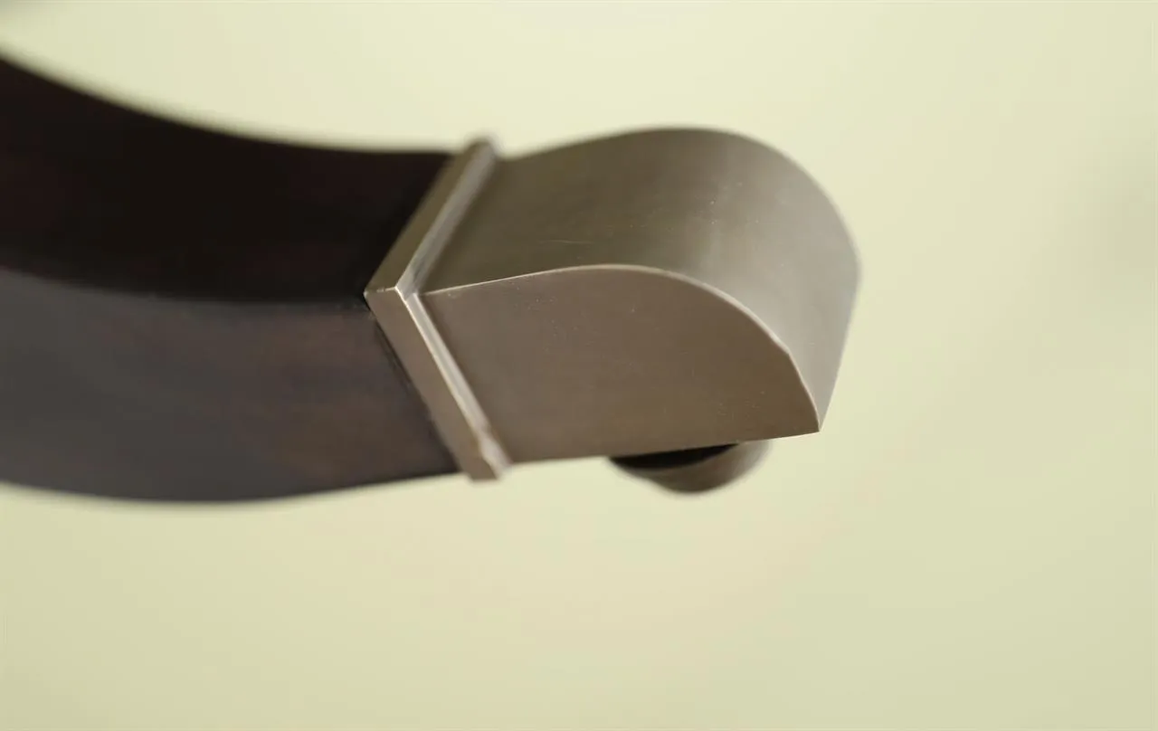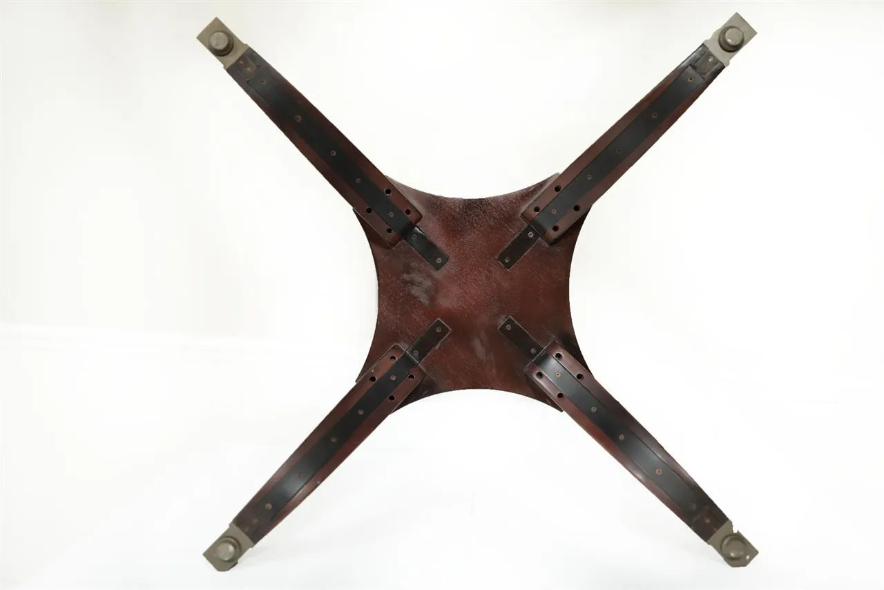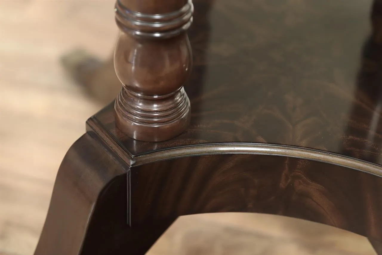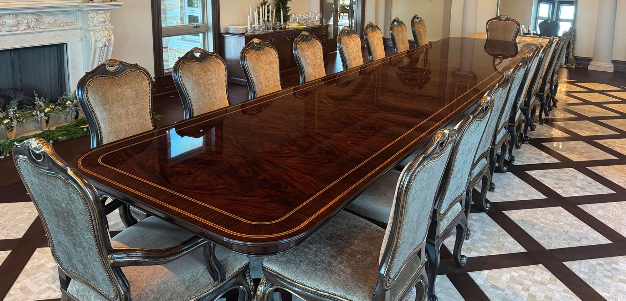 20-foot Custom mahogany dining room pedestal table. This 20-foot dark mahogany pedestal table was designed for a client’s client in Indiana (we built this table for a designer who in turn sold this table to a client). The inlays, colors, and sheen were all customized for this client’s tastes. Samples were provided to get the client a true representation of color AND sheen. This table has a 30% sheen or a matt finish. We can reproduce and repeat colors even though natural mahogany colors can vary greatly from fletch to fletch. Although mahogany tends to finish to redder tones, we add green pigments to knock out the red tones and the results lead to a rich, chocolate or espresso bean brown. This table is also unusual because it was manufactured using only two sections and therefore only one seam. This adds to the cost significantly because the table sections are 10 feet long each, and therefore the top is extra thick and the framing that supports this tabletop is excessive, heavy, thick, and very stable. The pedestals are overbuilt with steel-reinforced saber legs and solid brass feet and levelers.