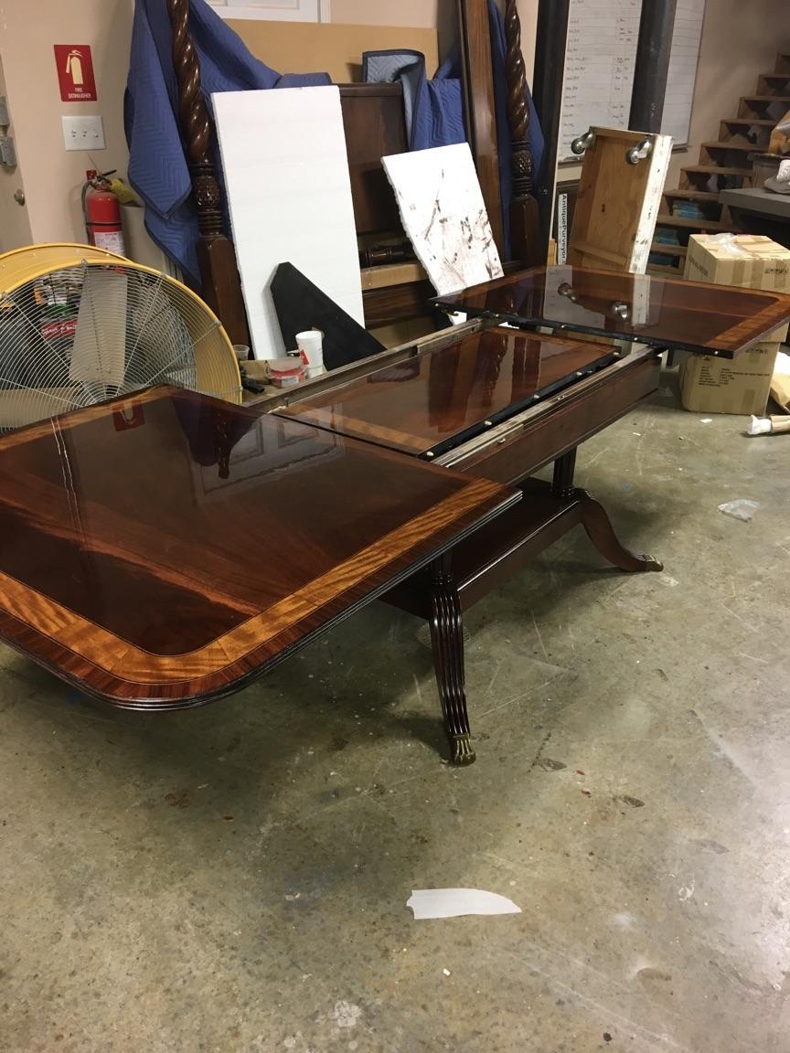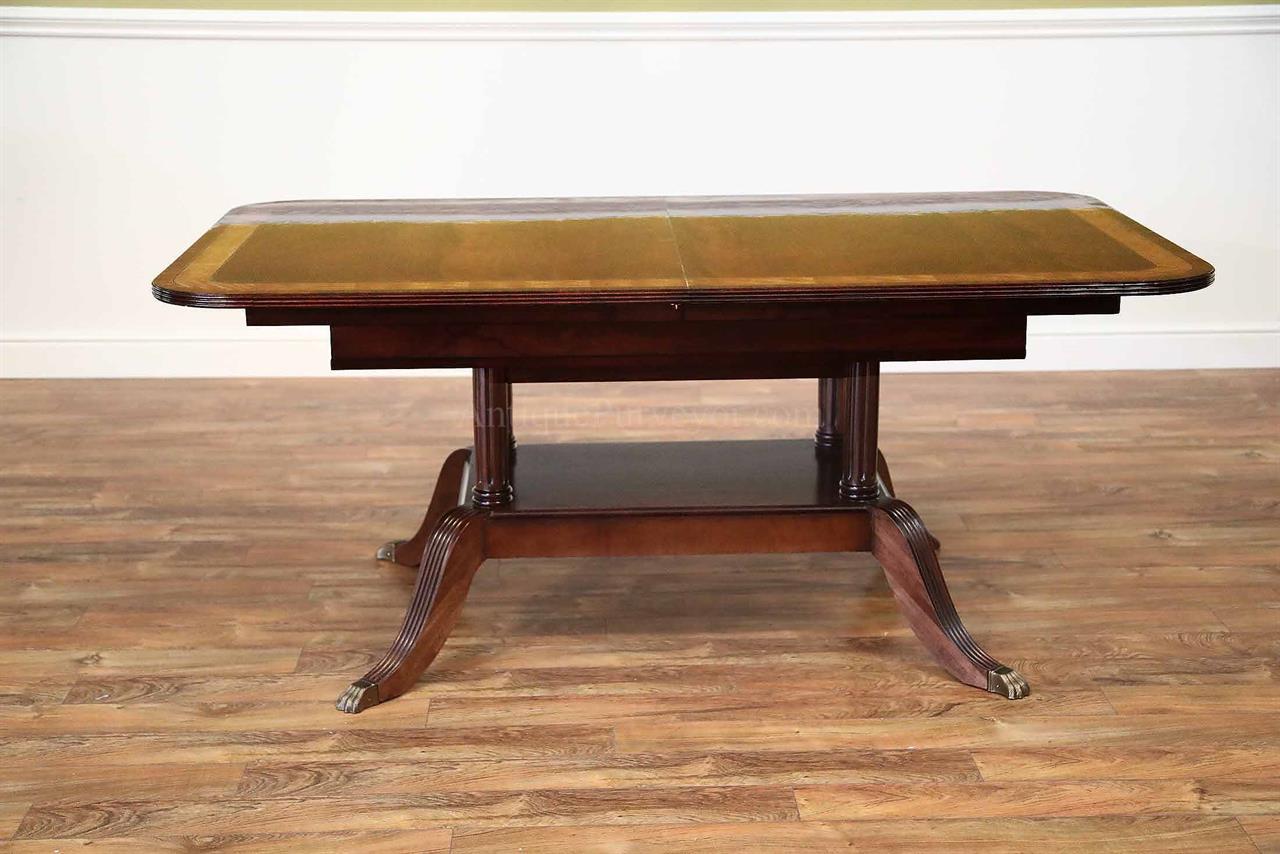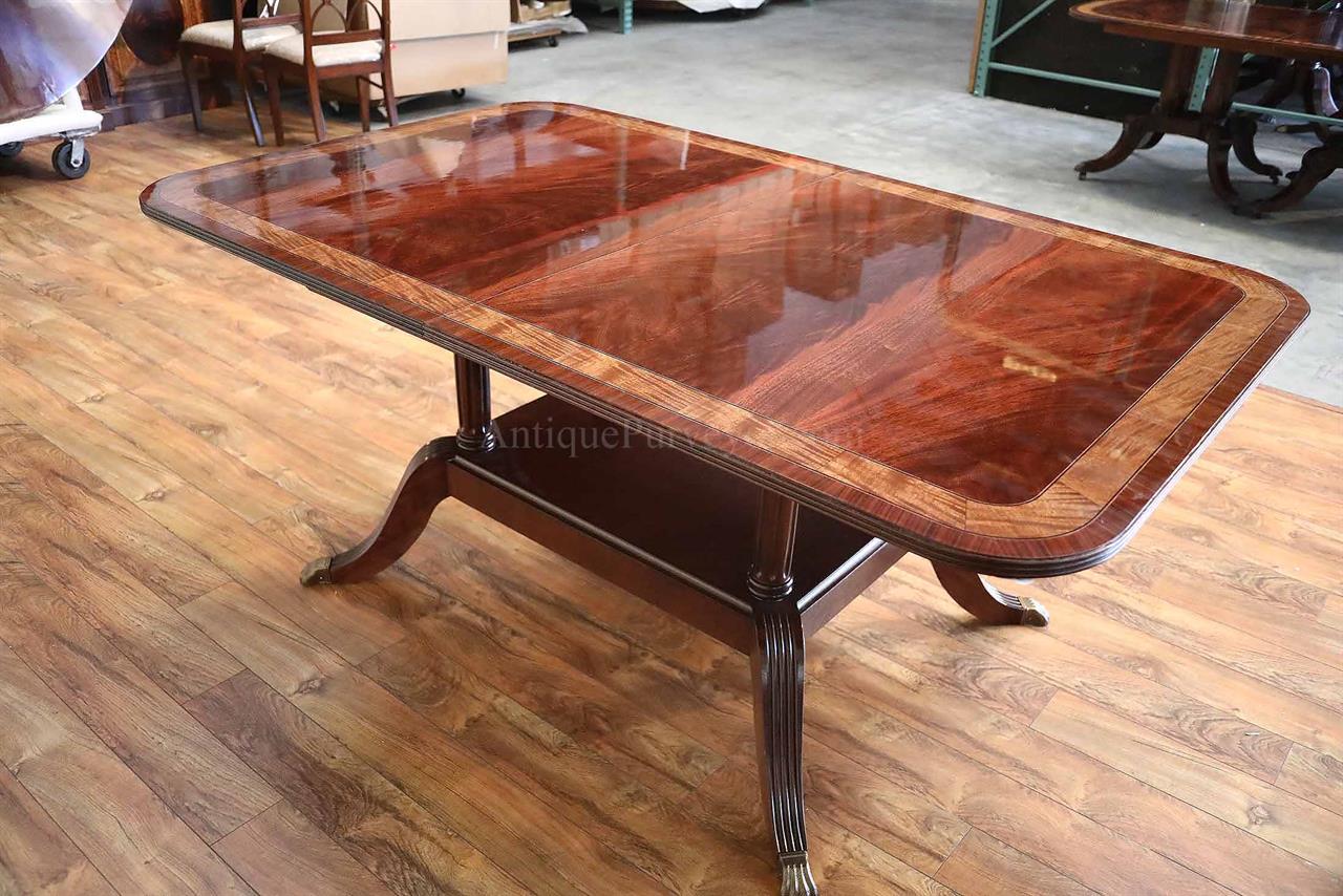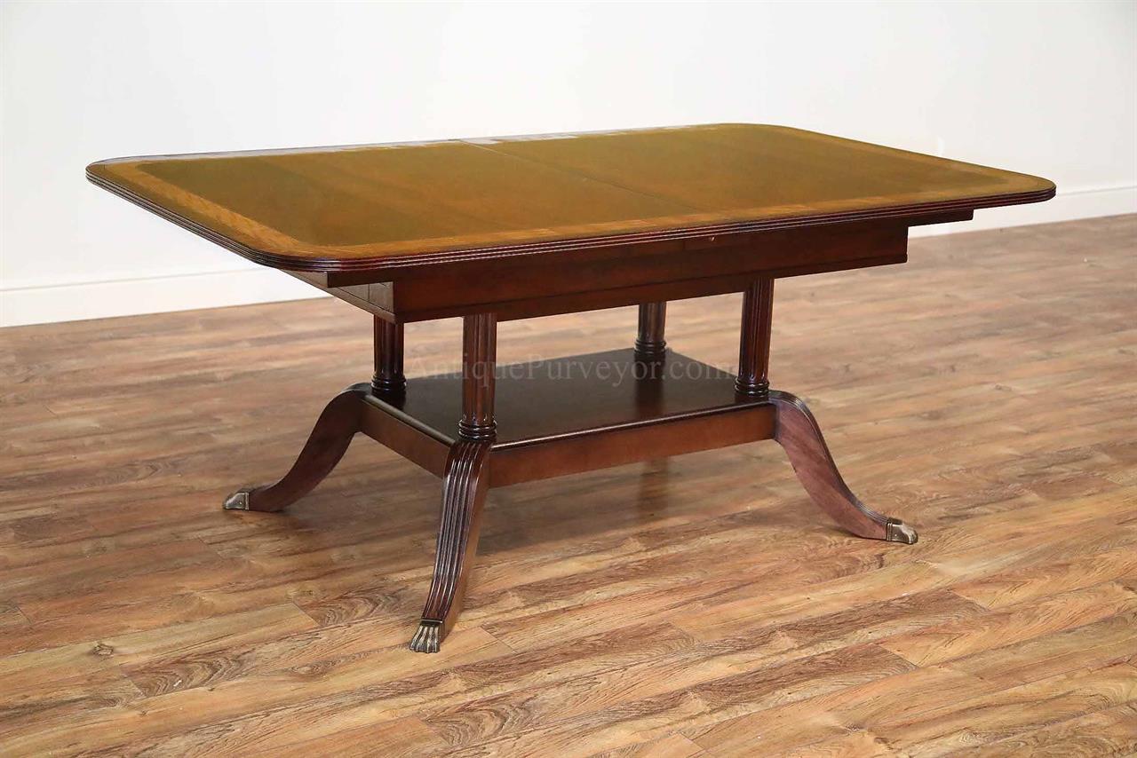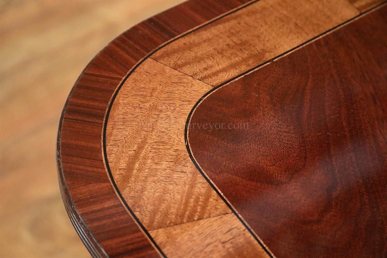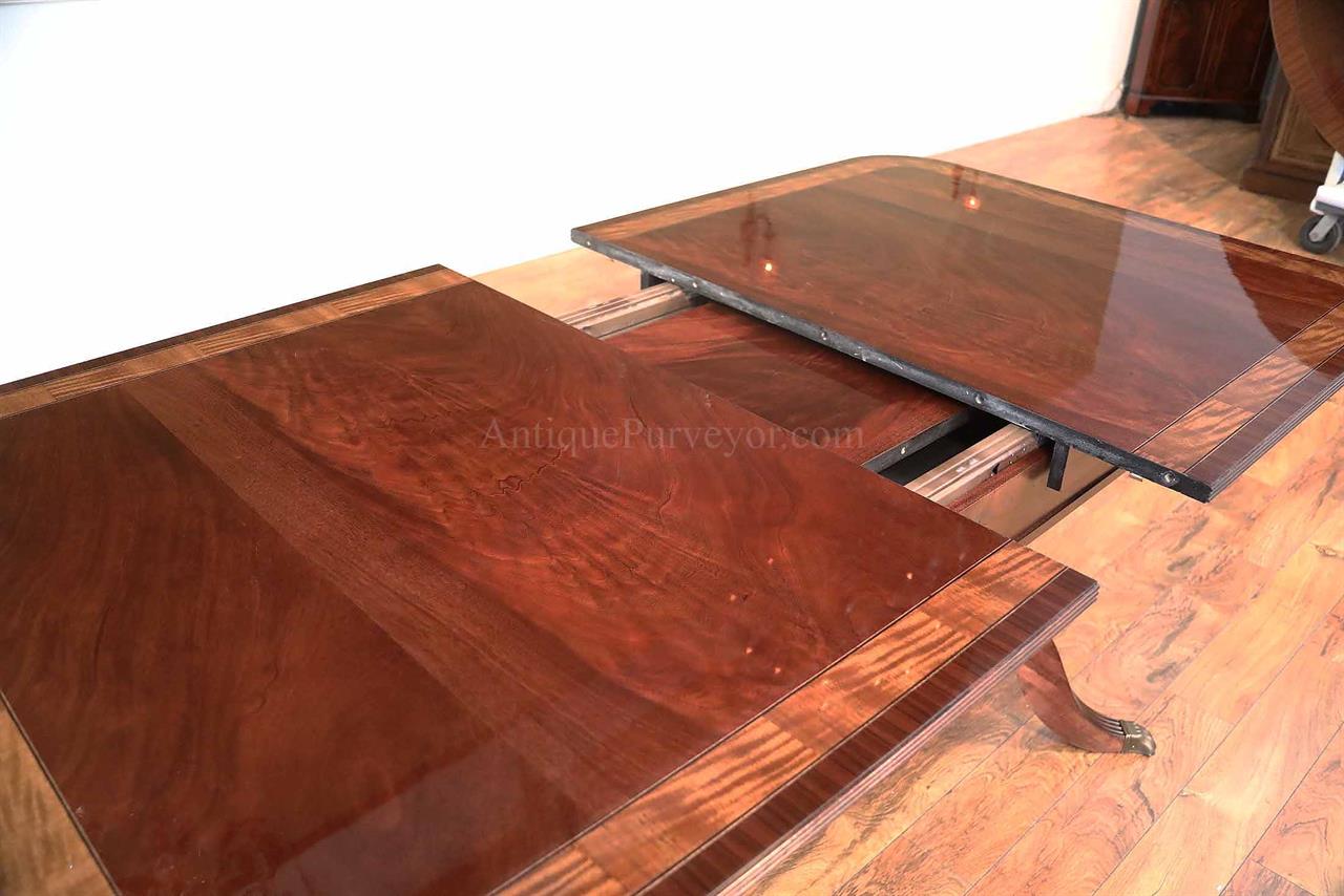 American made mahogany dining table with self-storing leaves. This table can be made with custom sizes and custom finishes. This model table was designed for a narrow dining space, so it is 44 inches wide. Most dining tables are 48 or better. This is a bench made mahogany dining table with a proven nitro cellulose finish. The table has a hand rubbed French polish appearance, but unlike a Shellac based finish this lacquer is much tougher. The field is loose crotch mahogany and the table is bordered with a satinwood and rosewood banding. A small black and white inlaid separater was done on both sides of the satinwood. Outside border is rosewood.