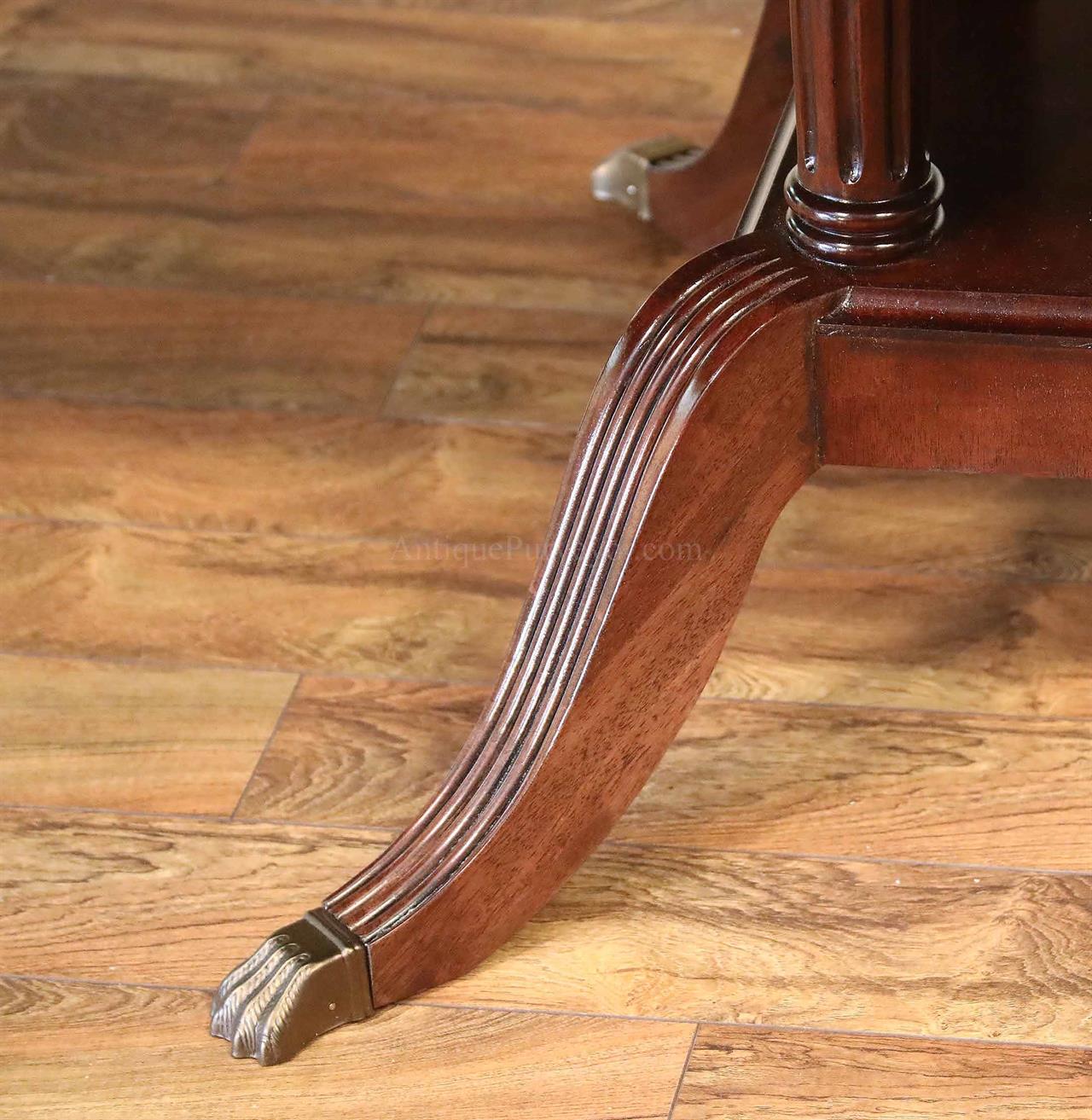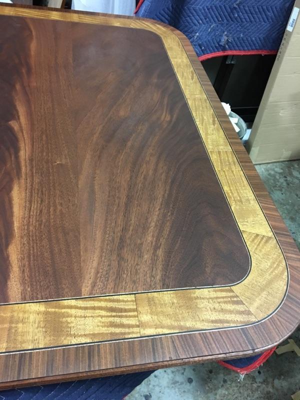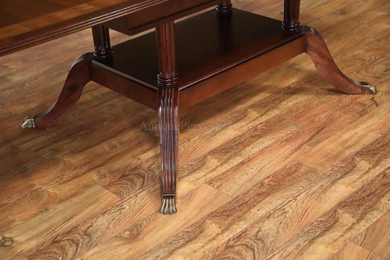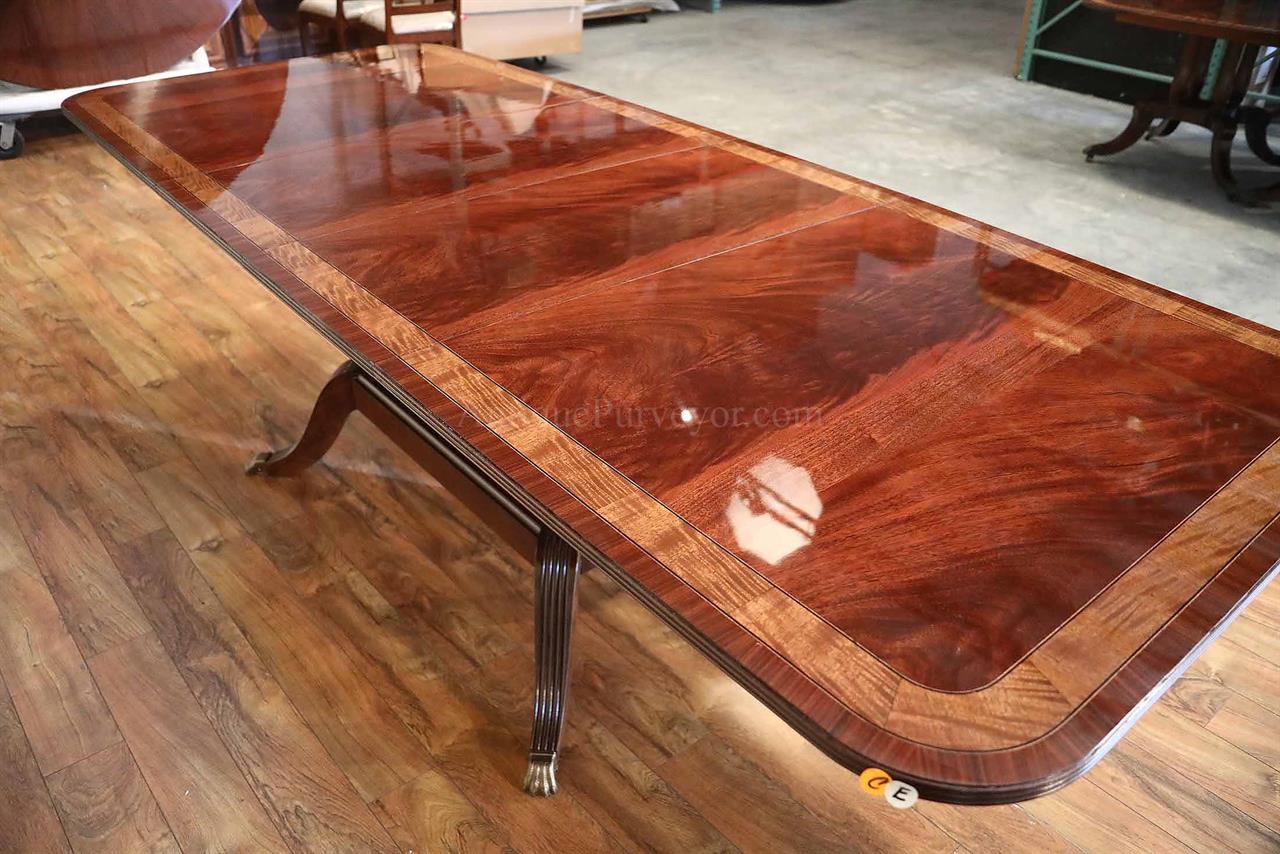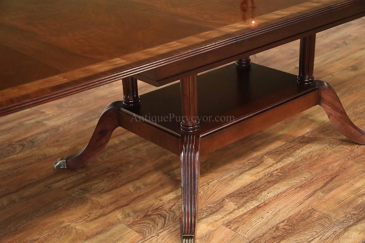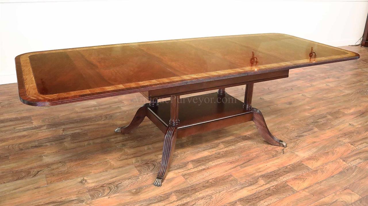 American made mahogany dining table with self-storing leaves. This table can be made with custom sizes and custom finishes. This model table was designed for a narrow dining space, so it is 44 inches wide. Most dining tables are 48 or better. This is a bench made mahogany dining table with a proven nitro cellulose finish. The table has a hand rubbed French polish appearance, but unlike a Shellac based finish this lacquer is much tougher. The field is loose crotch mahogany and the table is bordered with a satinwood and rosewood banding. A small black and white inlaid separater was done on both sides of the satinwood. Outside border is rosewood.