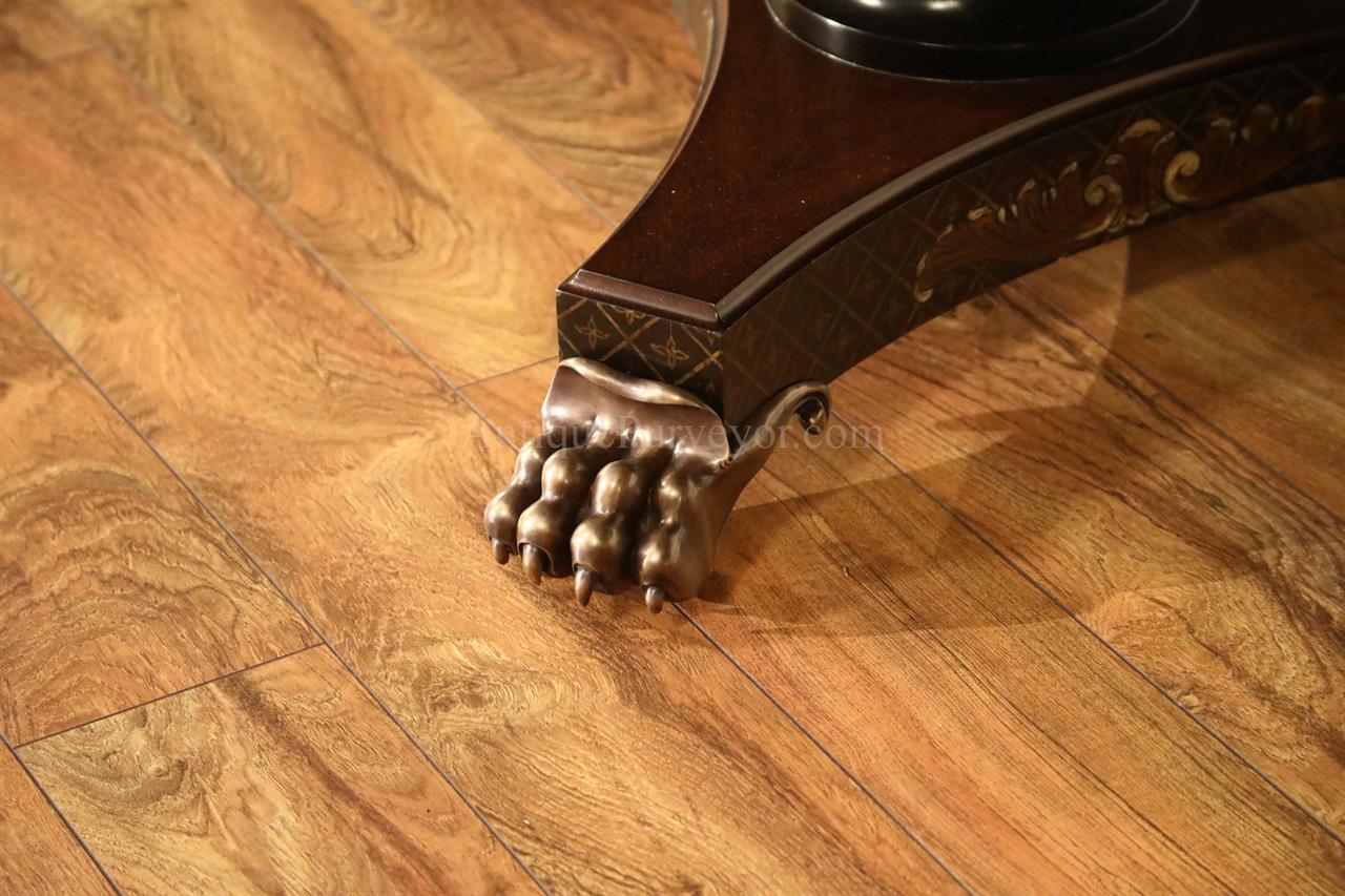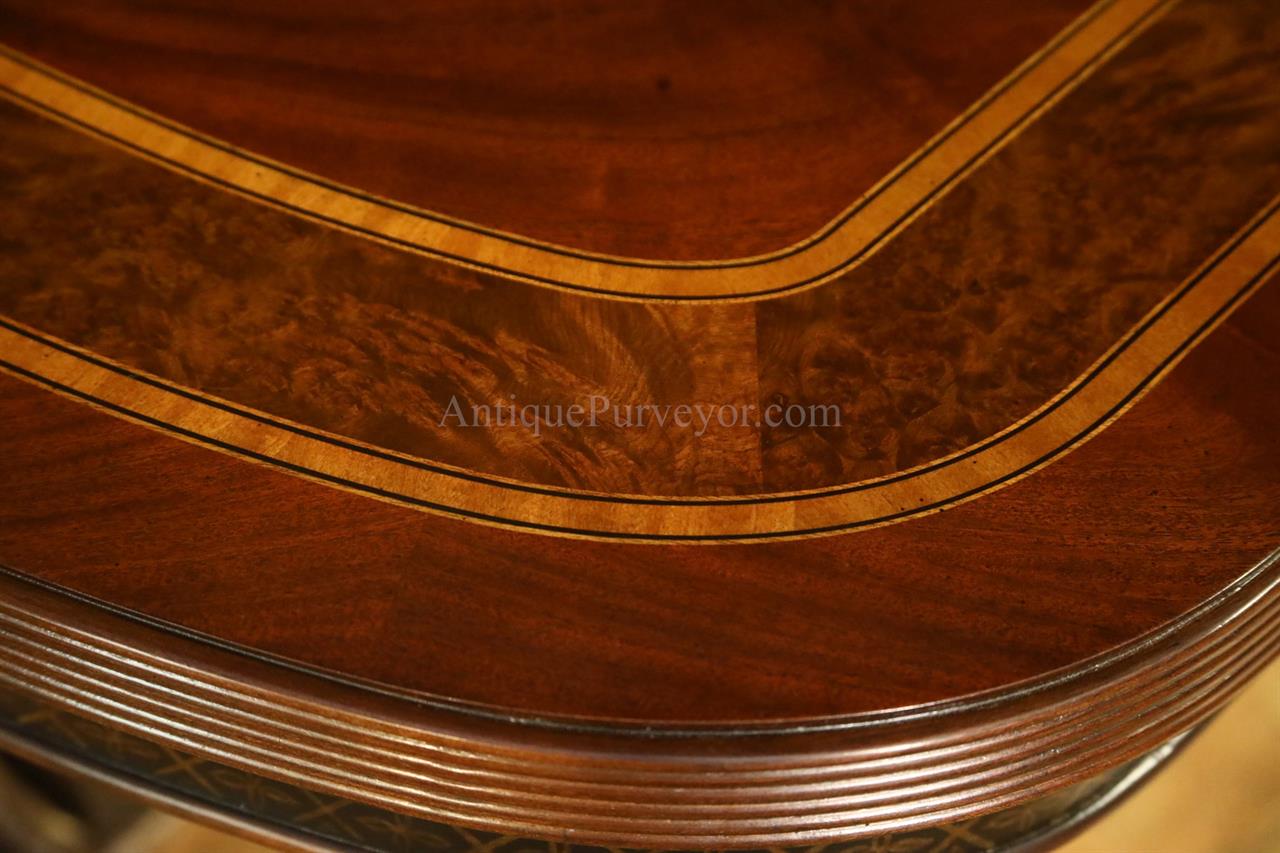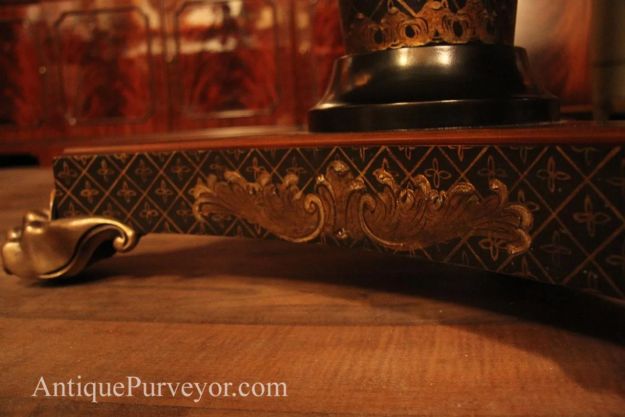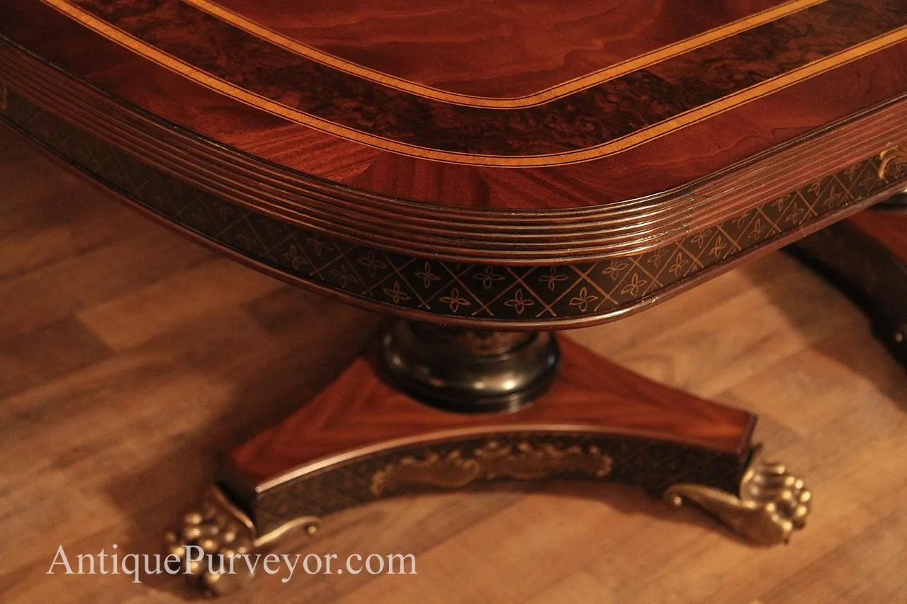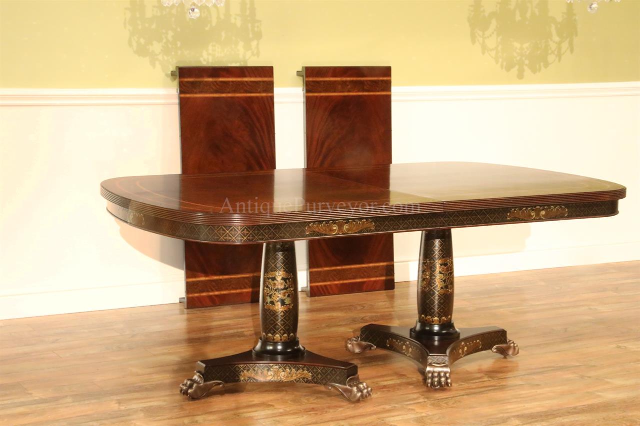 Gold, black, and brass accented Regency dining table with book matched and slip crotch mahogany veneer field, Chinoiserie details and solid brass Lion feet. Double pedestal mahogany dining table with 2 leaves seats 10-12 people. Amazing detailed table for a designer dining room. This table has an extra wide edge, which is nearly 2″ and the table also offers an apron with floral or fleur des le style handpainted details in gold and black. Multibanded with thin satinwood inlays, this table table is a show stopper from every angle. Make a fantastic designer dining room set with this table and upholstered dining room chairs which can be gayfully upholstered to really show off your space. Well made table with sturdy double pedestals and proudly overbuilt.