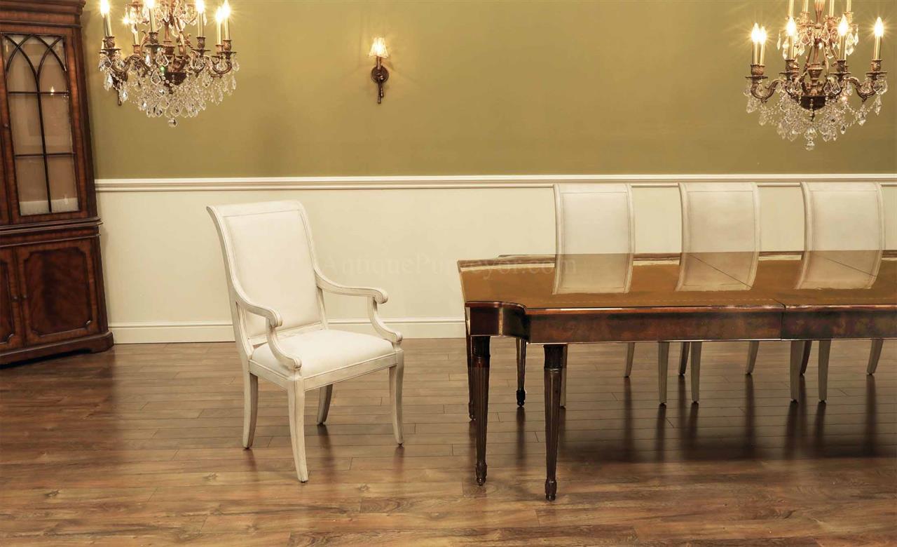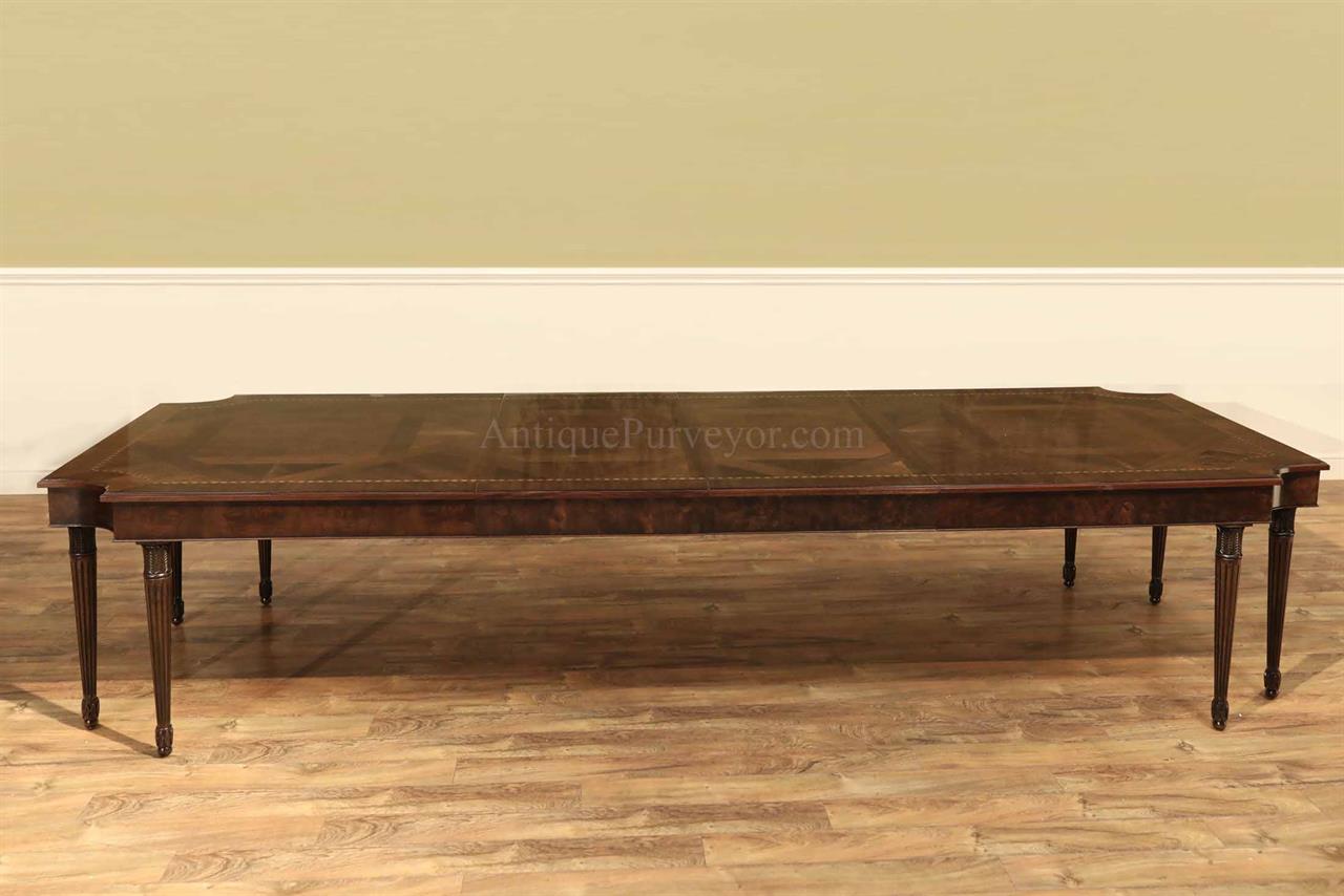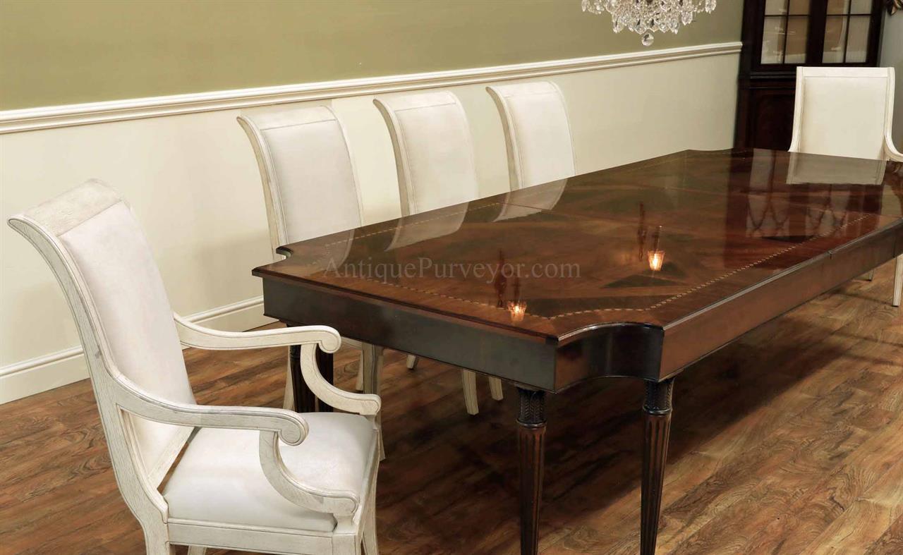 American made long French dining room table for a large dining room. This is a high end dining table. It has a nitro celluose lacquer finish which shines like glass. We can set up this table with a variety of chairs. We show the table with Neoclassical and empire style chairs in the pictures. Most of these chairs are available and they will all coordinate nicely. This table has a thin banding of ebony and satinwood with diamond shapes. Fantastic table made with impeccable american craftsmanship for the elegant household. Table stands on French style fluted legs and it comes standard with two leaves. This table is made from walnut solids and walnut Veneers by a prominent American builder.