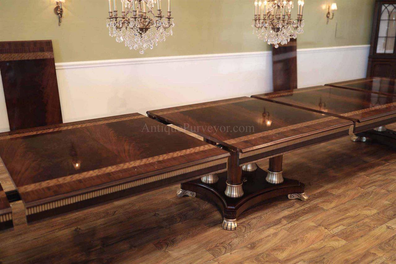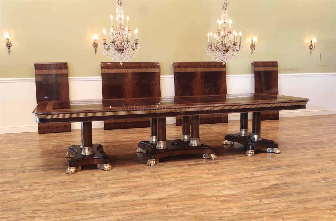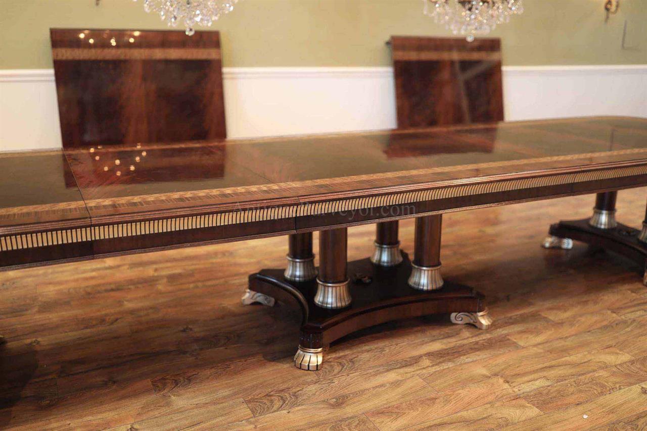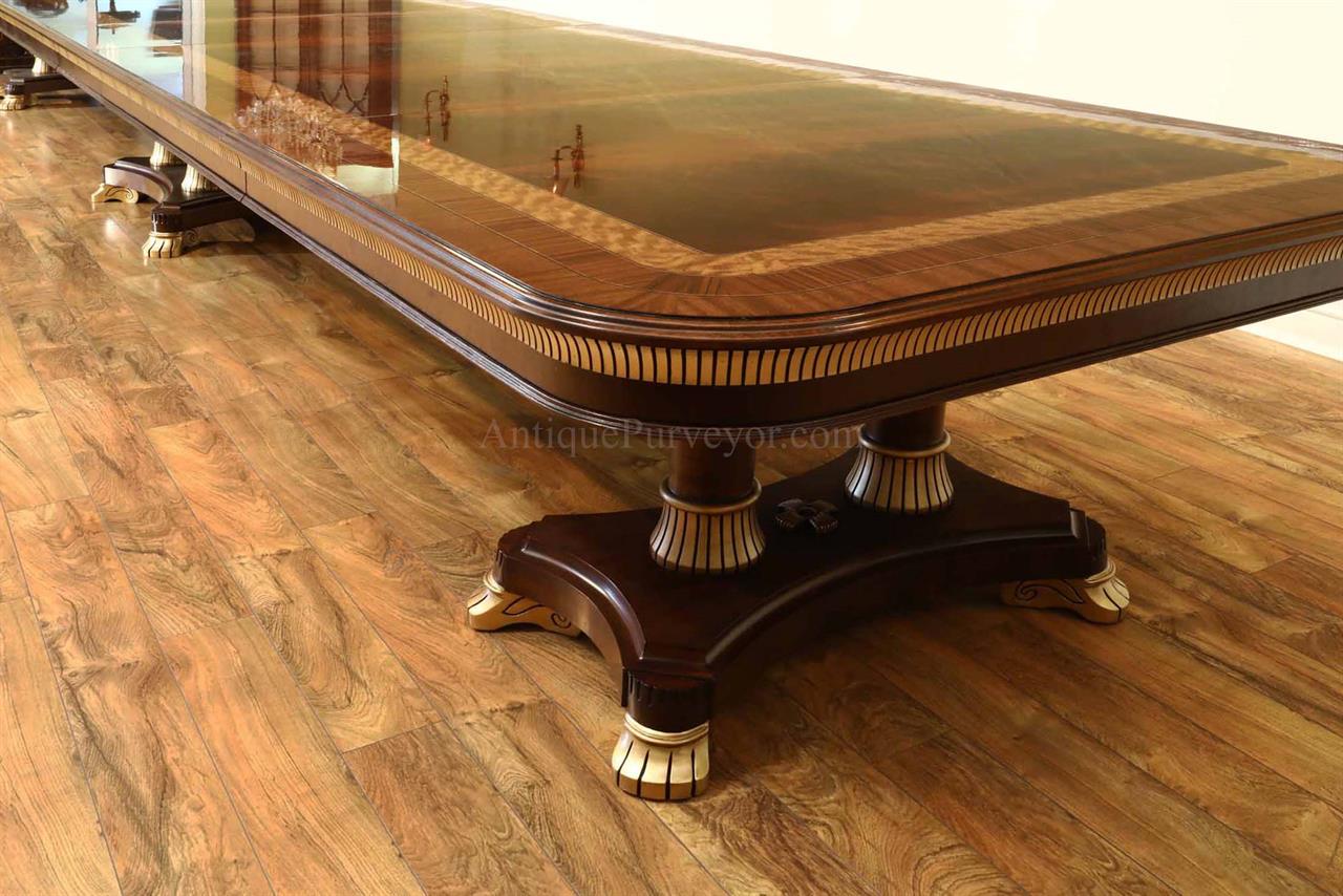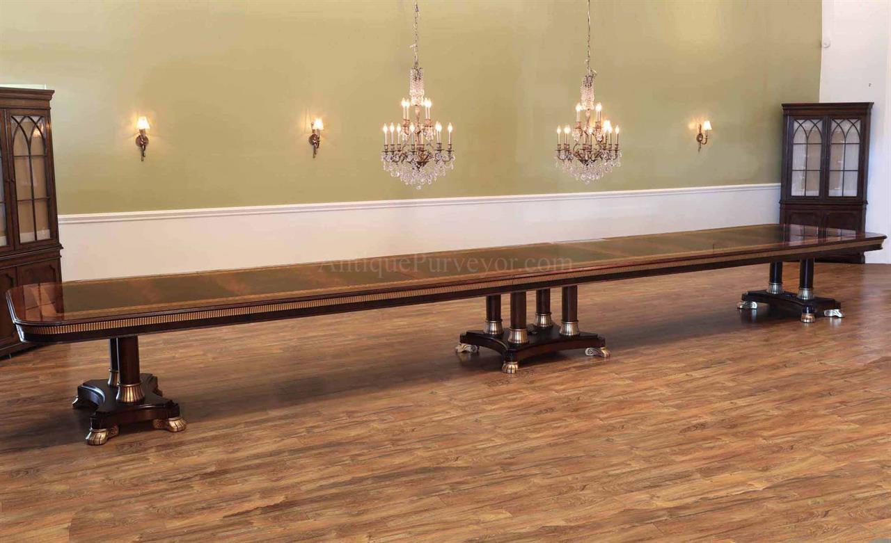 Extra-large 24-foot mahogany dining table for a stately dining room, an AP Exclusive by AntiquePurveyor. This high-end mahogany dining table can be configured in a room from 12 feet long to 24 feet long, in 3-foot increments. The table is 54″ wide. The heavy mahogany pedestal bases feature double columns at the ends and four columns at the center pedestal, providing a wide footprint that holds the table solid in any configuration. Table slides are made of heavy, American-made steel and are very sturdy. The apron, which surrounds the table, features a profile similar to dental molding found in traditional homes. The updated and modernized Regency-style pedestal, featuring fine cast brass mounts, was crafted using lost wax techniques. The tabletop features a natural color palette, showcasing colors of red, orange, yellow, and brown. The table is finished with satin nitrocellulose lacquer, and the tabletop is polished to a 60% gloss, allowing light to reach the rich and lively wood grain.