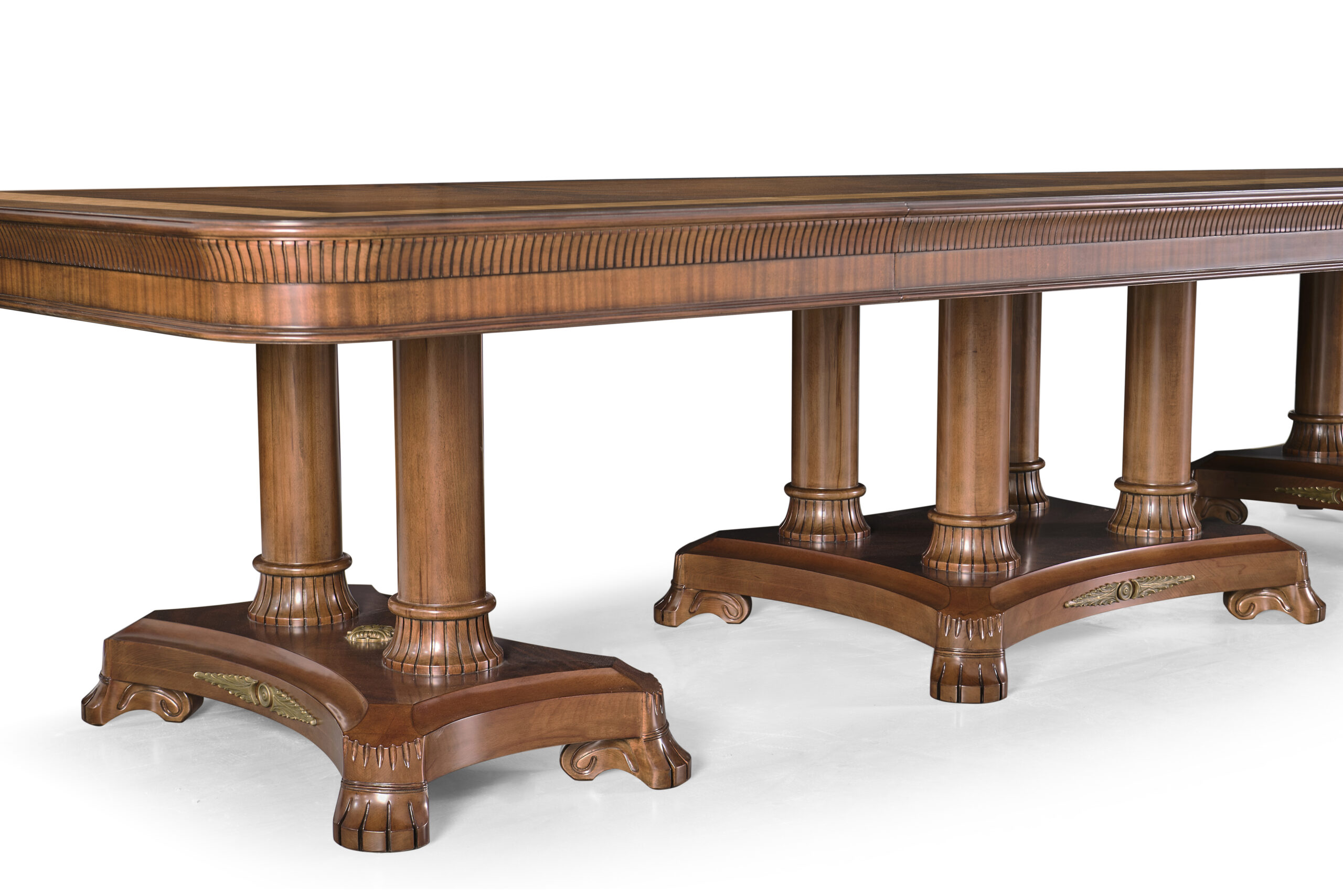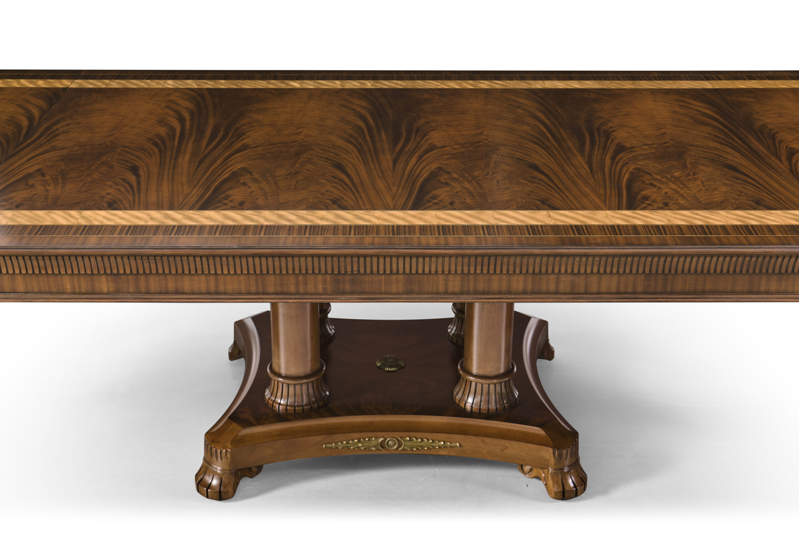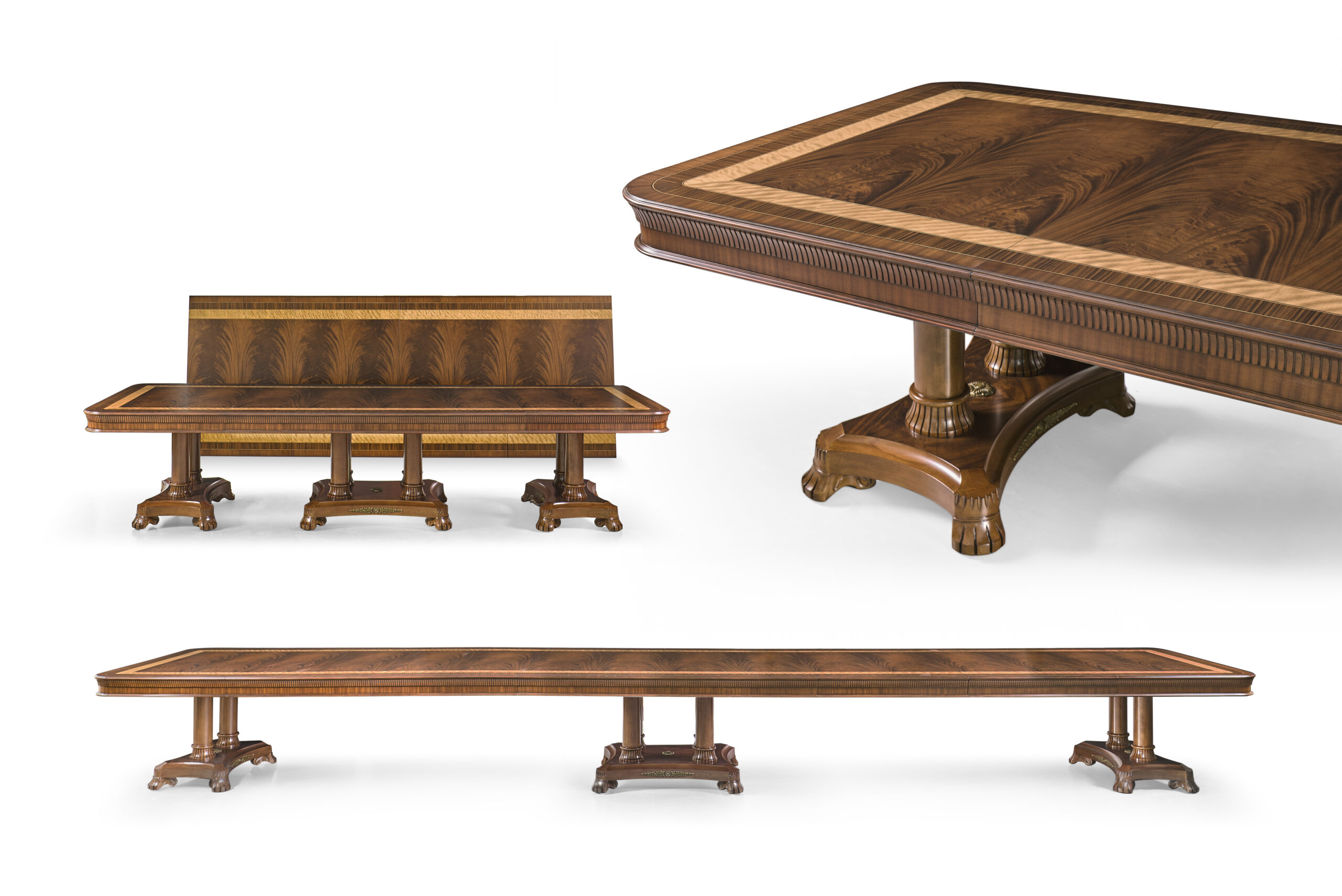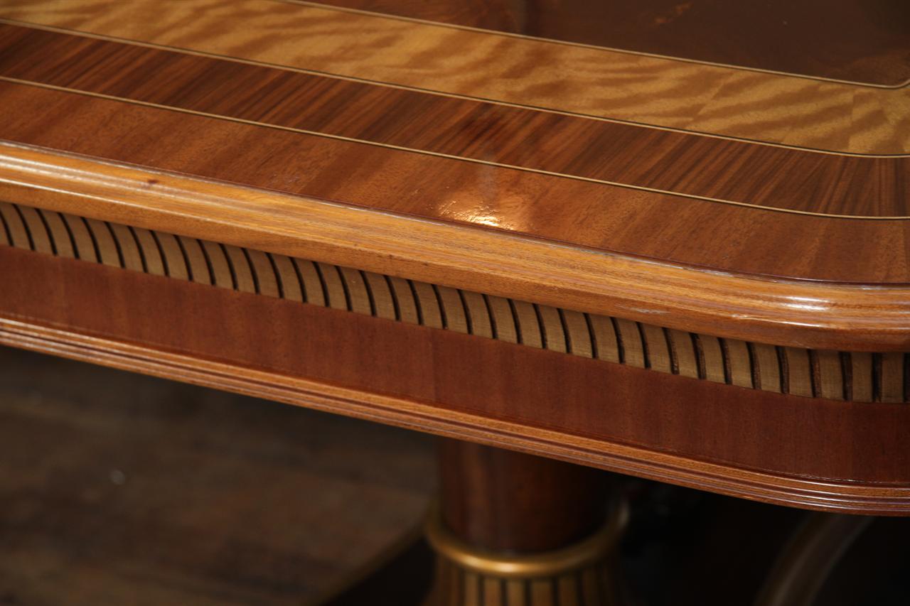 Extra-large 24-foot mahogany dining table for a stately dining room, an AP Exclusive by AntiquePurveyor. This high-end mahogany dining table can be configured in a room from 12 feet long to 24 feet long, in 3-foot increments. The table is 54″ wide. The heavy mahogany pedestal bases feature double columns at the ends and four columns at the center pedestal, providing a wide footprint that holds the table solid in any configuration. Table slides are made of heavy, American-made steel and are very sturdy. The apron, which surrounds the table, features a profile similar to dental molding found in traditional homes. The updated and modernized Regency-style pedestal, featuring fine cast brass mounts, was crafted using lost wax techniques. The tabletop features a natural color palette, showcasing colors of red, orange, yellow, and brown. The table is finished with satin nitrocellulose lacquer, and the tabletop is polished to a 60% gloss, allowing light to reach the rich and lively wood grain.