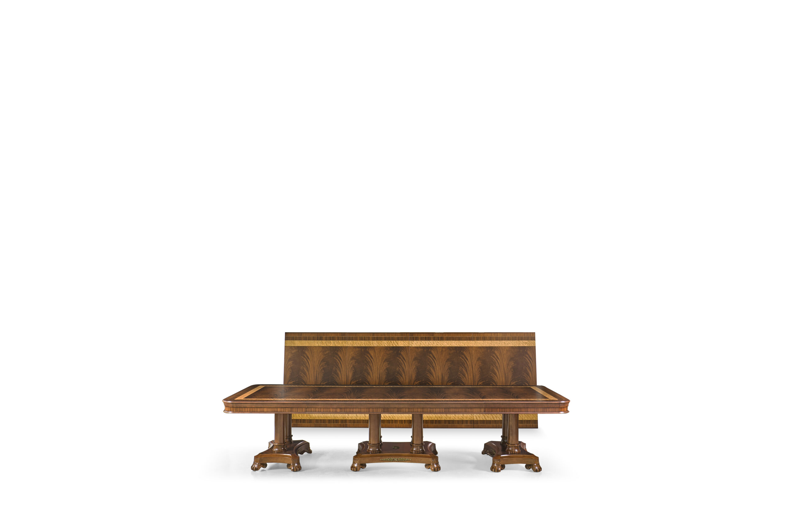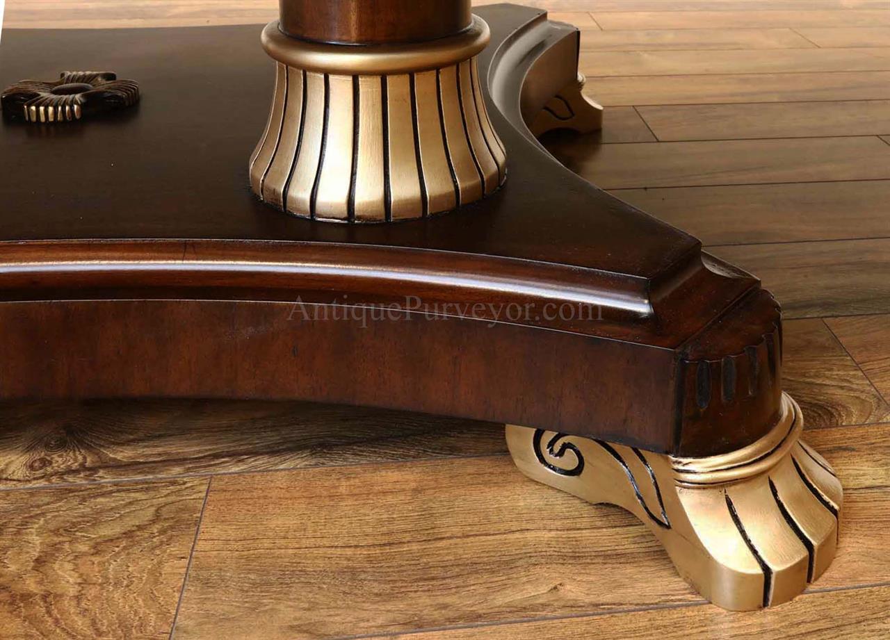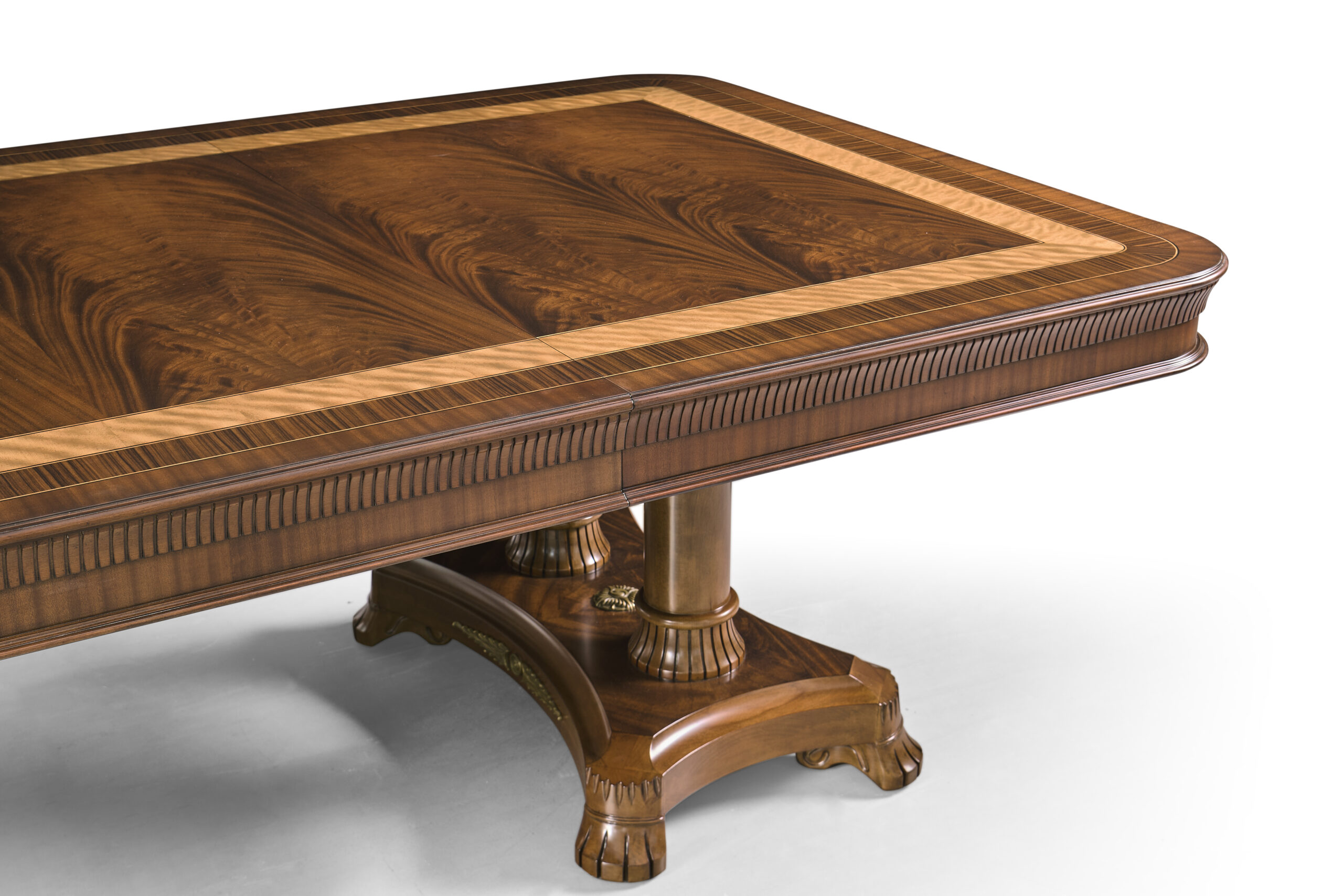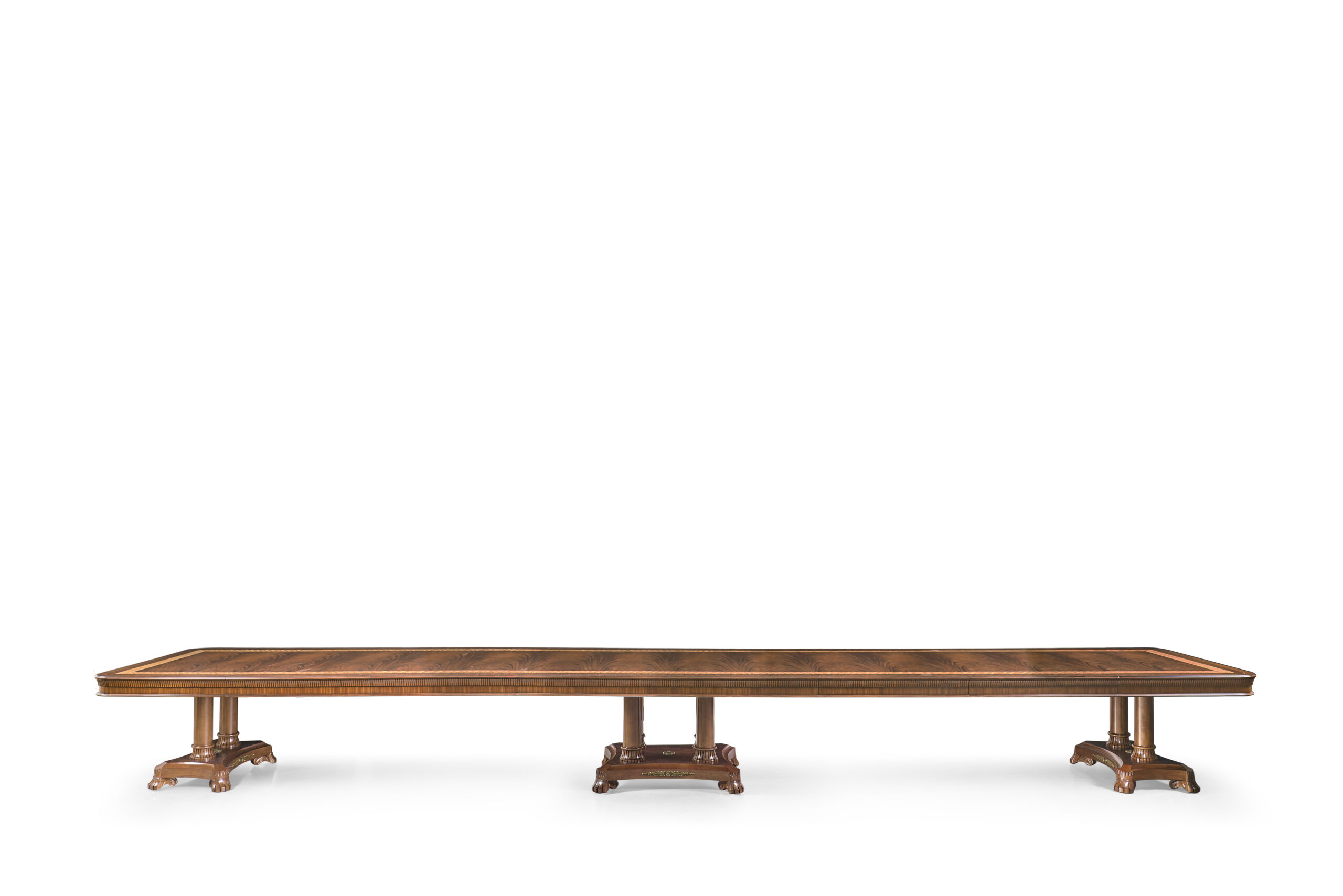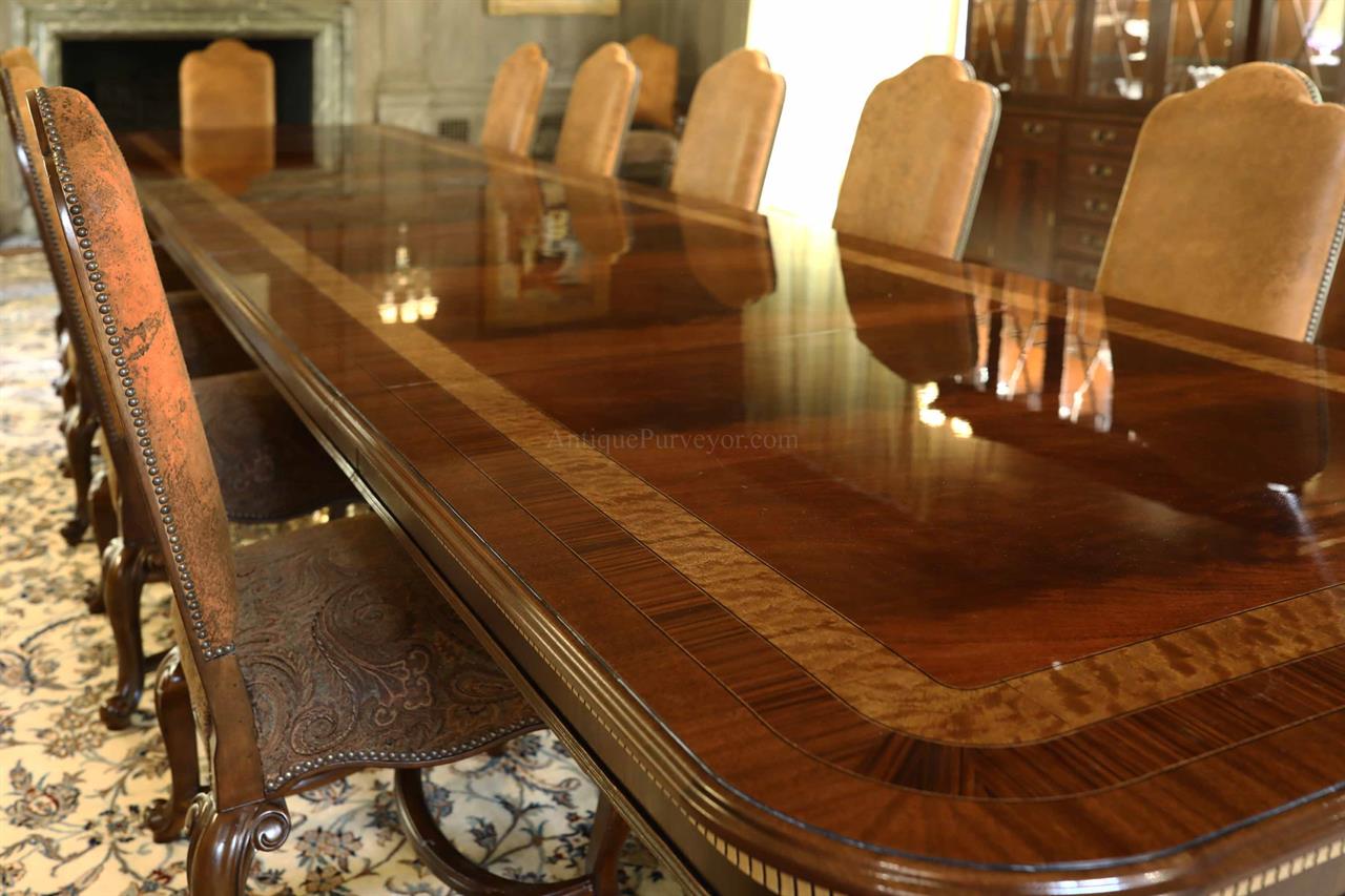 Extra-large 24-foot mahogany dining table for a stately dining room, an AP Exclusive by AntiquePurveyor. This high-end mahogany dining table can be configured in a room from 12 feet long to 24 feet long, in 3-foot increments. The table is 54″ wide. The heavy mahogany pedestal bases feature double columns at the ends and four columns at the center pedestal, providing a wide footprint that holds the table solid in any configuration. Table slides are made of heavy, American-made steel and are very sturdy. The apron, which surrounds the table, features a profile similar to dental molding found in traditional homes. The updated and modernized Regency-style pedestal, featuring fine cast brass mounts, was crafted using lost wax techniques. The tabletop features a natural color palette, showcasing colors of red, orange, yellow, and brown. The table is finished with satin nitrocellulose lacquer, and the tabletop is polished to a 60% gloss, allowing light to reach the rich and lively wood grain.