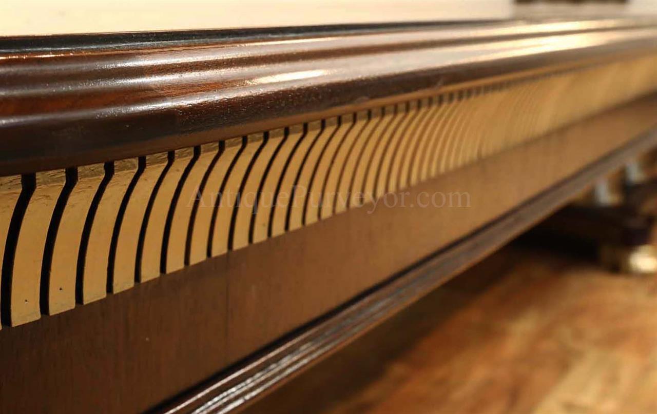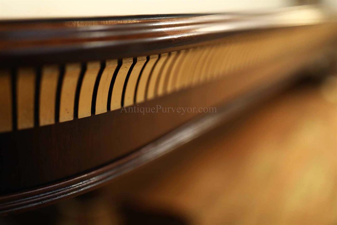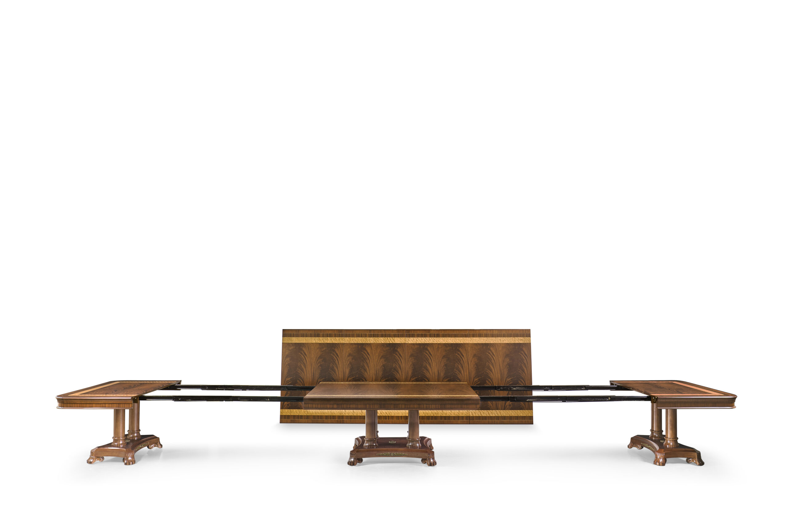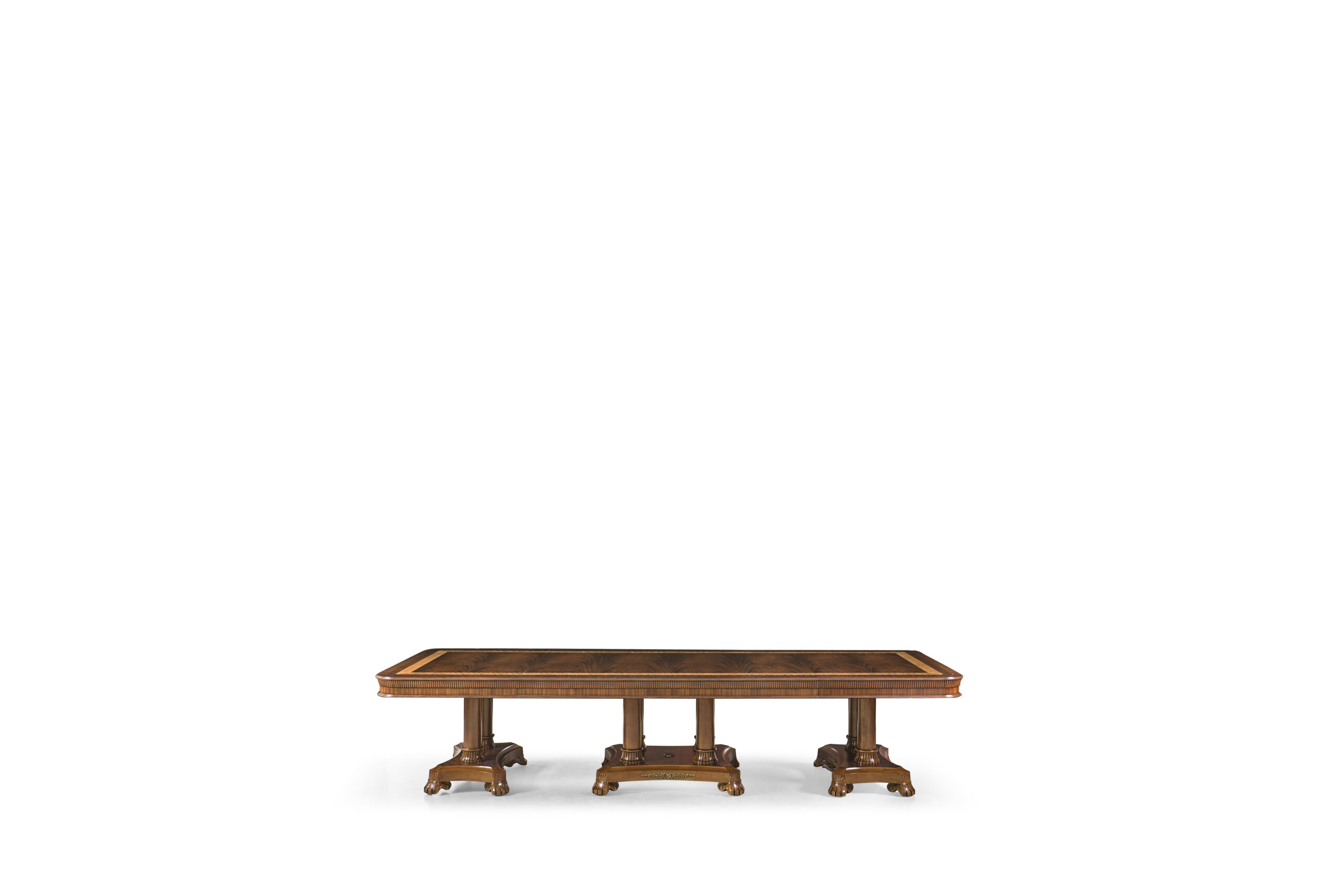 Extra-large 24-foot mahogany dining table for a stately dining room, an AP Exclusive by AntiquePurveyor. This high-end mahogany dining table can be configured in a room from 12 feet long to 24 feet long, in 3-foot increments. The table is 54″ wide. The heavy mahogany pedestal bases feature double columns at the ends and four columns at the center pedestal, providing a wide footprint that holds the table solid in any configuration. Table slides are made of heavy, American-made steel and are very sturdy. The apron, which surrounds the table, features a profile similar to dental molding found in traditional homes. The updated and modernized Regency-style pedestal, featuring fine cast brass mounts, was crafted using lost wax techniques. The tabletop features a natural color palette, showcasing colors of red, orange, yellow, and brown. The table is finished with satin nitrocellulose lacquer, and the tabletop is polished to a 60% gloss, allowing light to reach the rich and lively wood grain.
