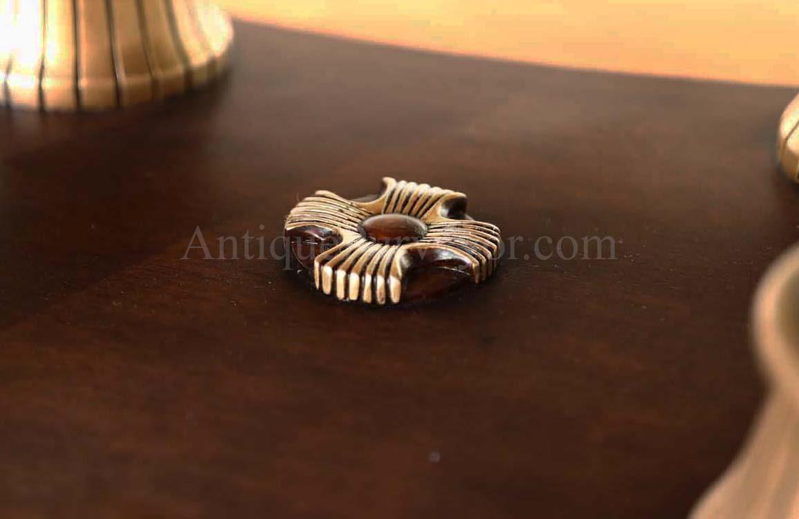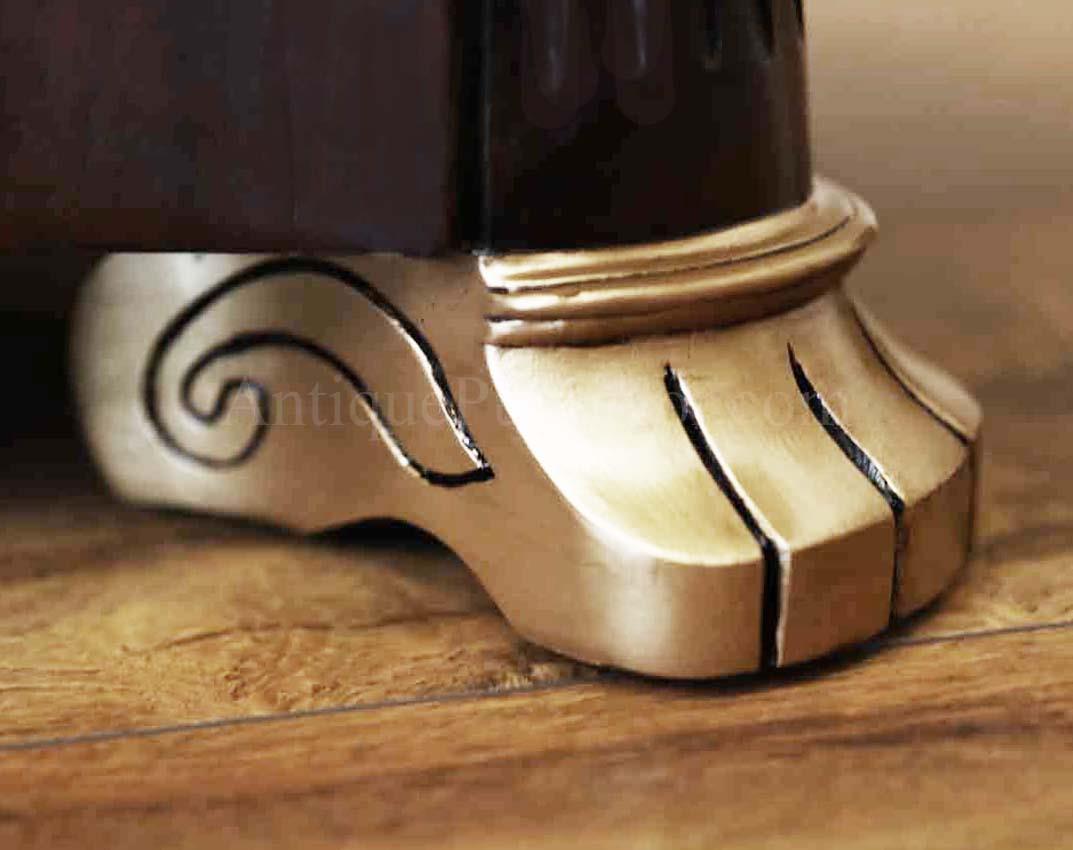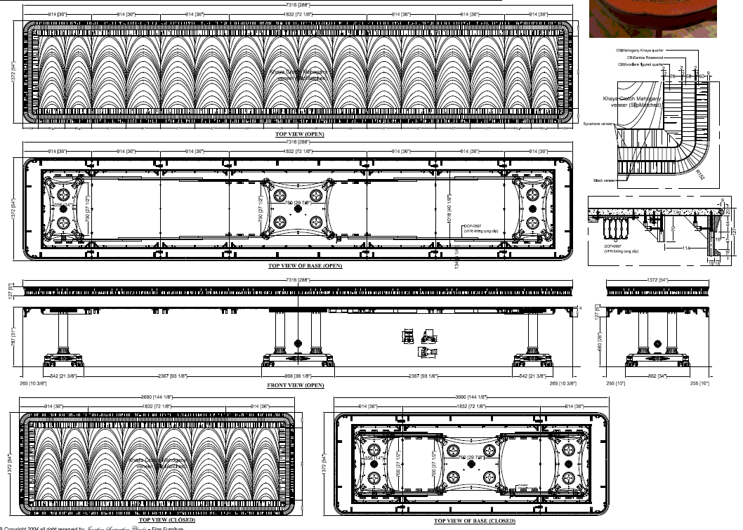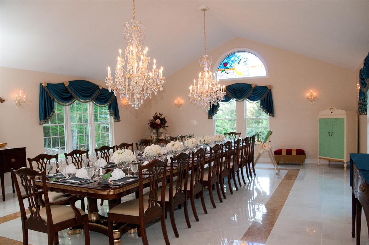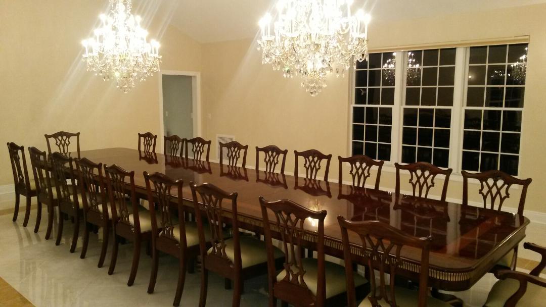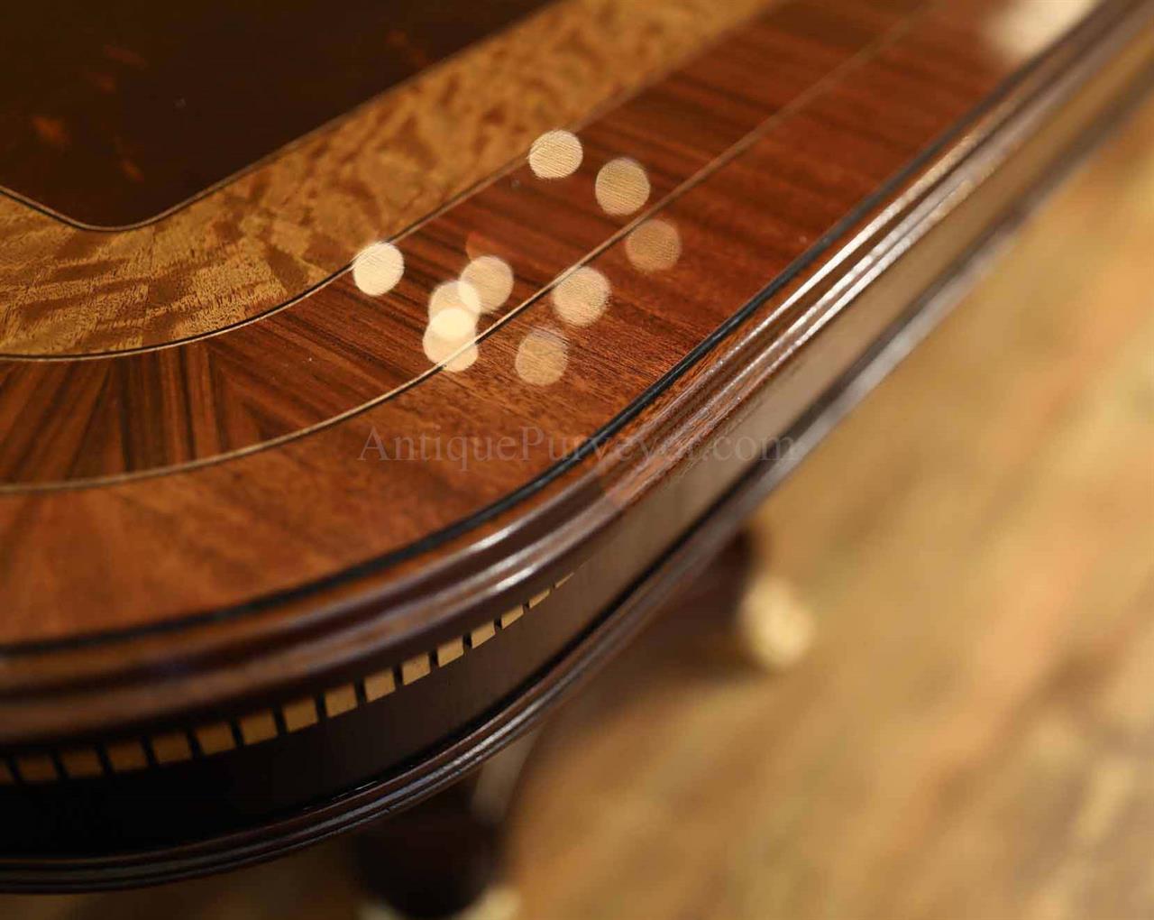 Extra-large 24-foot mahogany dining table for a stately dining room, an AP Exclusive by AntiquePurveyor. This high-end mahogany dining table can be configured in a room from 12 feet long to 24 feet long, in 3-foot increments. The table is 54″ wide. The heavy mahogany pedestal bases feature double columns at the ends and four columns at the center pedestal, providing a wide footprint that holds the table solid in any configuration. Table slides are made of heavy, American-made steel and are very sturdy. The apron, which surrounds the table, features a profile similar to dental molding found in traditional homes. The updated and modernized Regency-style pedestal, featuring fine cast brass mounts, was crafted using lost wax techniques. The tabletop features a natural color palette, showcasing colors of red, orange, yellow, and brown. The table is finished with satin nitrocellulose lacquer, and the tabletop is polished to a 60% gloss, allowing light to reach the rich and lively wood grain.