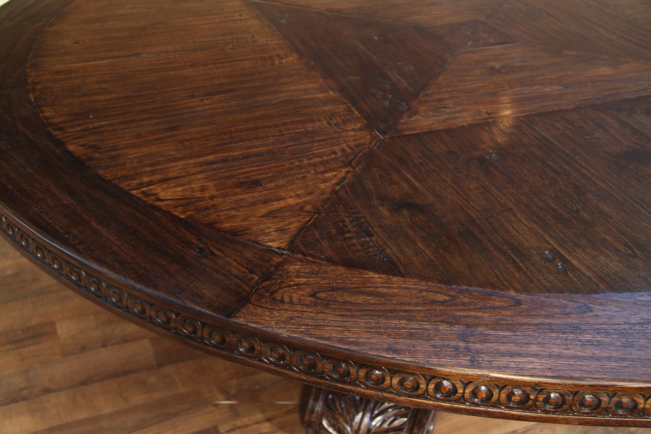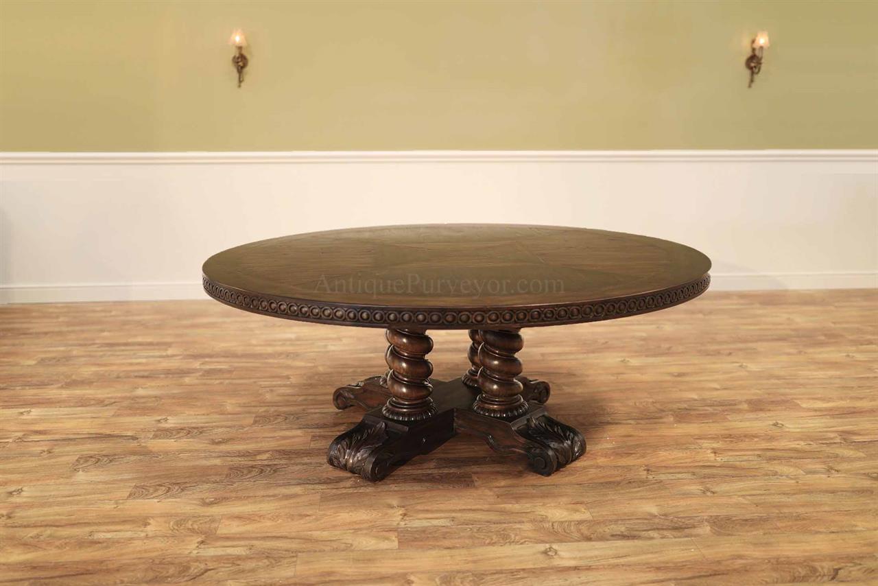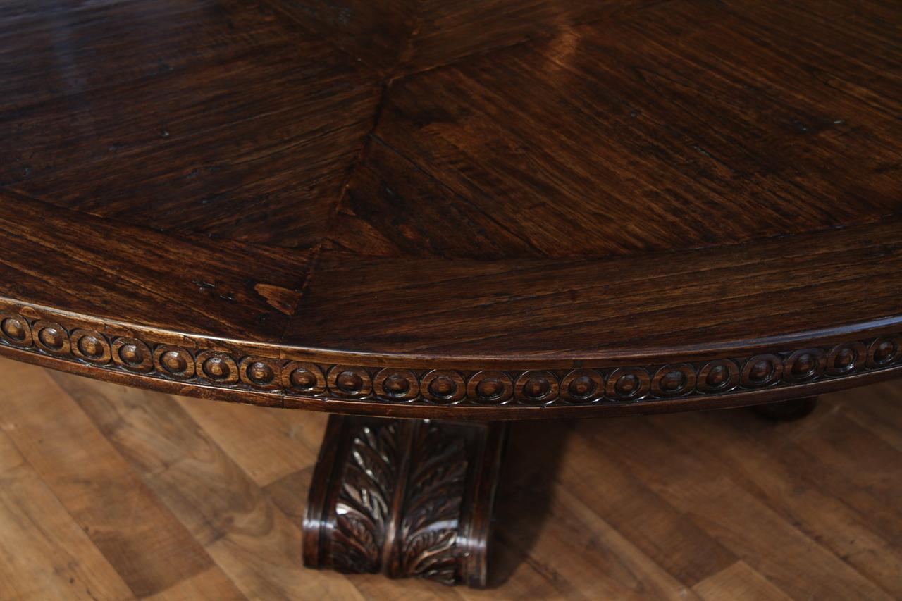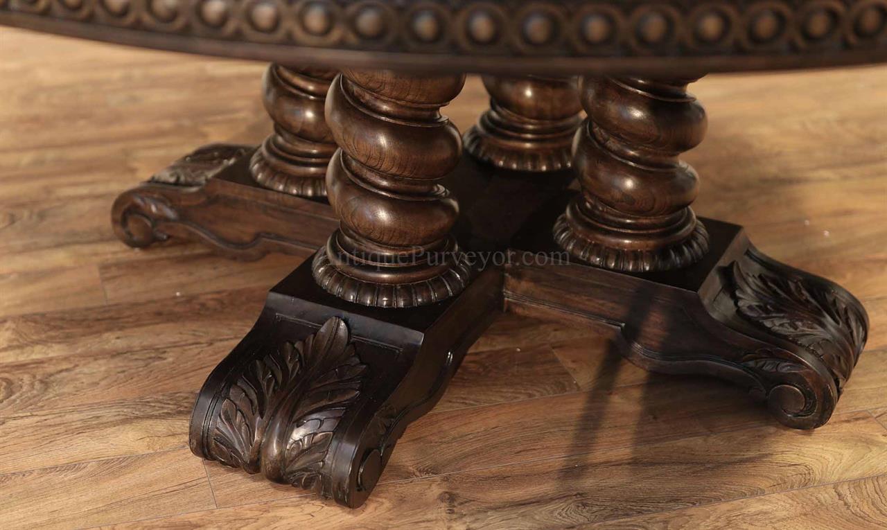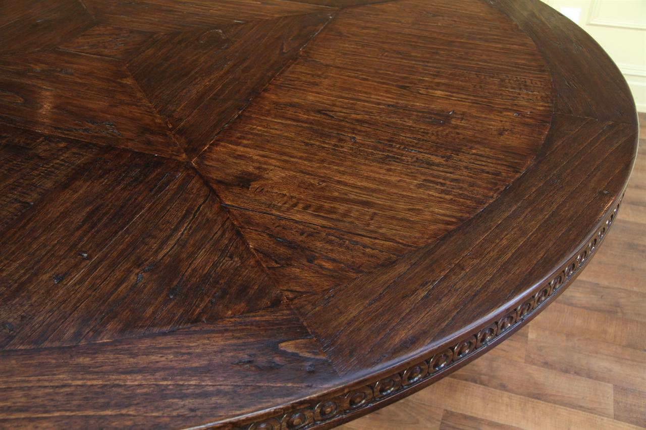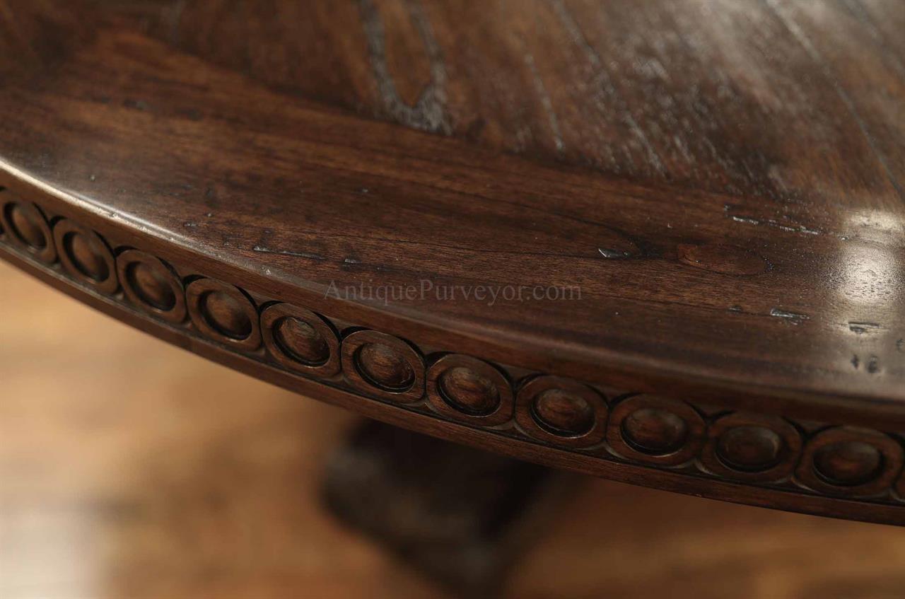 Large 86 inch round solid oak rustic dining table finished in rich walnut. Rustic and family proof casual finish. This is a heavy table and pedestal. The table and pedestal weigh 385 pounds. It is very sturdy. The edge of the table is carved with decorative shapes and the heavy rope turn pedestal columns are very significant. This table was photographed in our studio and the white particles you see in the pictures is dust. The finish is rich dark brown. Great table for a walnut dining space. The Lazy susan you see pictured with this table is available as a seperate purchase. It is not included in the sale of this item.