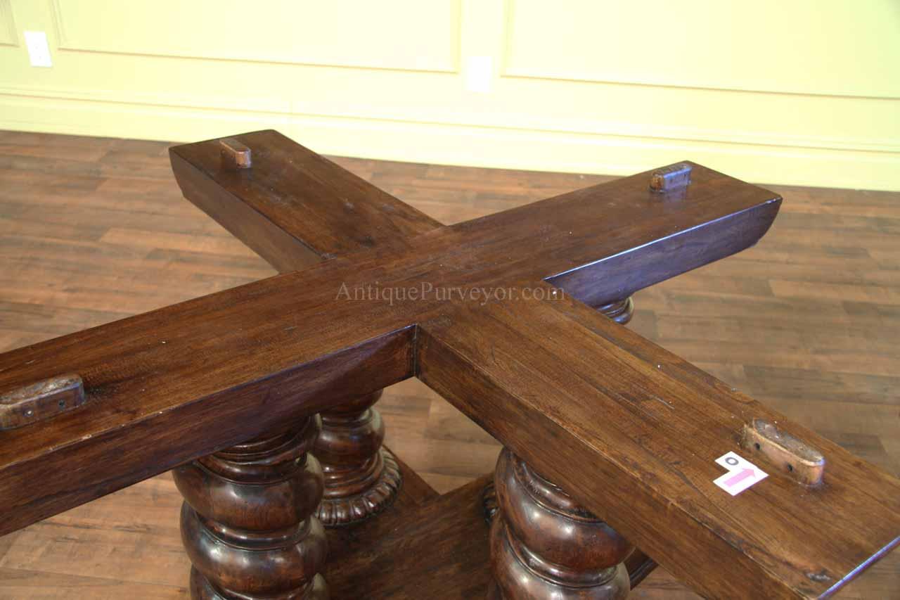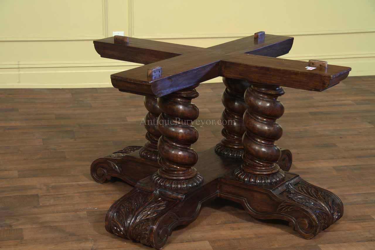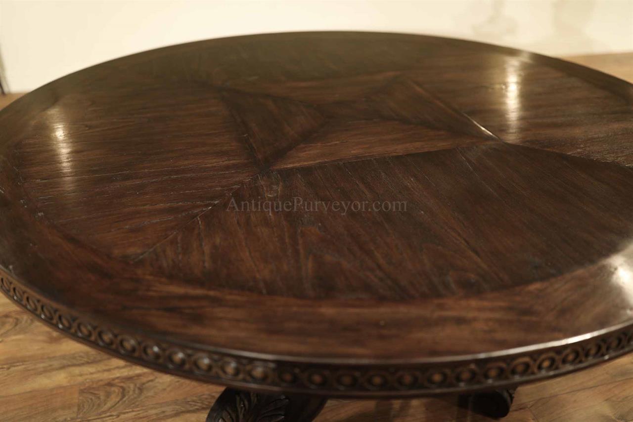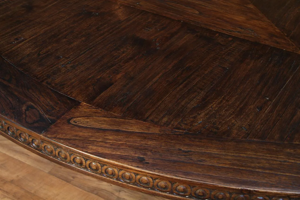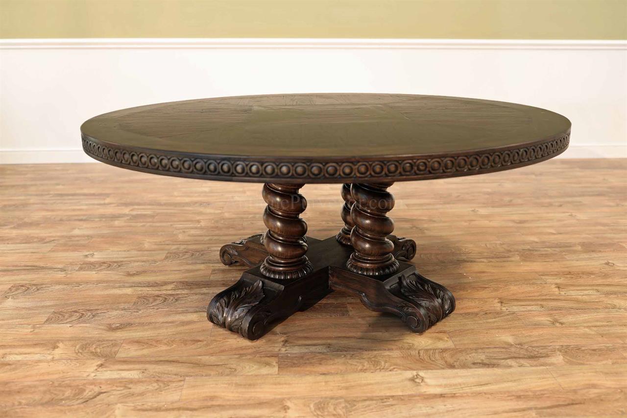 Large 86 inch round solid oak rustic dining table finished in rich walnut. Rustic and family proof casual finish. This is a heavy table and pedestal. The table and pedestal weigh 385 pounds. It is very sturdy. The edge of the table is carved with decorative shapes and the heavy rope turn pedestal columns are very significant. This table was photographed in our studio and the white particles you see in the pictures is dust. The finish is rich dark brown. Great table for a walnut dining space. The Lazy susan you see pictured with this table is available as a seperate purchase. It is not included in the sale of this item.