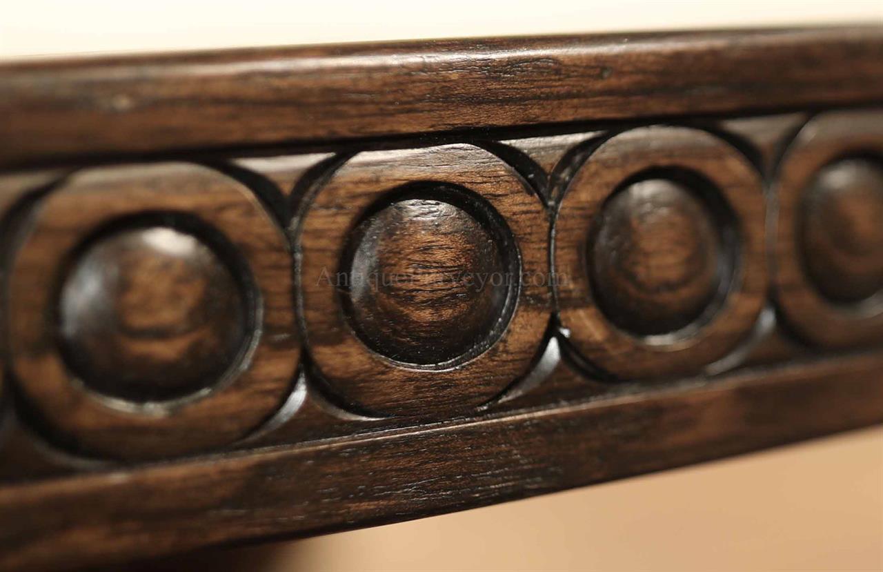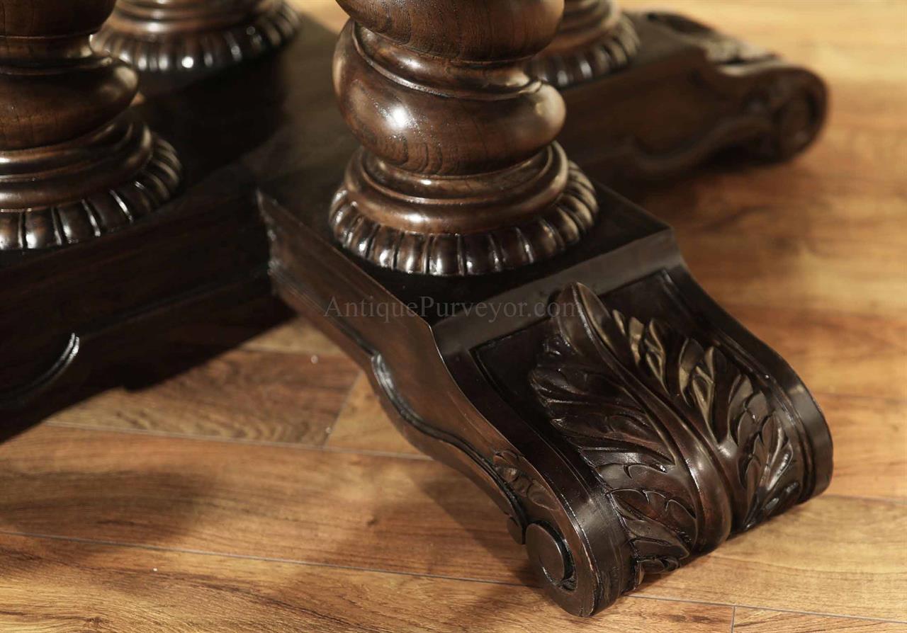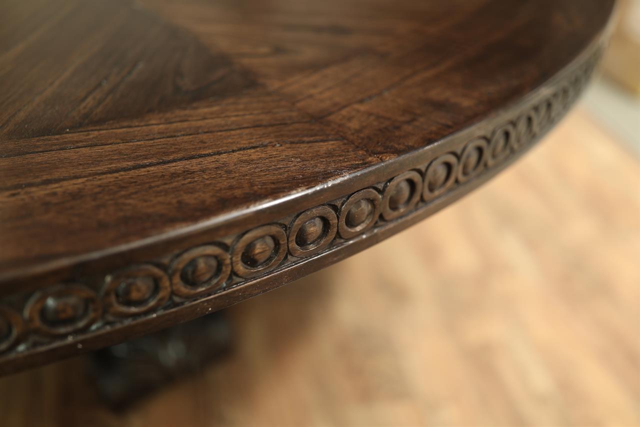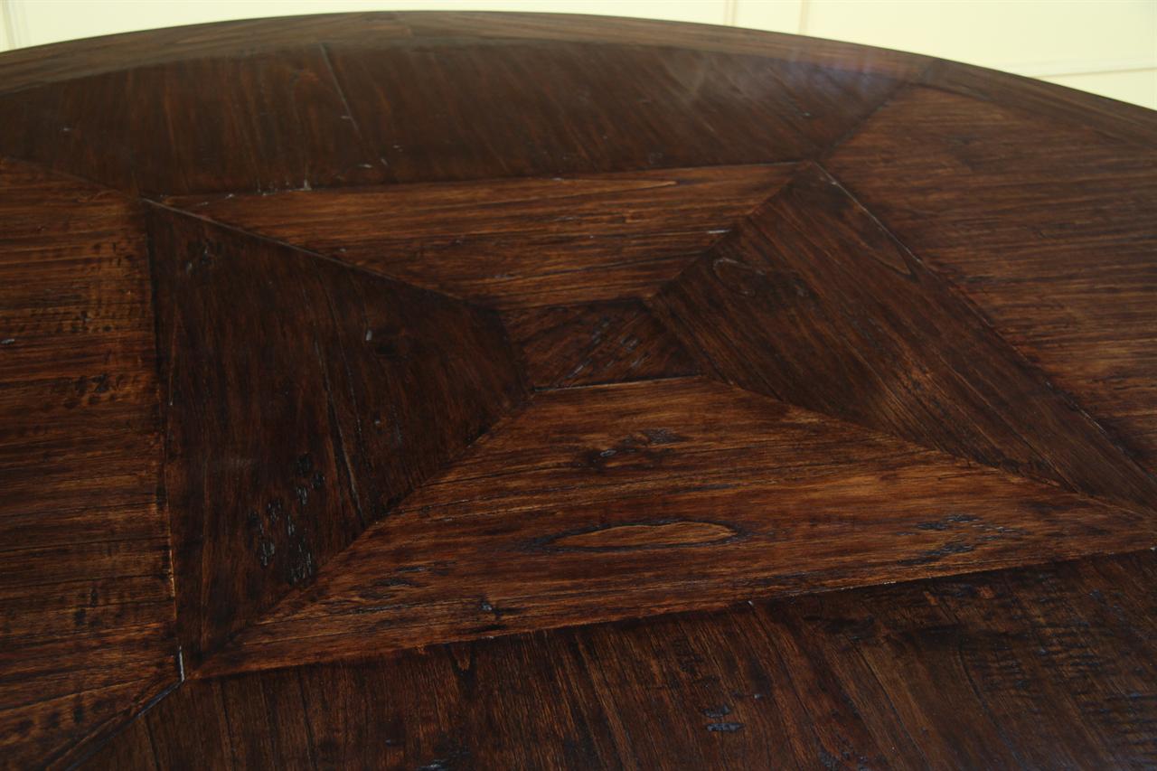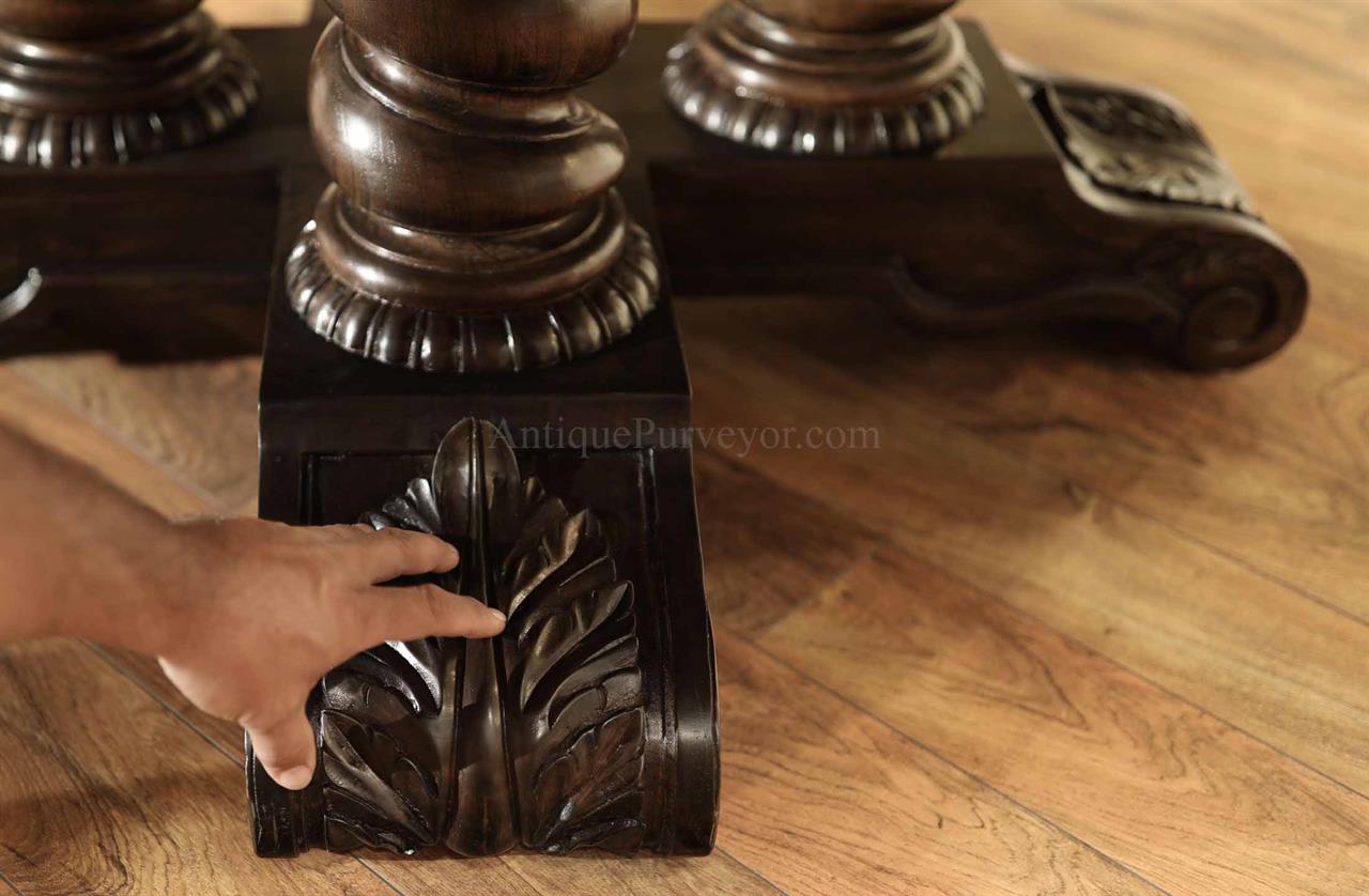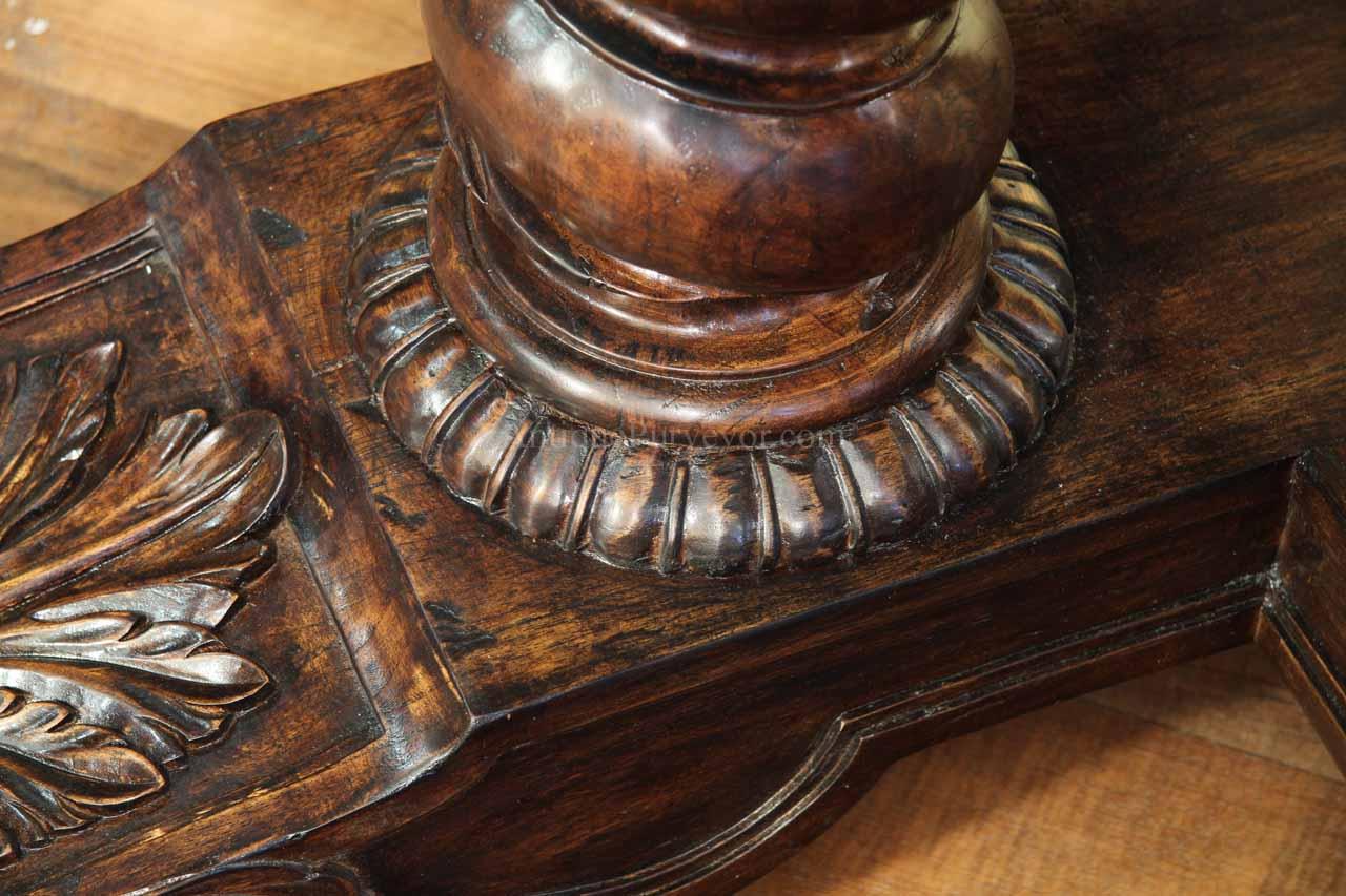 Large 86 inch round solid oak rustic dining table finished in rich walnut. Rustic and family proof casual finish. This is a heavy table and pedestal. The table and pedestal weigh 385 pounds. It is very sturdy. The edge of the table is carved with decorative shapes and the heavy rope turn pedestal columns are very significant. This table was photographed in our studio and the white particles you see in the pictures is dust. The finish is rich dark brown. Great table for a walnut dining space. The Lazy susan you see pictured with this table is available as a seperate purchase. It is not included in the sale of this item.