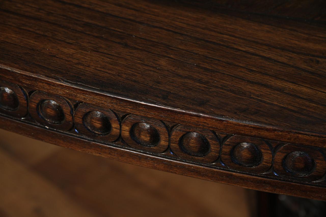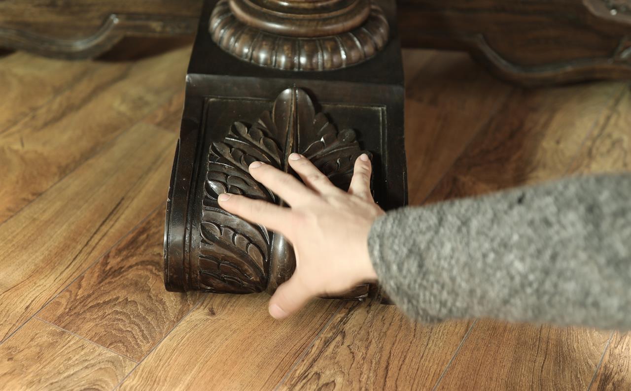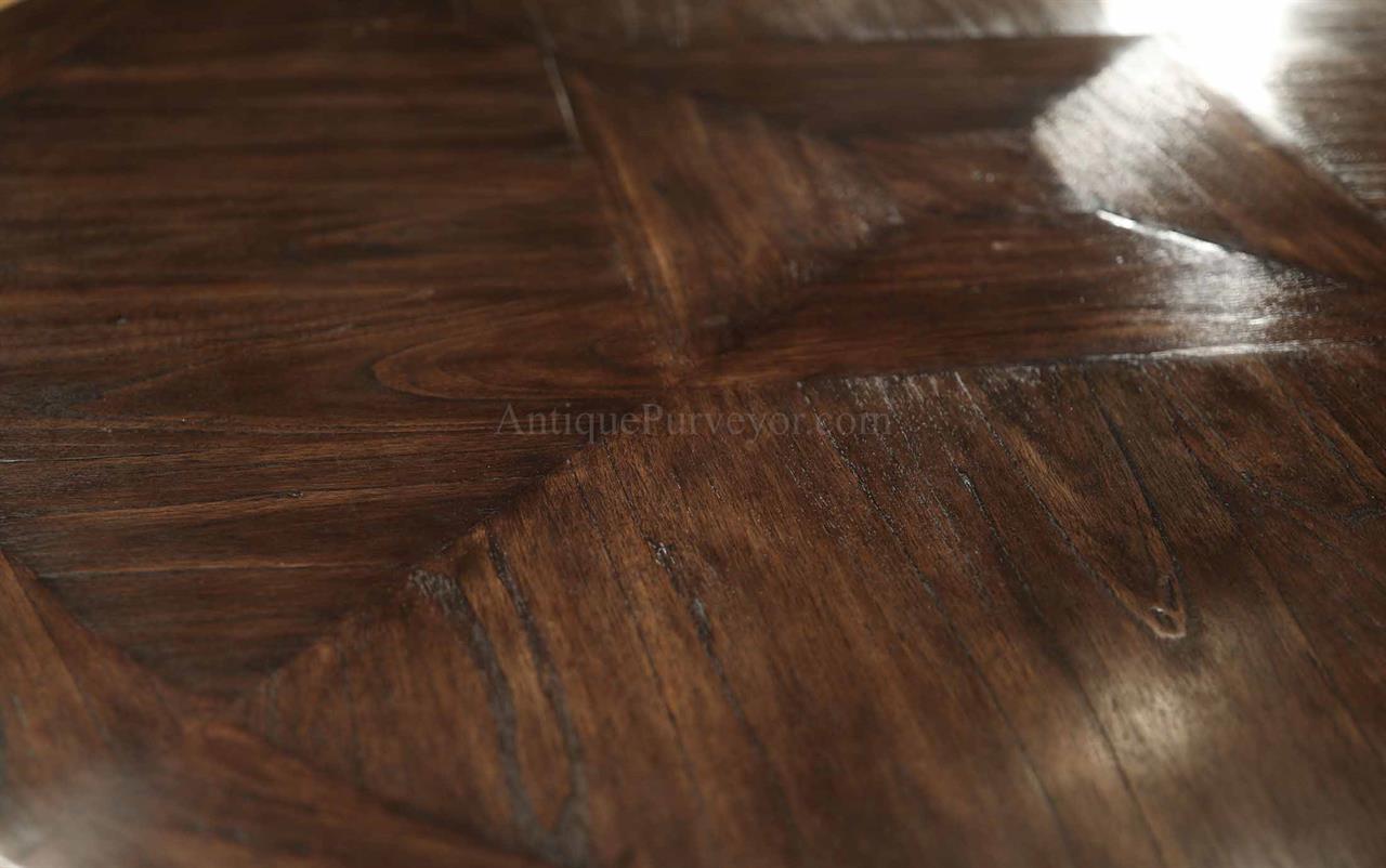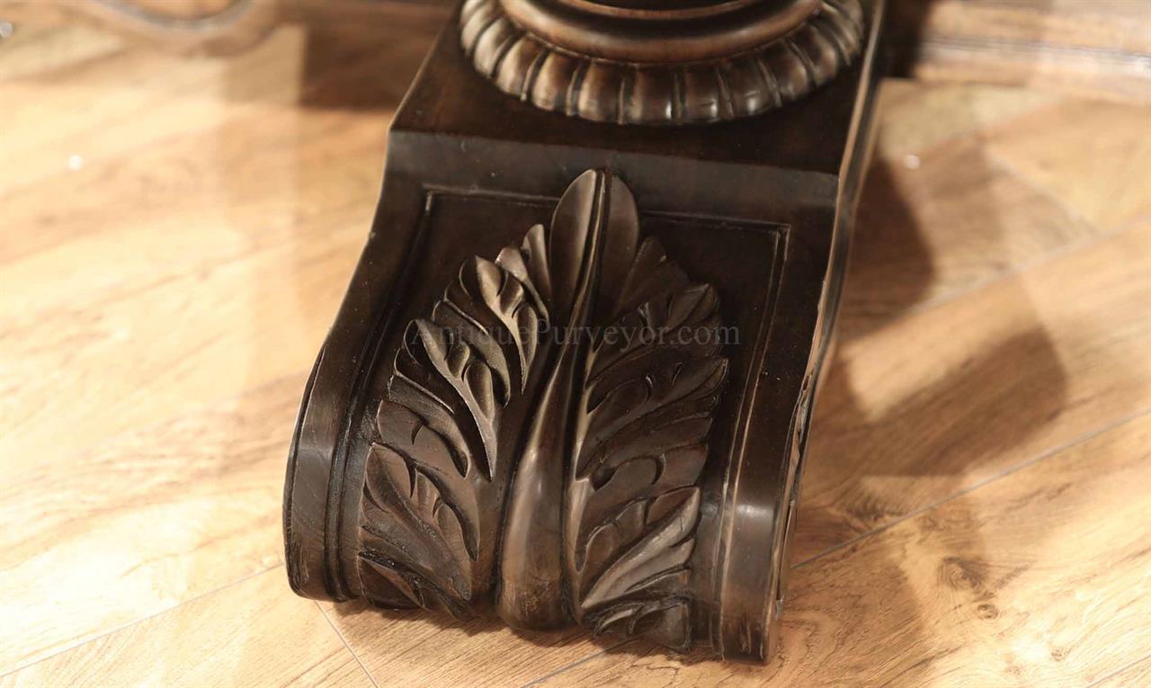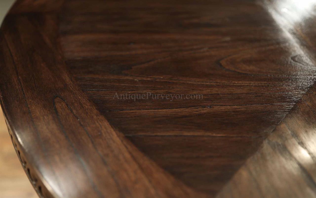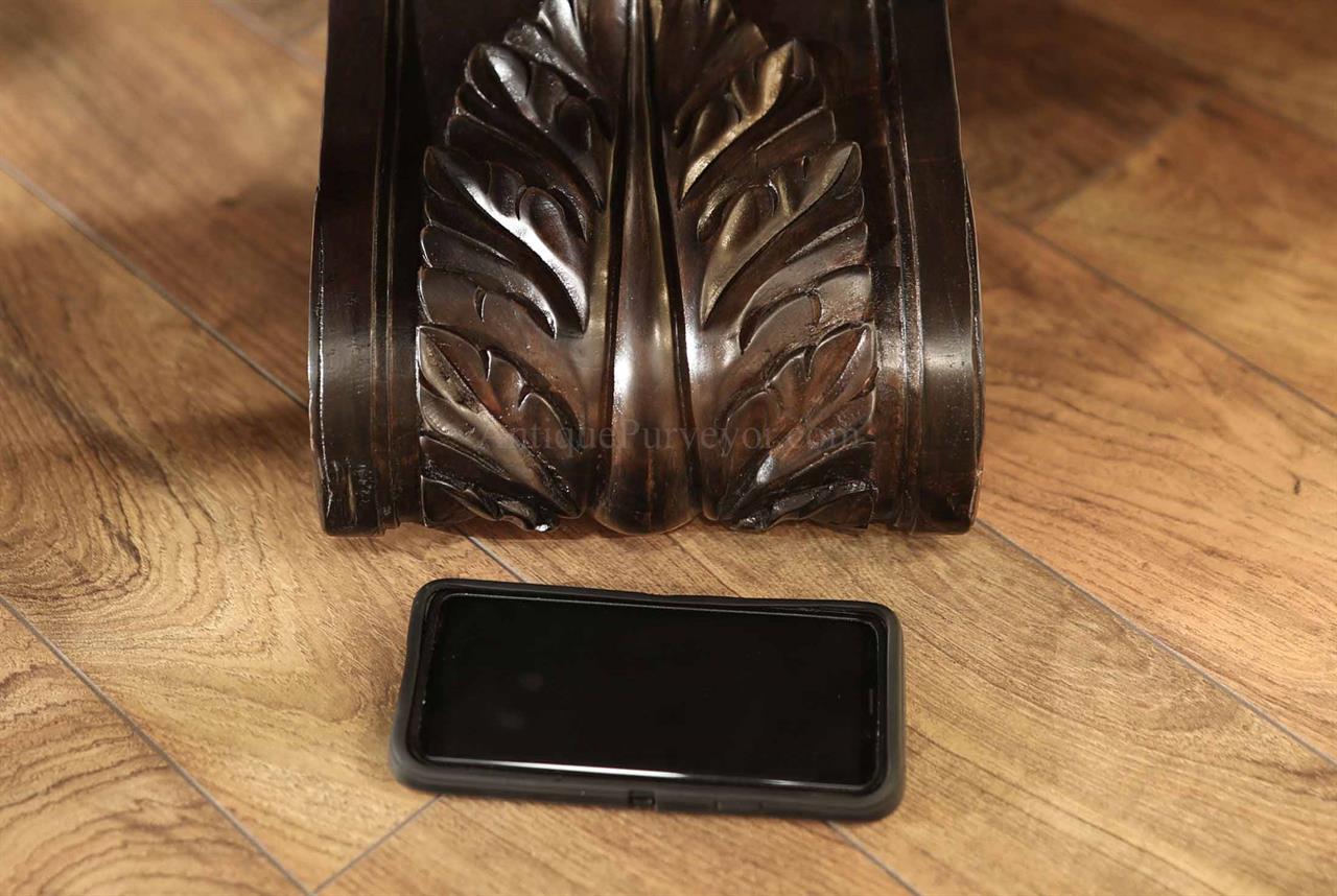 Large 86 inch round solid oak rustic dining table finished in rich walnut. Rustic and family proof casual finish. This is a heavy table and pedestal. The table and pedestal weigh 385 pounds. It is very sturdy. The edge of the table is carved with decorative shapes and the heavy rope turn pedestal columns are very significant. This table was photographed in our studio and the white particles you see in the pictures is dust. The finish is rich dark brown. Great table for a walnut dining space. The Lazy susan you see pictured with this table is available as a seperate purchase. It is not included in the sale of this item.