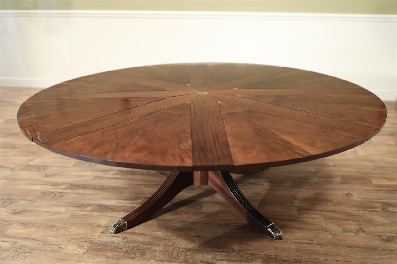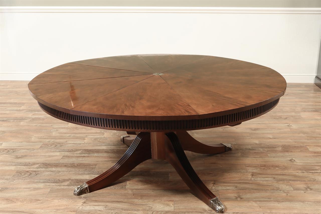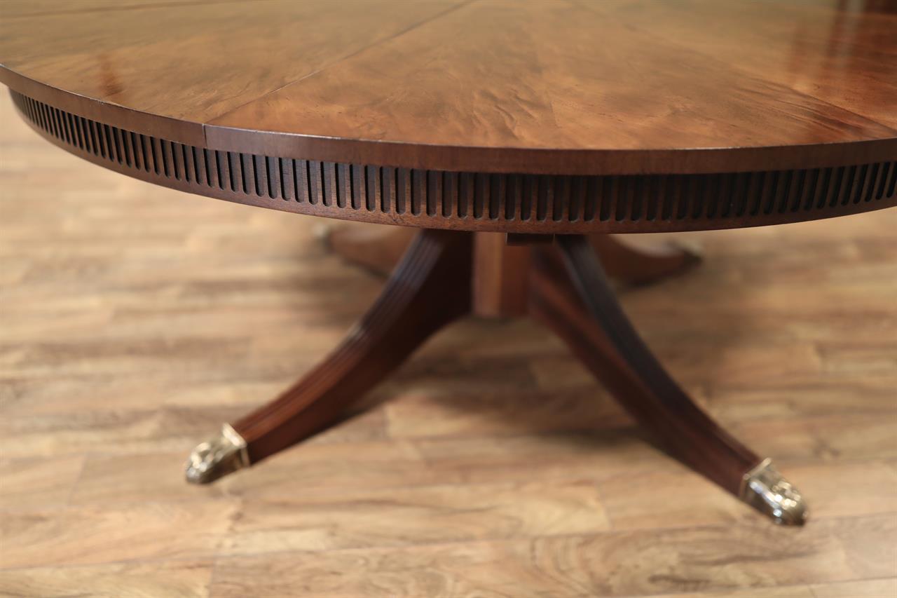 From the Baker website: “The Guinness William IV mahogany Capstan dining table, the sectioned swirl mahogany top with fluted frieze, extending with eight additional stripe mahogany leaves, by a mechanical turning action similar to a ship’s wheel; the massive fluted central baluster supported by four curved and fluted legs terminating in fine cart and gilded brass toes”