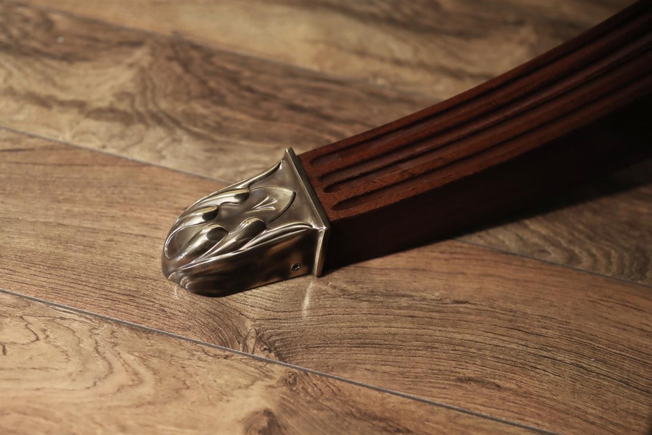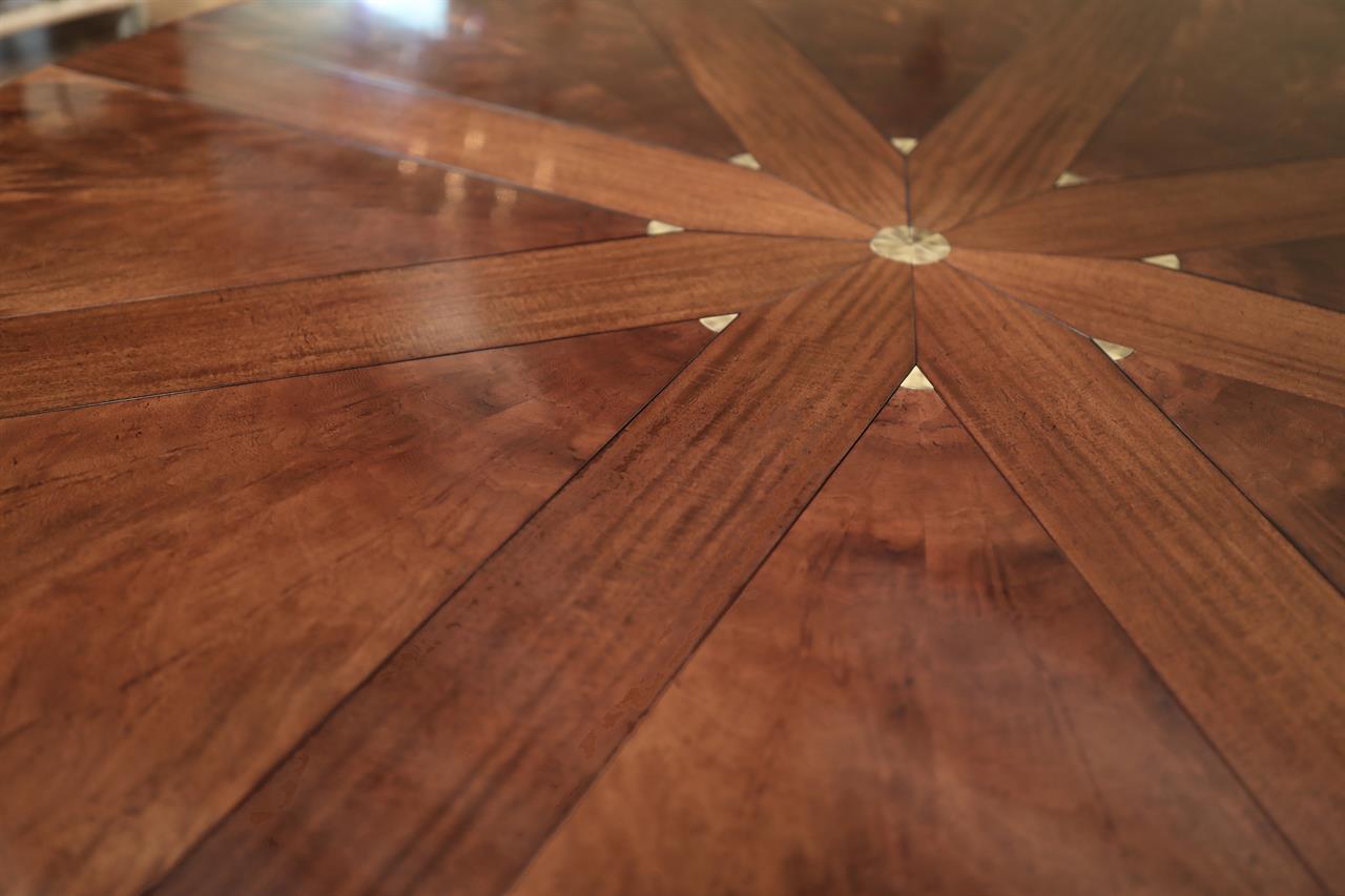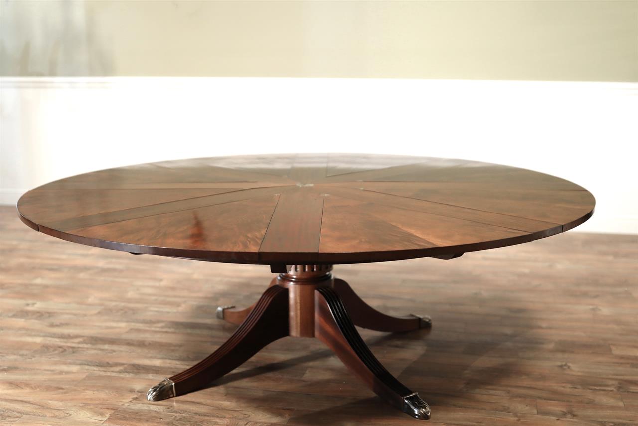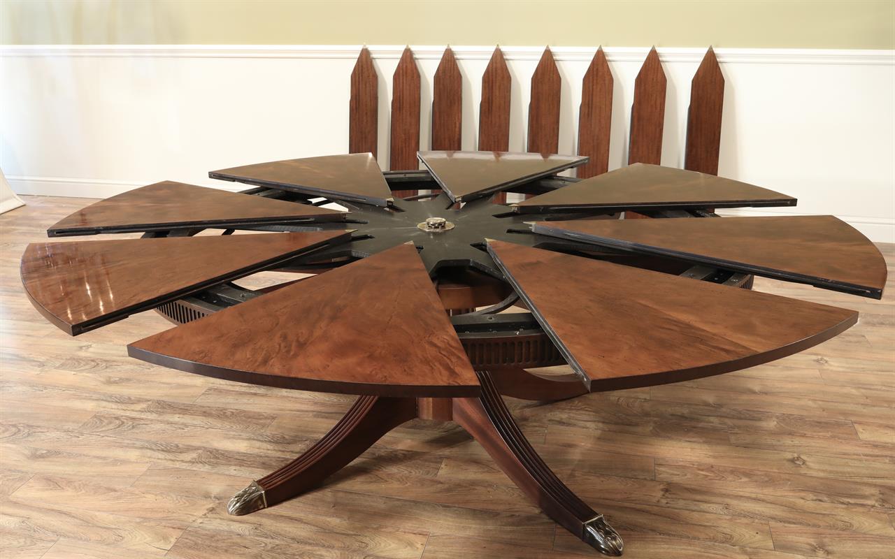From the Baker website: “The Guinness William IV mahogany Capstan dining table, the sectioned swirl mahogany top with fluted frieze, extending with eight additional stripe mahogany leaves, by a mechanical turning action similar to a ship’s wheel; the massive fluted central baluster supported by four curved and fluted legs terminating in fine cart and gilded brass toes”
