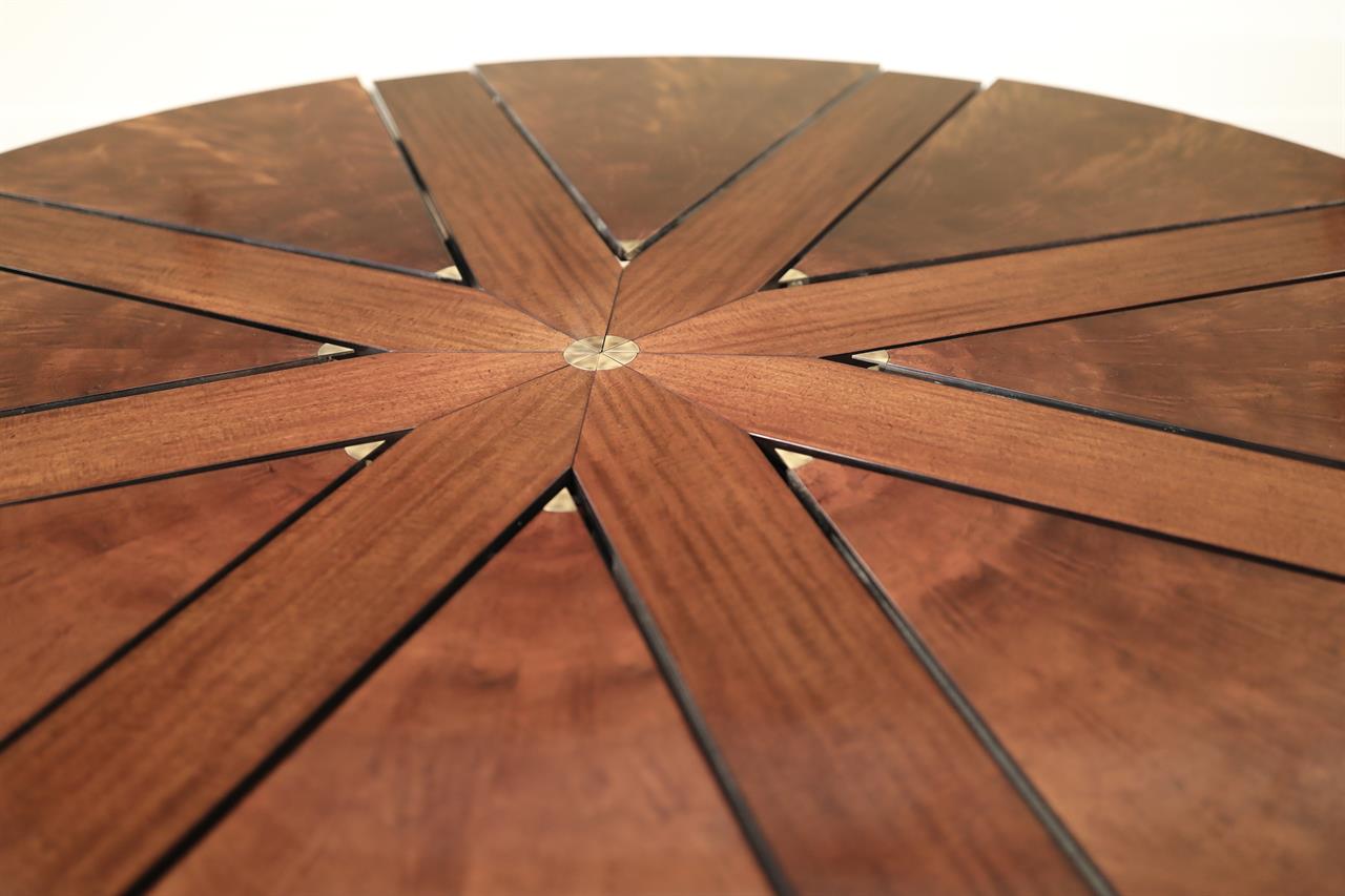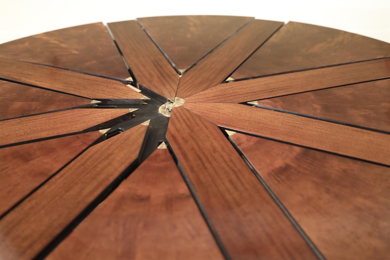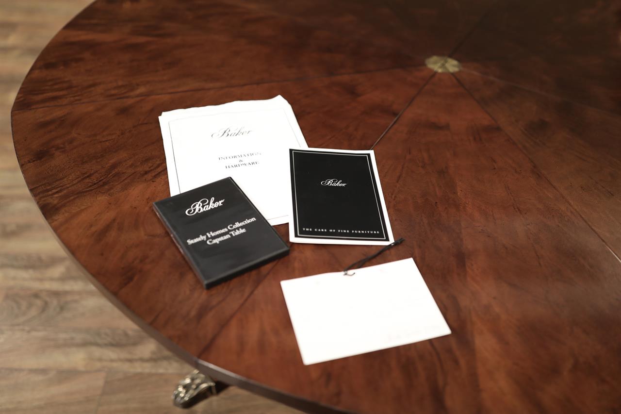 Shown on this product page is a genuine vintage restored Baker Furniture “Stately Homes” mahogany “Capstan” dining Jupe table that spins to open. The table has eight numbered leaves, starting with a 71-inch diameter, seating six comfortably. With more guests, this table spins open to reveal its full 88-inch diameter, seating 8-10. This preloved table was manufactured in 2007 and restored here at AntiquePurveyor. This exact table is sold, but we are reproducing this table with a modern factory. The new version is in progress and the leaves will be self-storing. We are also considering adding a leg to the pedestal to make the table more robust and capable of handling heavier traffic. There will be other subtle differences, but the style will be very much the same.