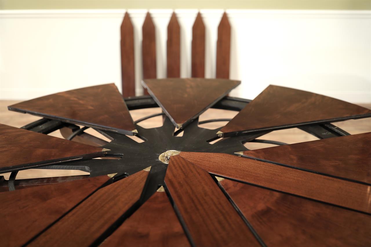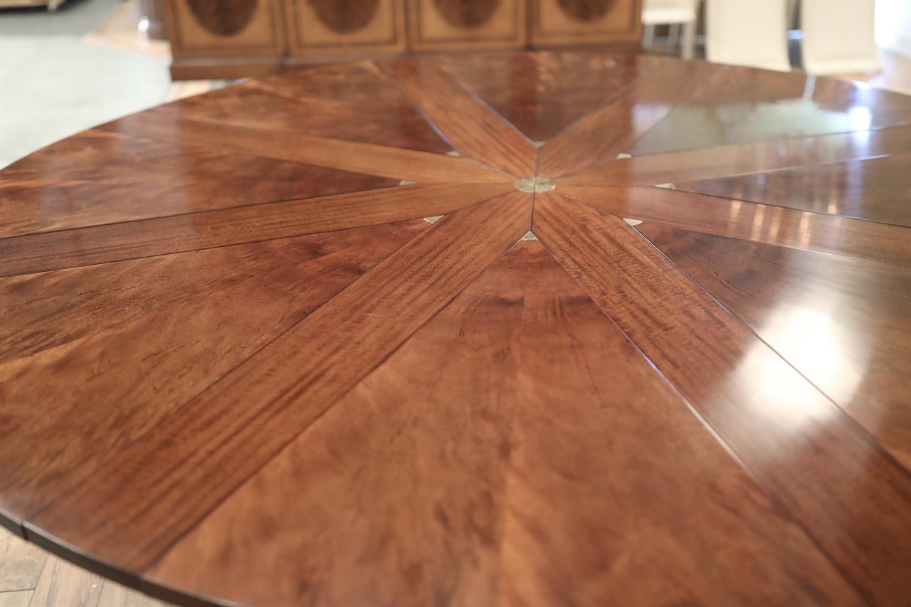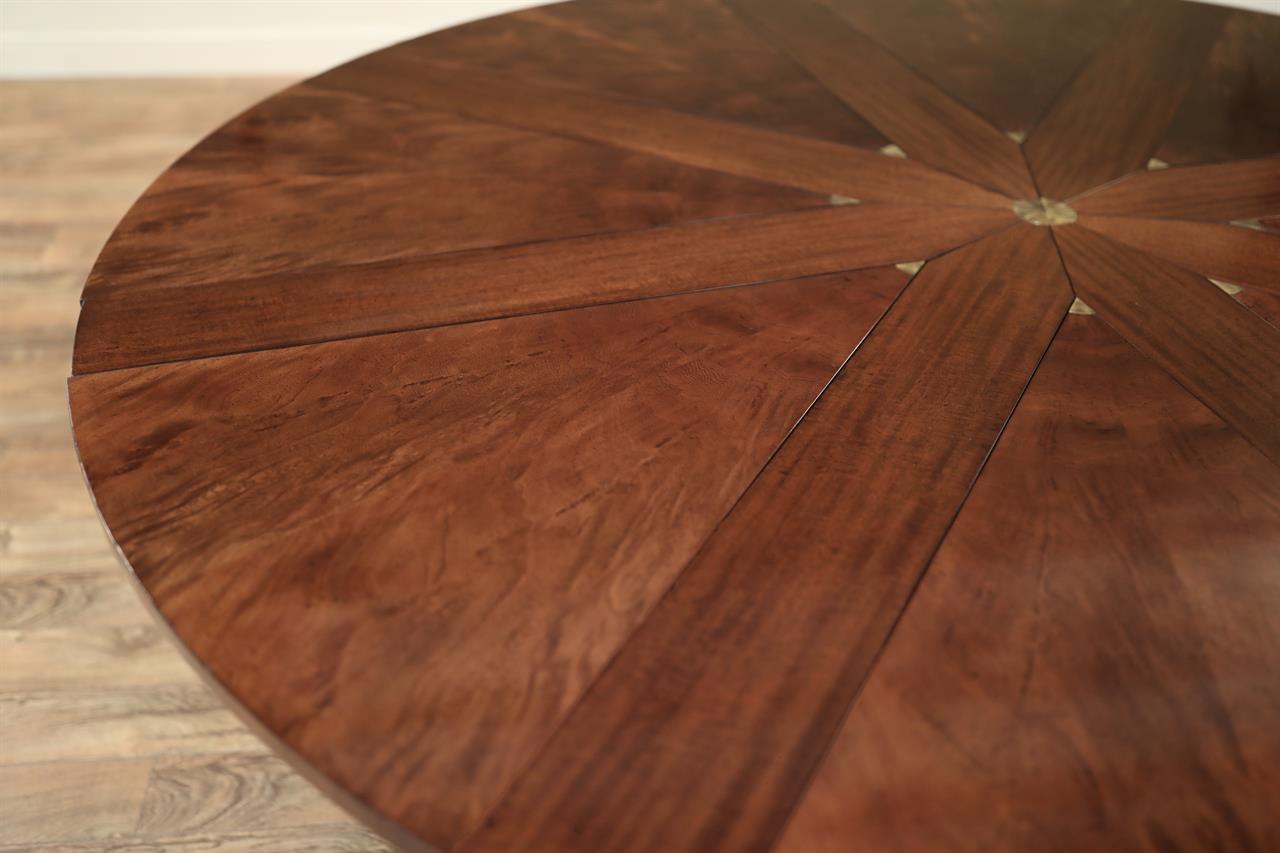 Shown on this product page is a genuine vintage restored Baker Furniture “Stately Homes” mahogany “Capstan” dining Jupe table that spins to open. The table has eight numbered leaves, starting with a 71-inch diameter, seating six comfortably. With more guests, this table spins open to reveal its full 88-inch diameter, seating 8-10. This preloved table was manufactured in 2007 and restored here at AntiquePurveyor. This exact table is sold, but we are reproducing this table with a modern factory. The new version is in progress and the leaves will be self-storing. We are also considering adding a leg to the pedestal to make the table more robust and capable of handling heavier traffic. There will be other subtle differences, but the style will be very much the same.