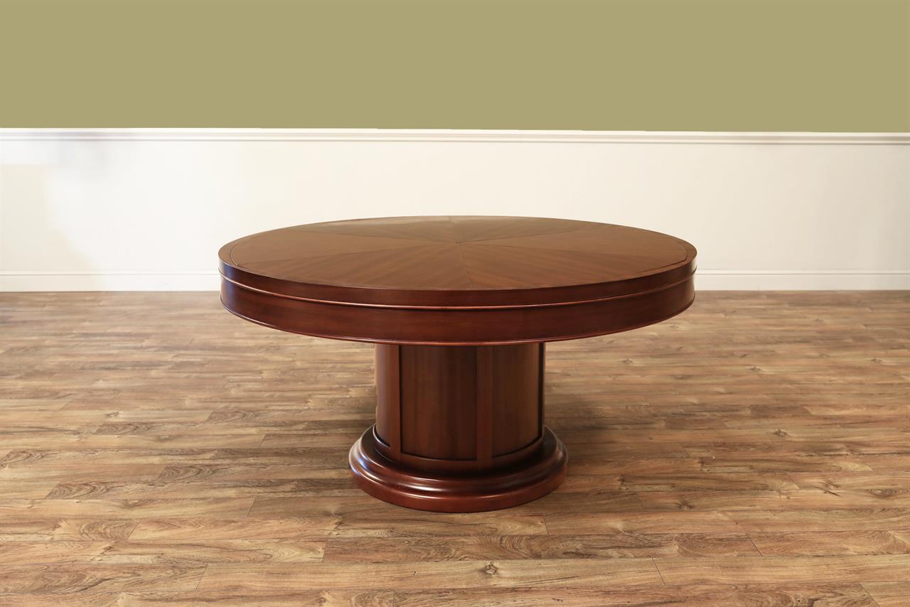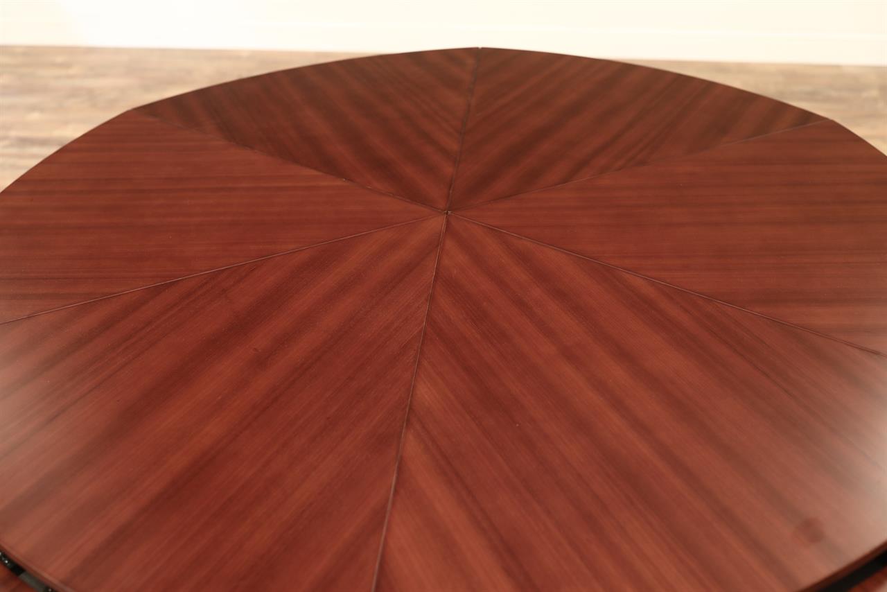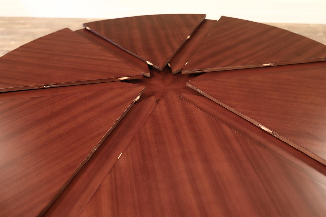 Mahogany Capstan table with self-storing leaves. A fully automatic Jupe table with self-deploying leaves. A colonial-style Capstan table or Radial table with a circular pedestal and raised panels. Great conference room table or dining room table. This table can be used at 61-inches round or it can be opened to 78-inches round. A round-to-round dining table with self-storing leaves.