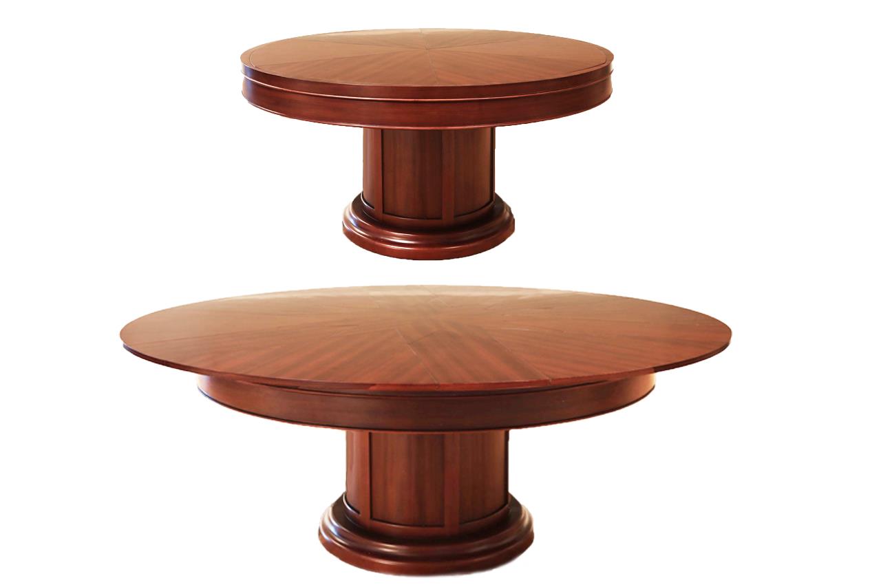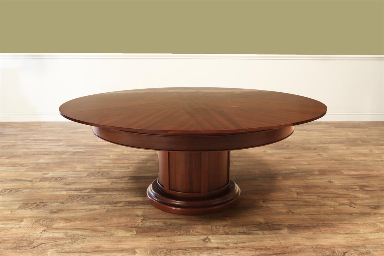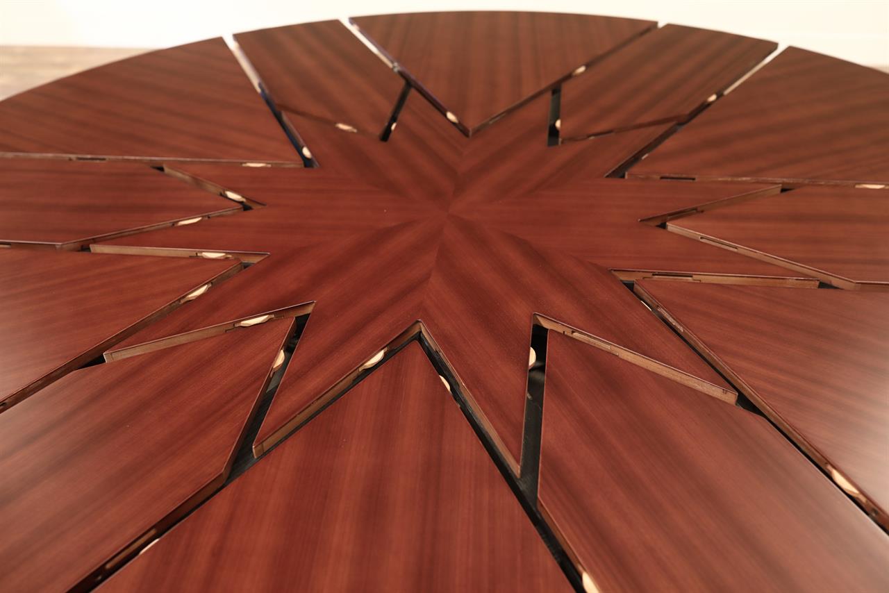 Mahogany Capstan table with self-storing leaves. A fully automatic Jupe table with self-deploying leaves. A colonial-style Capstan table or Radial table with a circular pedestal and raised panels. Great conference room table or dining room table. This table can be used at 61-inches round or it can be opened to 78-inches round. A round-to-round dining table with self-storing leaves.