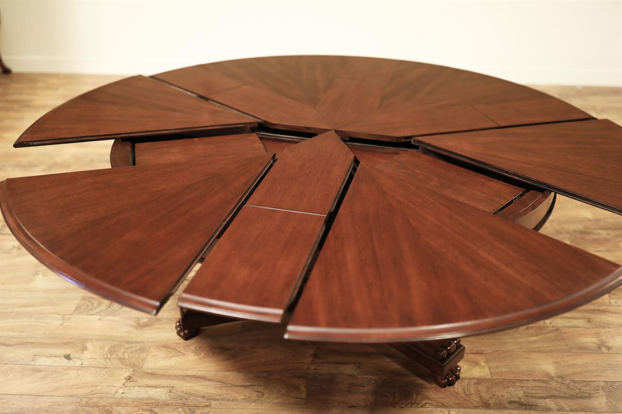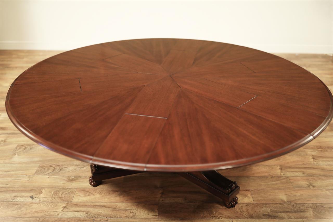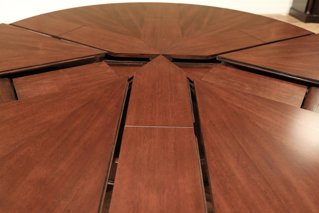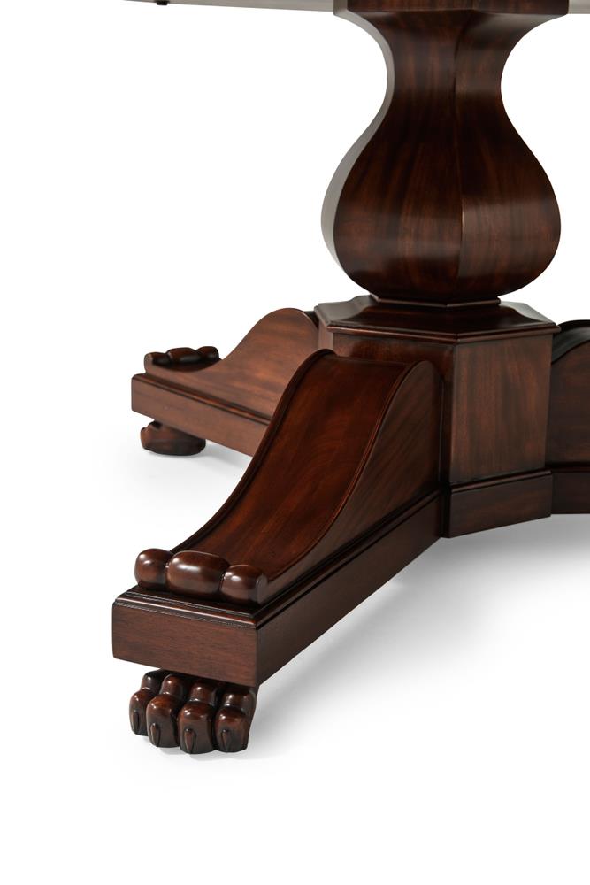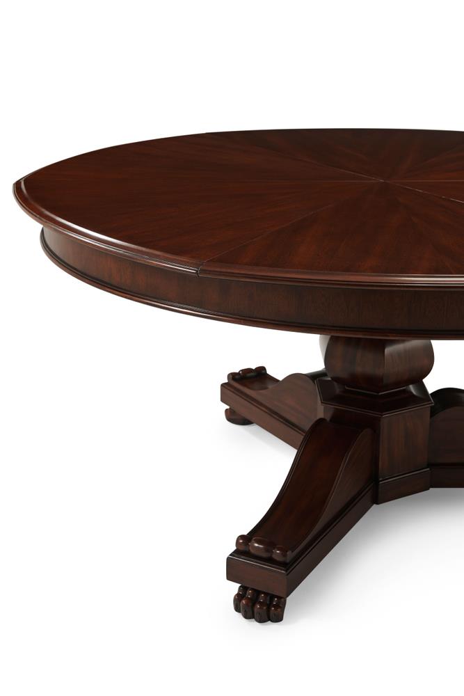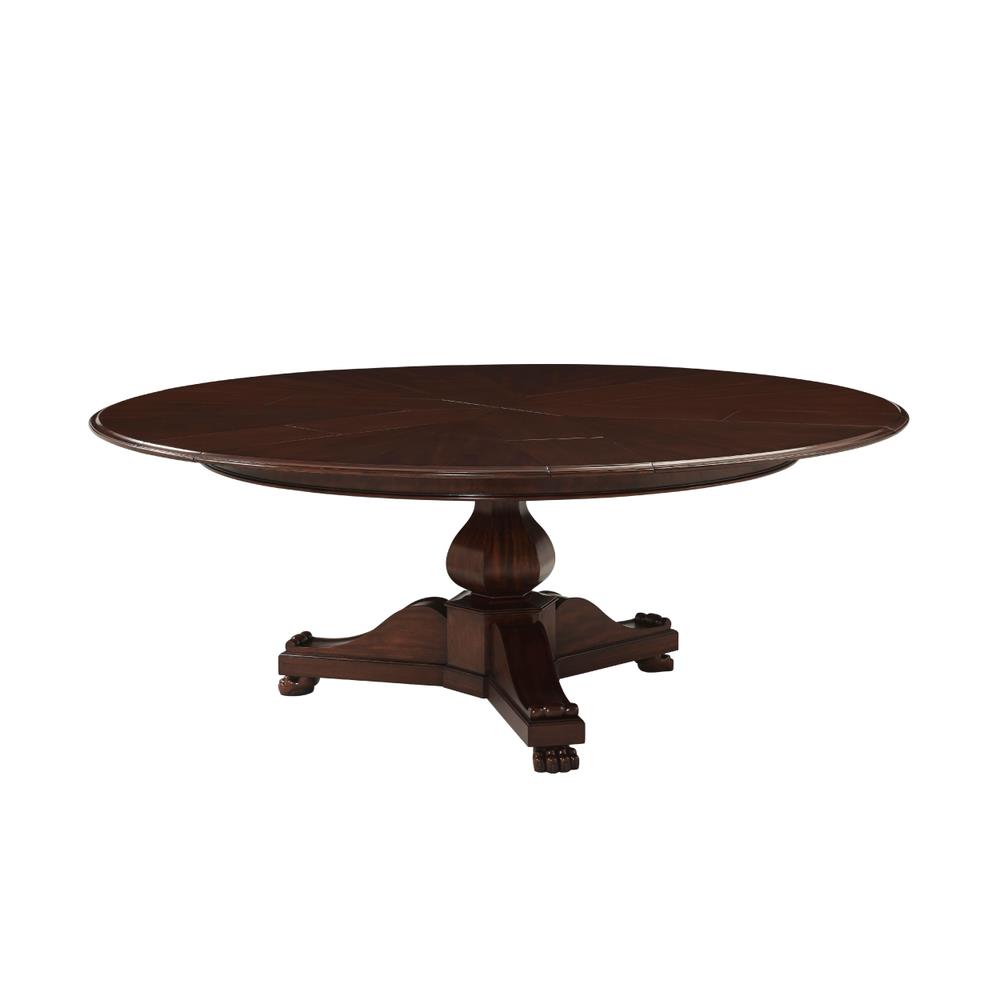 This Jupe dining table is manufactured by Theodore Alexander featuring a restauration revival form with a radiating veneer top and a carved central pedestal. The table presents a strong circular profile designed to expand through inset fold-out leaves that remain self-stored within the structure. Its architectural composition combines the visual symmetry of a round top with a more sculptural classical base treatment. The top is detailed with radiating veneer work that emphasizes the circular geometry of the table surface. The expansion system is built with self-storing leaves, allowing the table to extend while maintaining an integrated and orderly construction. Beneath the top, the table is supported by a carved pedestal that transitions into a scrolled tri-base ending in claw feet, reinforcing the revival character of the design. The combination of the radiating veneered top, inset leaf construction, and carved pedestal base gives the table a formal presence suited for traditional dining interiors. The overall result is a round expanding dining table with strong period influence and a mechanically integrated extension system.