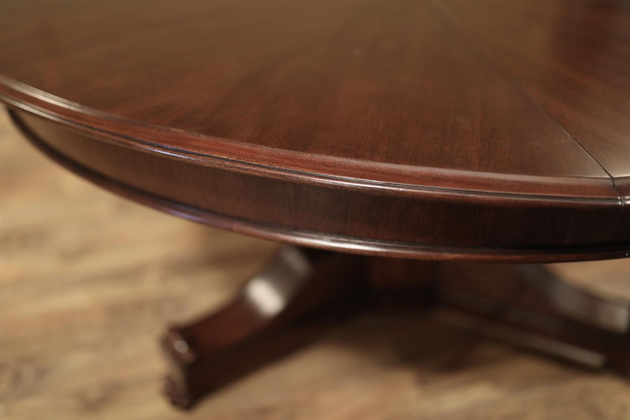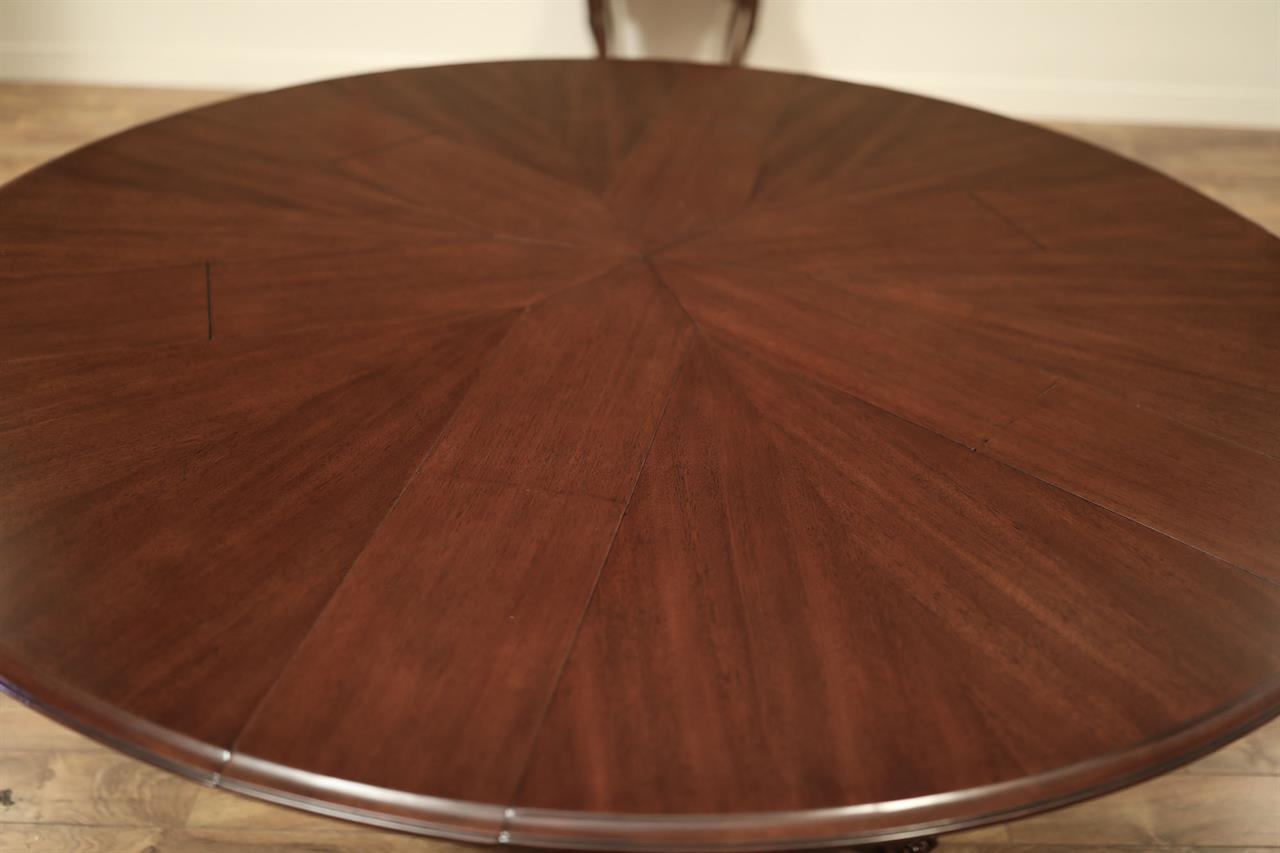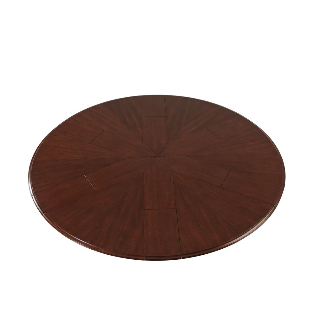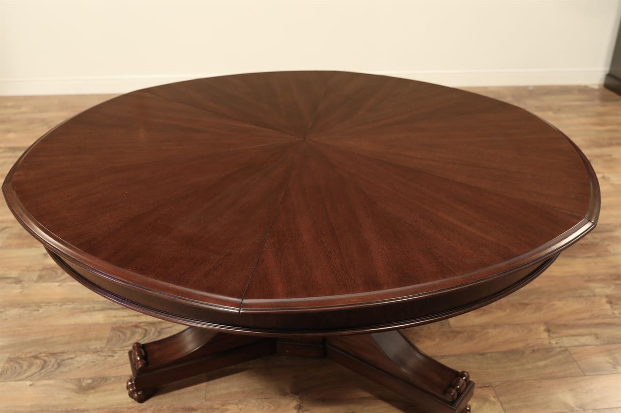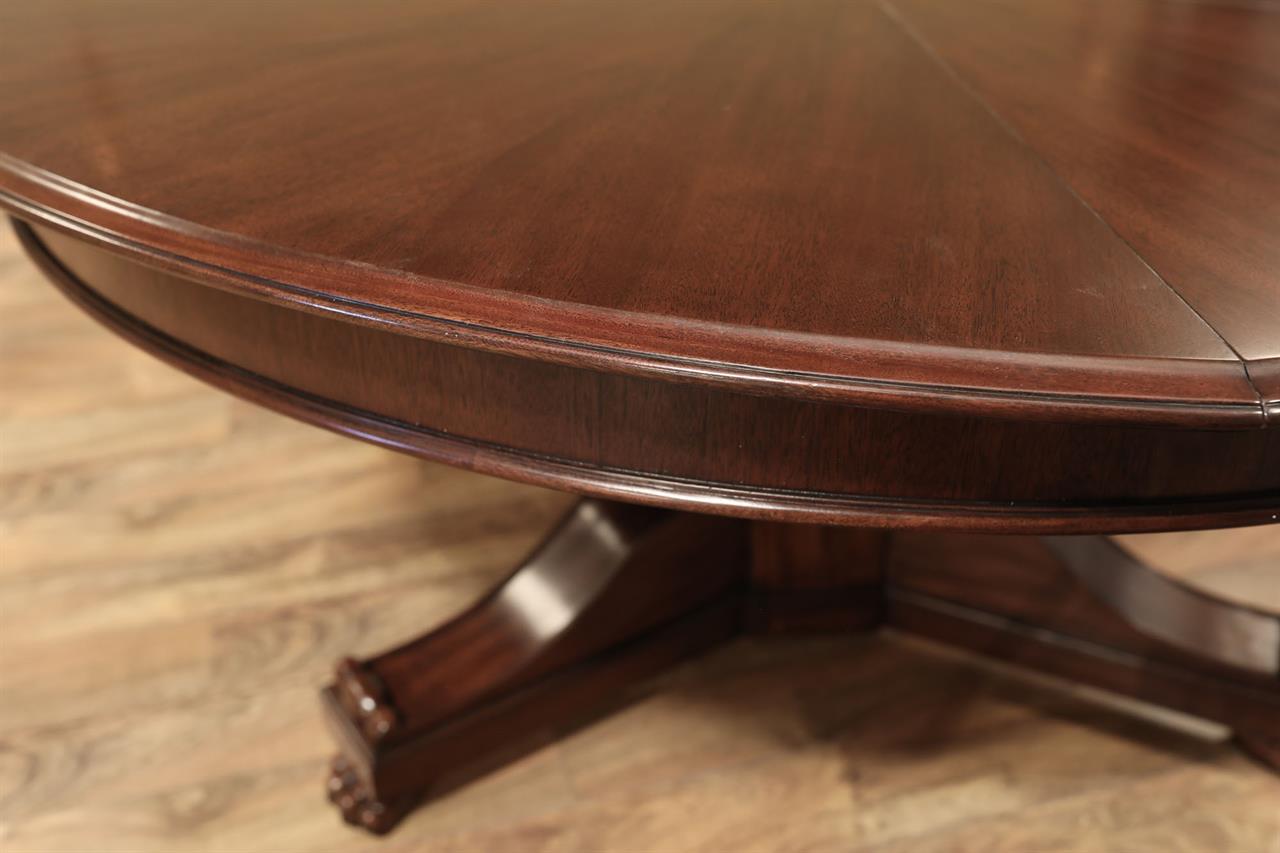 This Jupe dining table is manufactured by Theodore Alexander featuring a restauration revival form with a radiating veneer top and a carved central pedestal. The table presents a strong circular profile designed to expand through inset fold-out leaves that remain self-stored within the structure. Its architectural composition combines the visual symmetry of a round top with a more sculptural classical base treatment. The top is detailed with radiating veneer work that emphasizes the circular geometry of the table surface. The expansion system is built with self-storing leaves, allowing the table to extend while maintaining an integrated and orderly construction. Beneath the top, the table is supported by a carved pedestal that transitions into a scrolled tri-base ending in claw feet, reinforcing the revival character of the design. The combination of the radiating veneered top, inset leaf construction, and carved pedestal base gives the table a formal presence suited for traditional dining interiors. The overall result is a round expanding dining table with strong period influence and a mechanically integrated extension system.