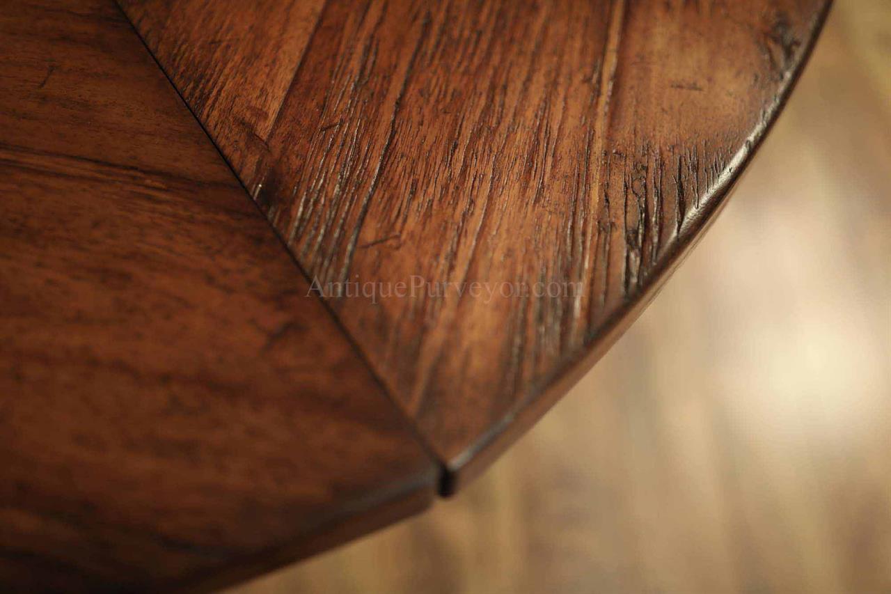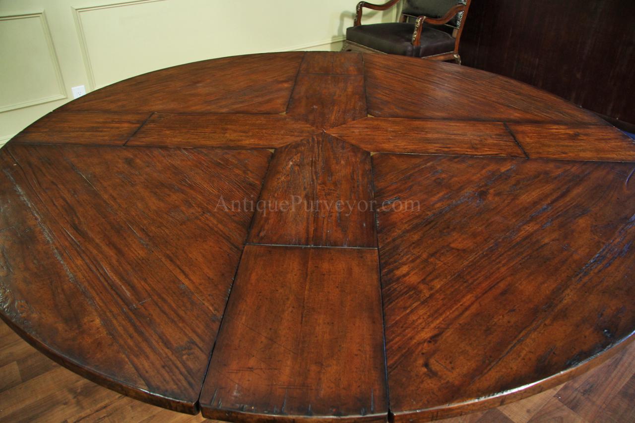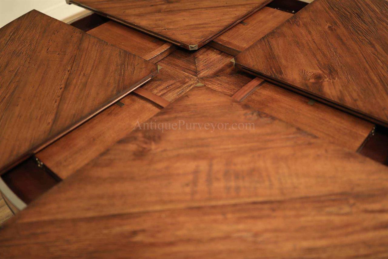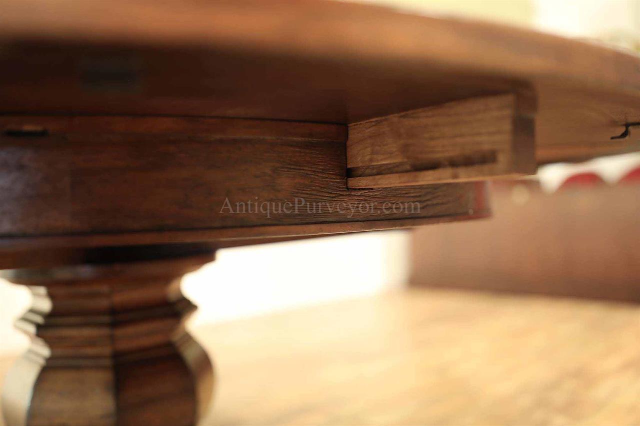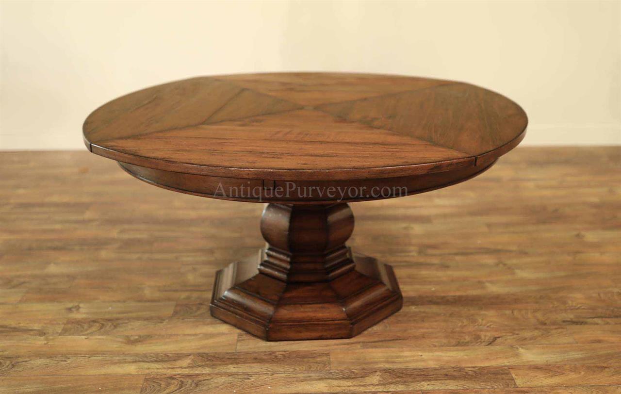 Home » Catalog » 59 to 74 inch round to round county style table with factory distressing and hidden leaves. Round pedestal dining table or kitchen table.