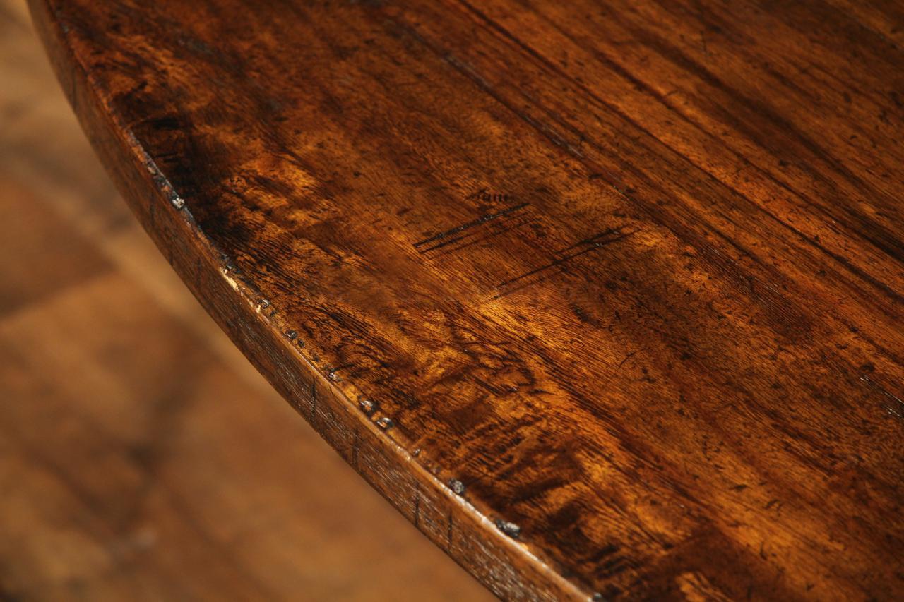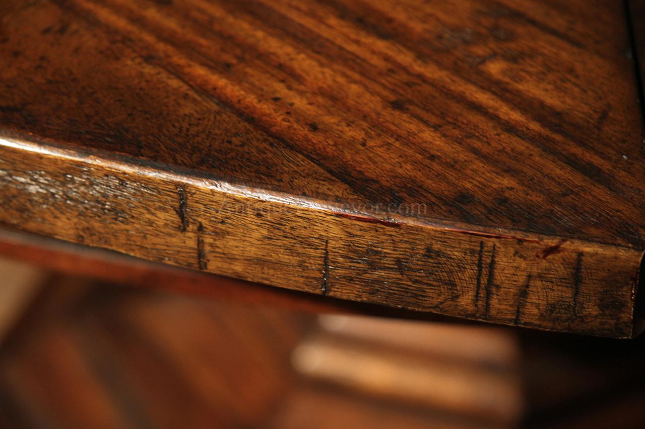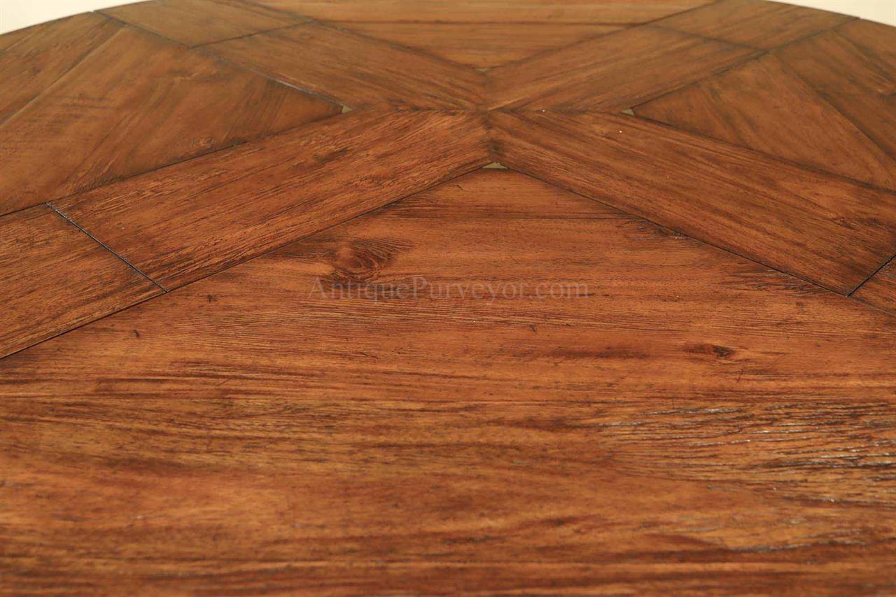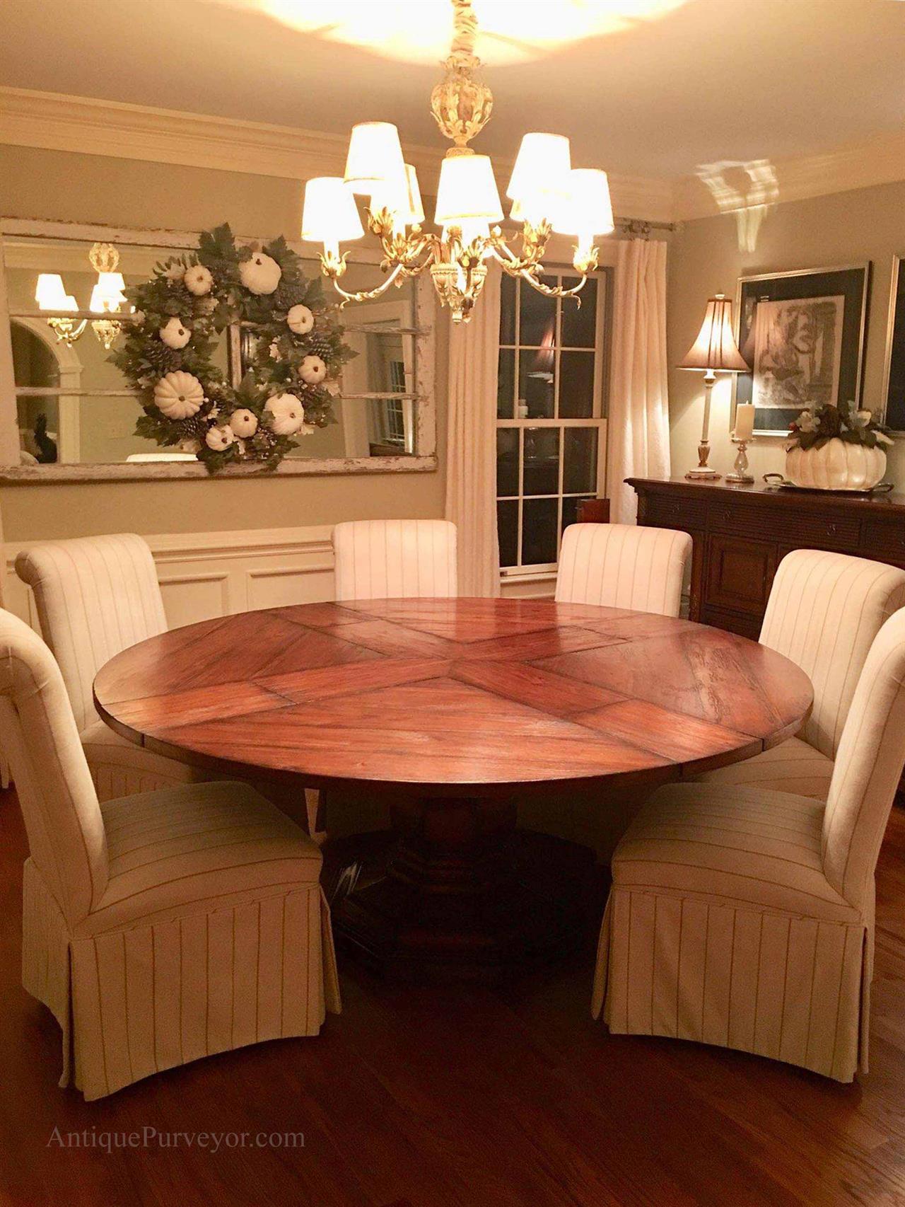 Home » Catalog » 59 to 74 inch round to round county style table with factory distressing and hidden leaves. Round pedestal dining table or kitchen table.