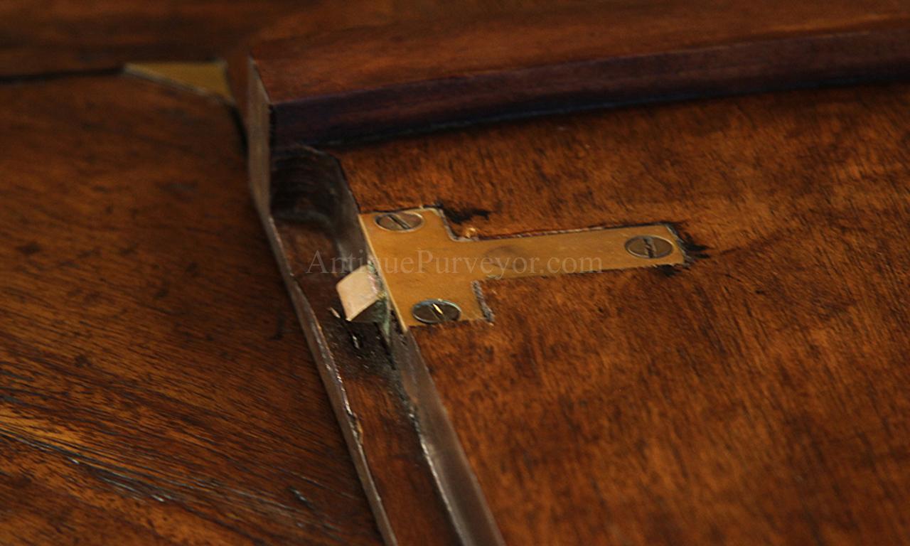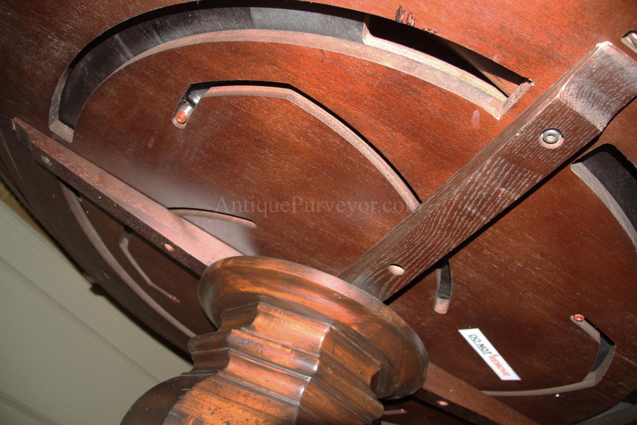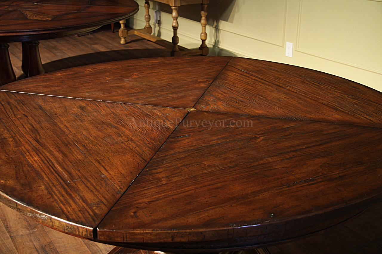 Round extending dining table presenting a traditional circular form with an integrated extension system designed to increase the dining surface when required. The table is crafted in figured walnut that highlights the natural grain variation and decorative veneer work characteristic of classical dining furniture. The circular tabletop is designed with an extension mechanism that allows the table to expand to accommodate additional seating while maintaining the balanced proportions of the round form when closed. The veneered surface is framed with subtle banding that emphasizes the geometry of the top and provides a visual border to the figured walnut field.