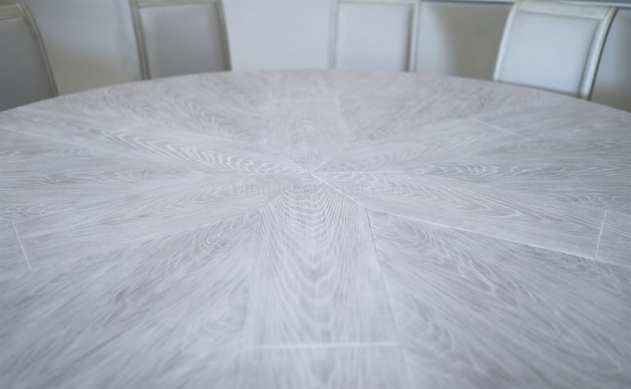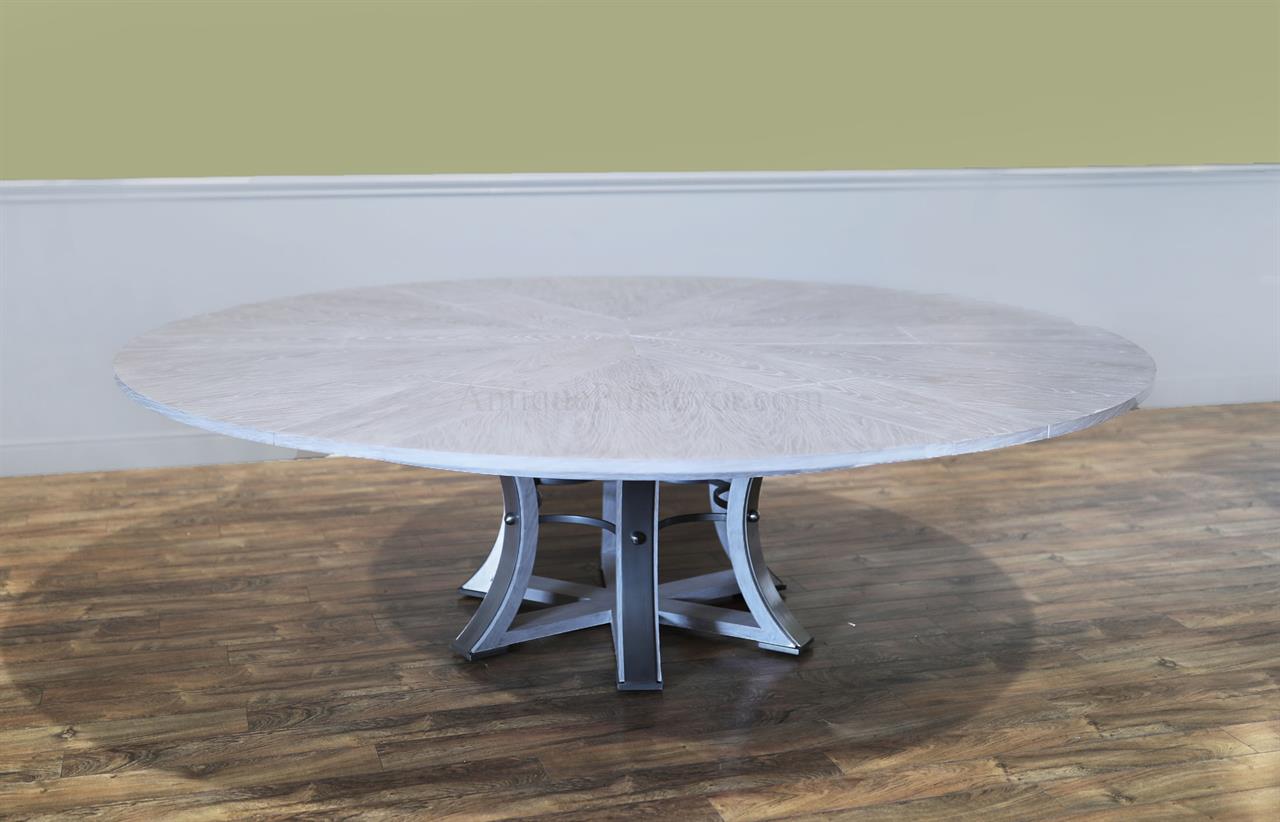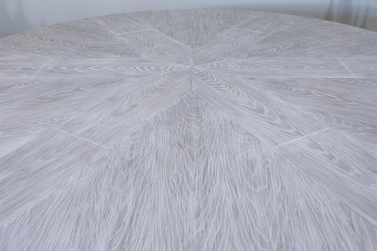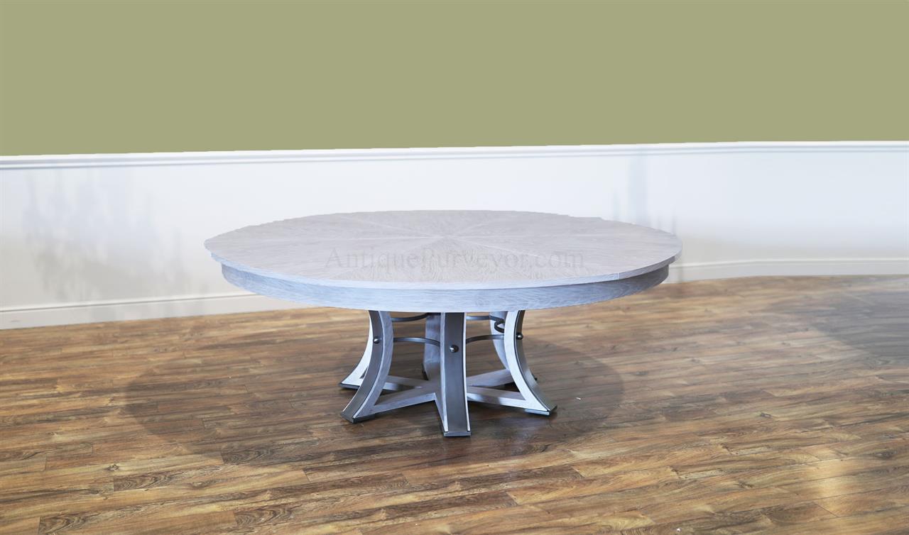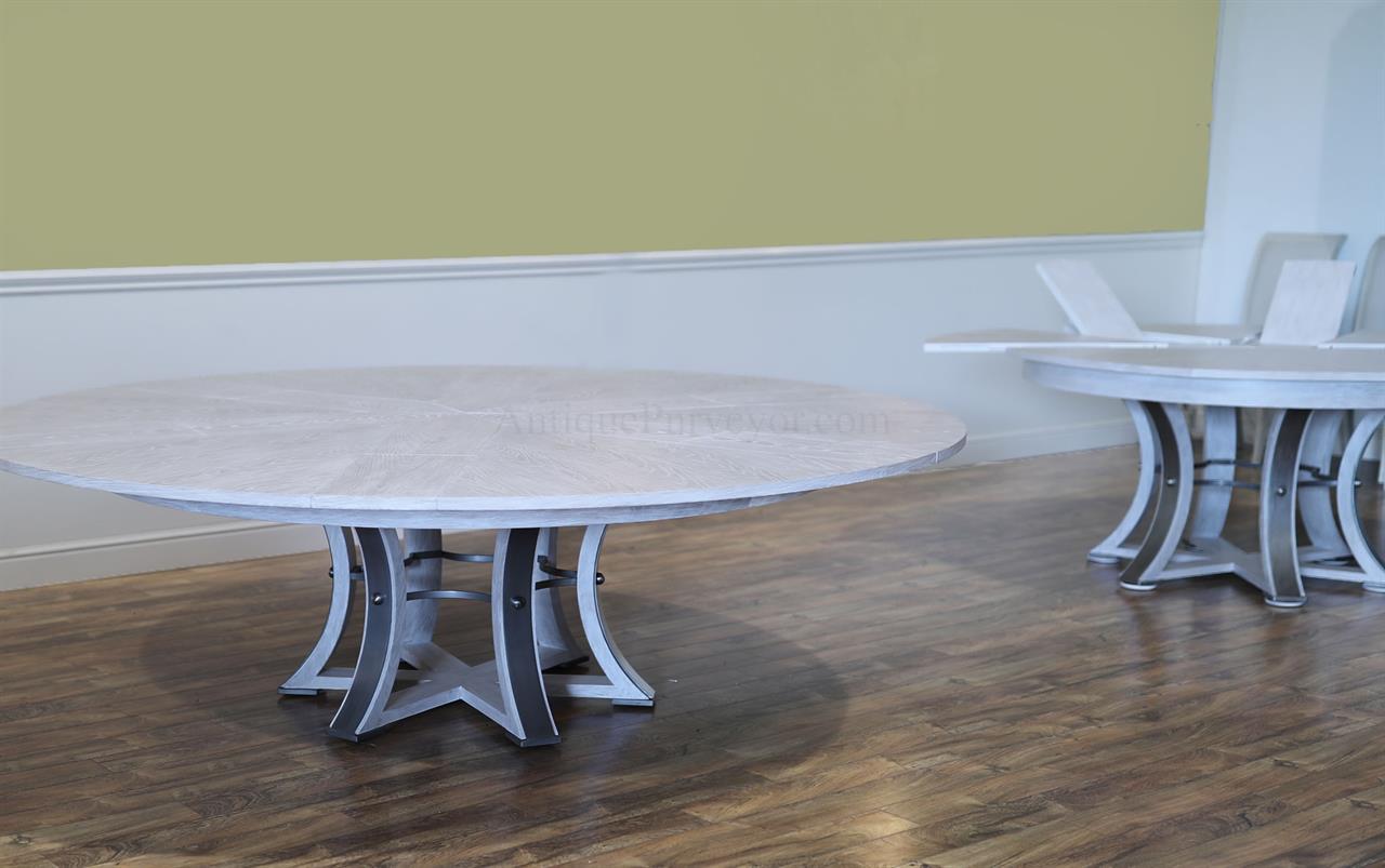 This round-to-round expandable dining table is finished in a white pigmented oak tone, an AP Exclusive by AntiquePurveyor. The table expands from 82 to 100 inches in diameter using self-storing leaves and seats 6 to 12 people, depending on configuration. The base incorporates an outswept saber-leg pedestal reinforced with hammered iron. The extension mechanism is integrated within the table structure. The table is offered in the gray oak finish as specified on this product page.