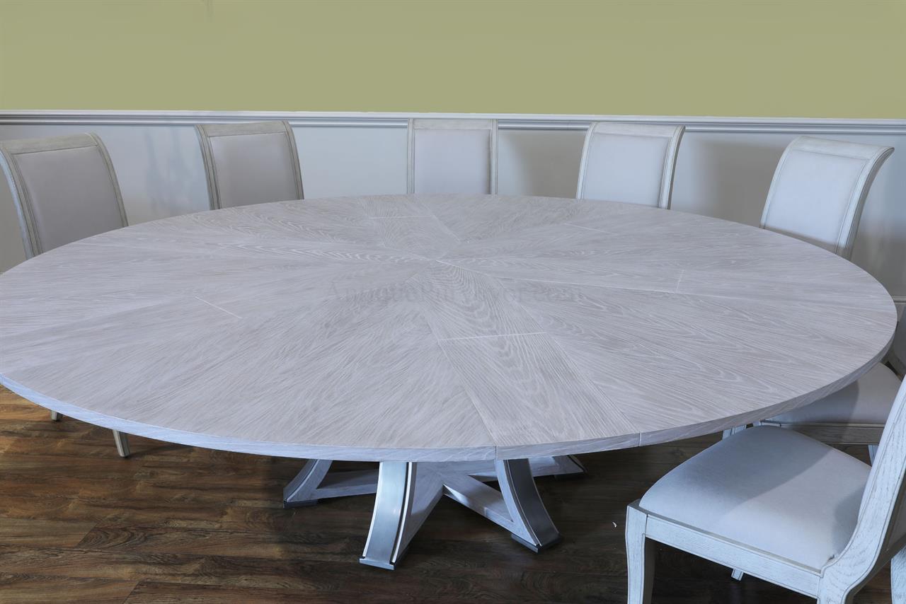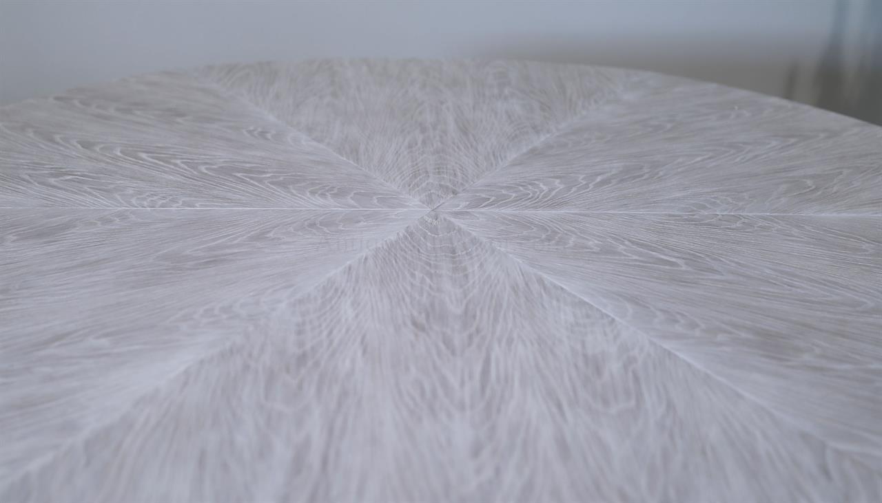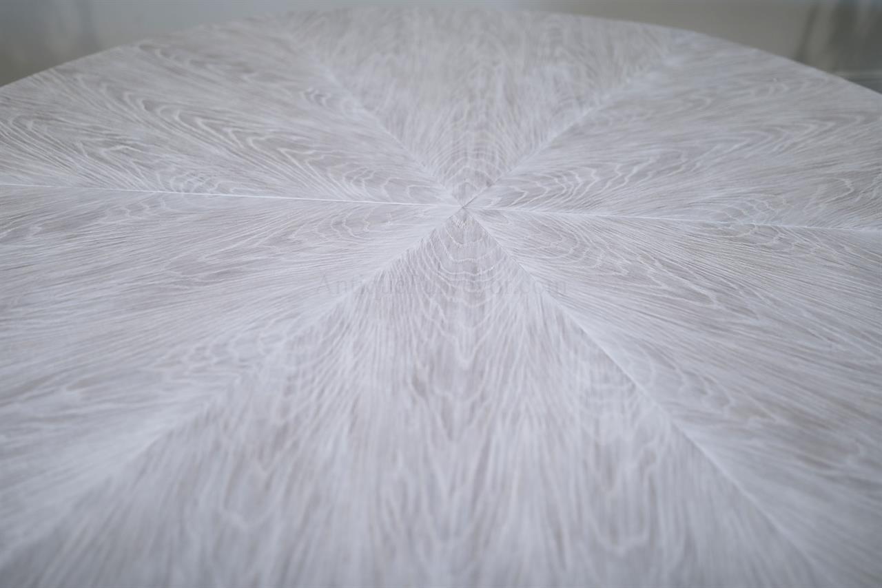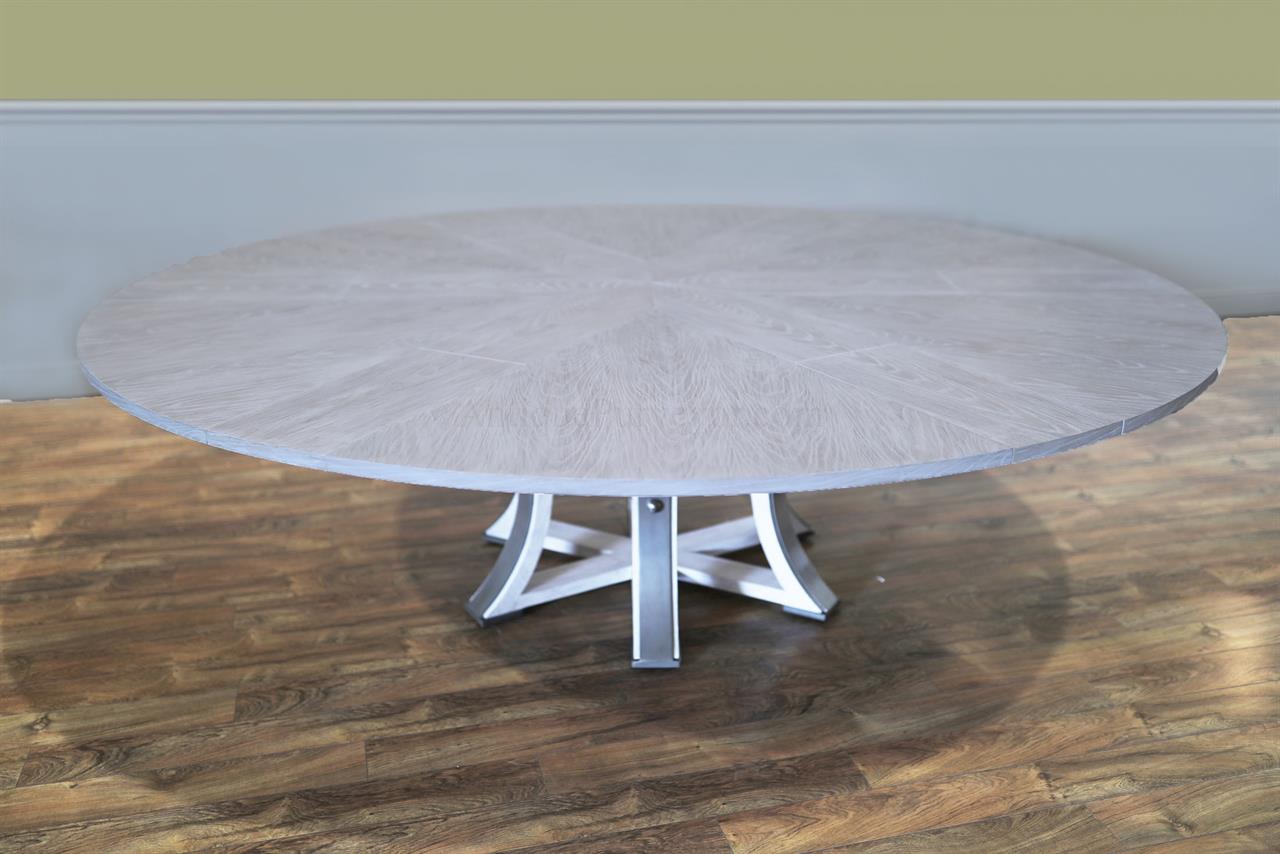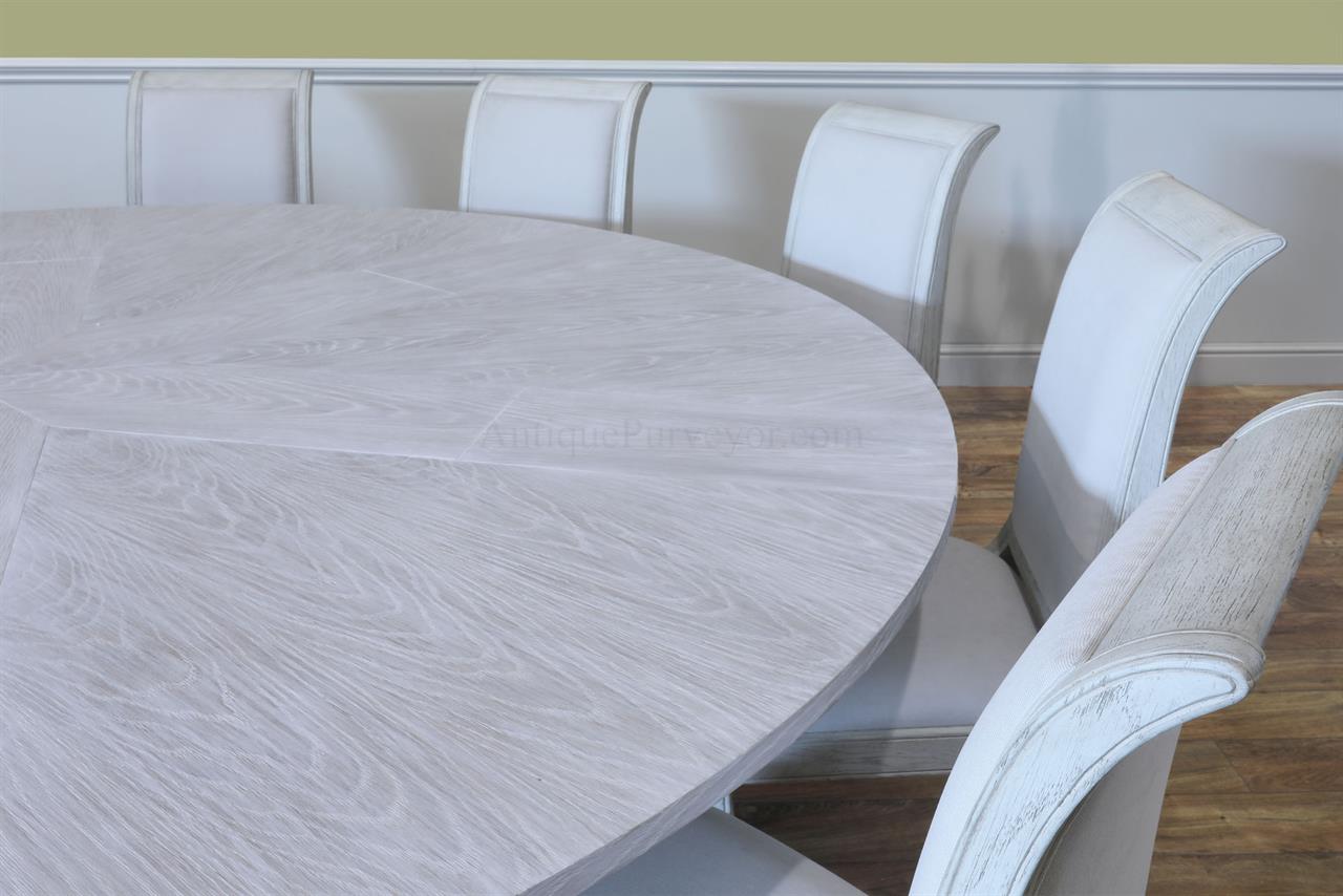 This round-to-round expandable dining table is finished in a white pigmented oak tone, an AP Exclusive by AntiquePurveyor. The table expands from 82 to 100 inches in diameter using self-storing leaves and seats 6 to 12 people, depending on configuration. The base incorporates an outswept saber-leg pedestal reinforced with hammered iron. The extension mechanism is integrated within the table structure. The table is offered in the gray oak finish as specified on this product page.