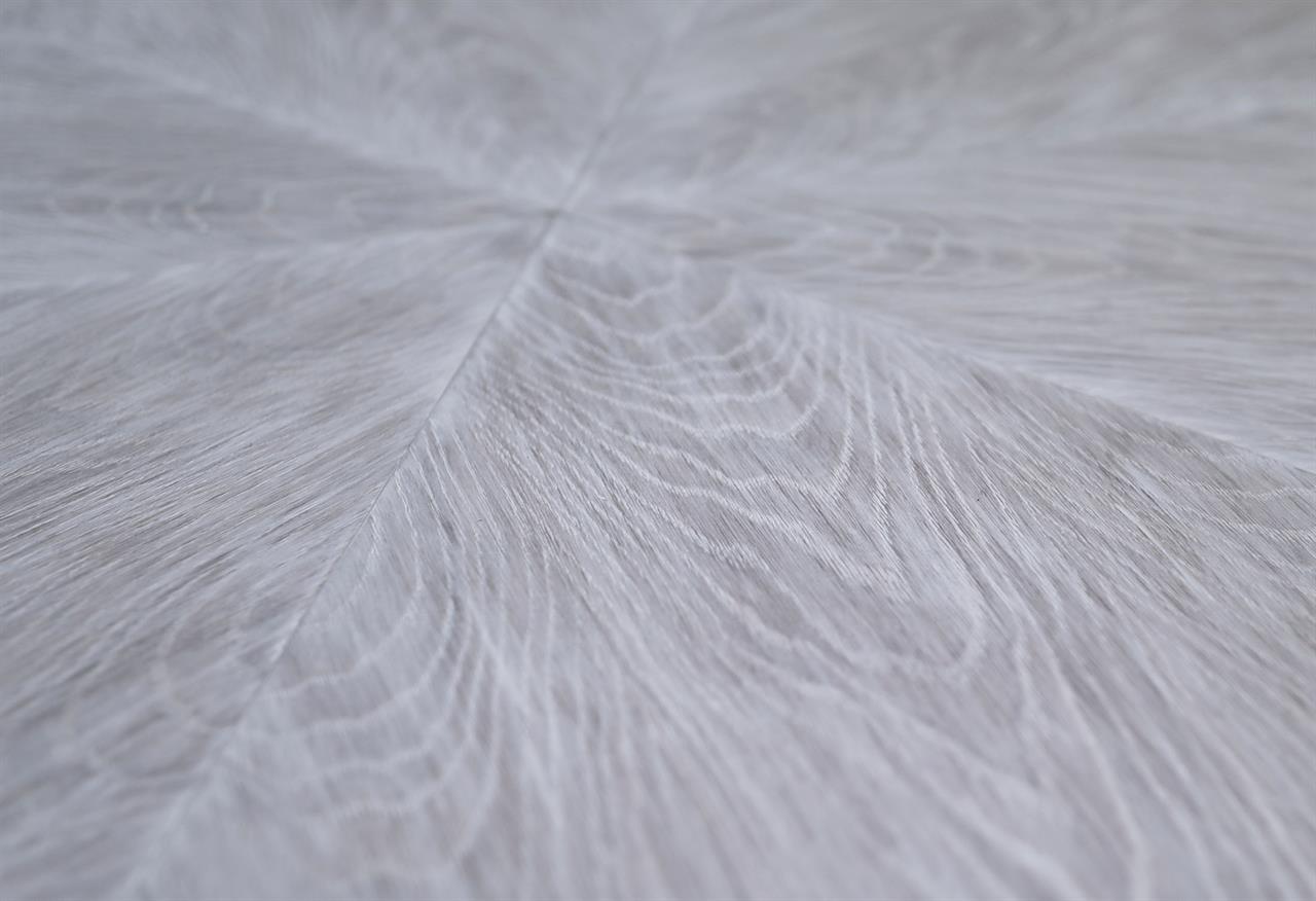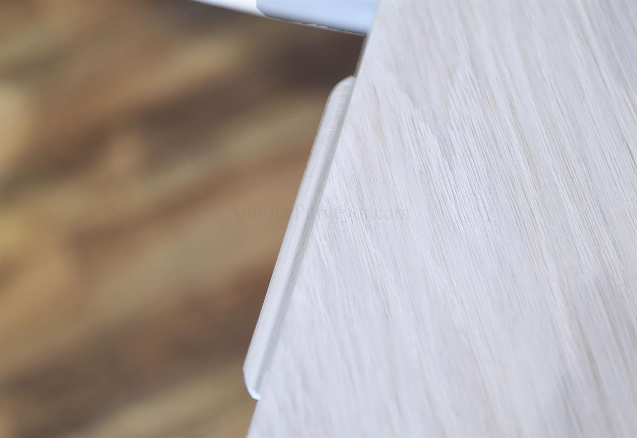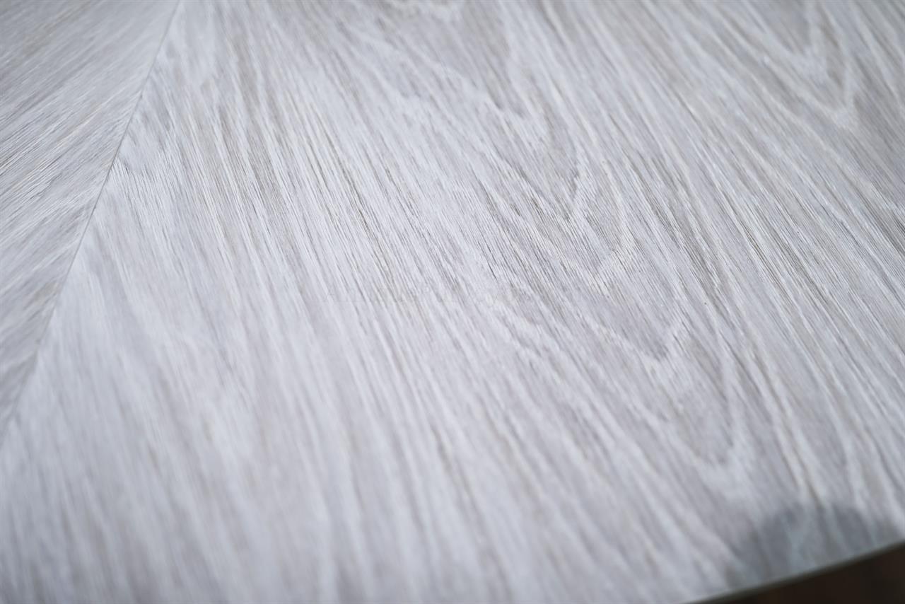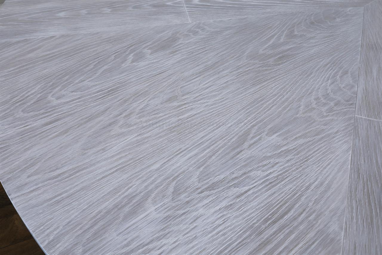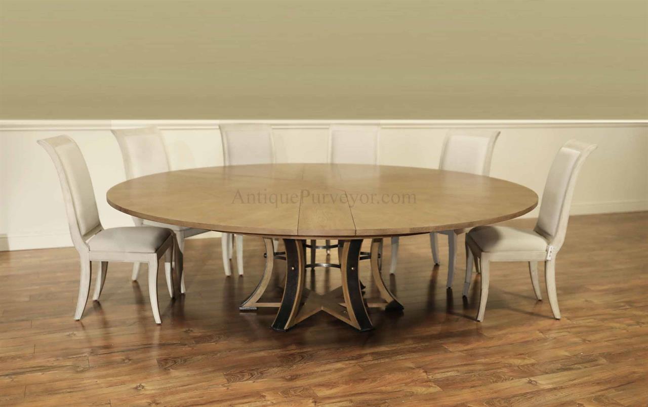 This round-to-round expandable dining table is finished in a white pigmented oak tone, an AP Exclusive by AntiquePurveyor. The table expands from 82 to 100 inches in diameter using self-storing leaves and seats 6 to 12 people, depending on configuration. The base incorporates an outswept saber-leg pedestal reinforced with hammered iron. The extension mechanism is integrated within the table structure. The table is offered in the gray oak finish as specified on this product page.